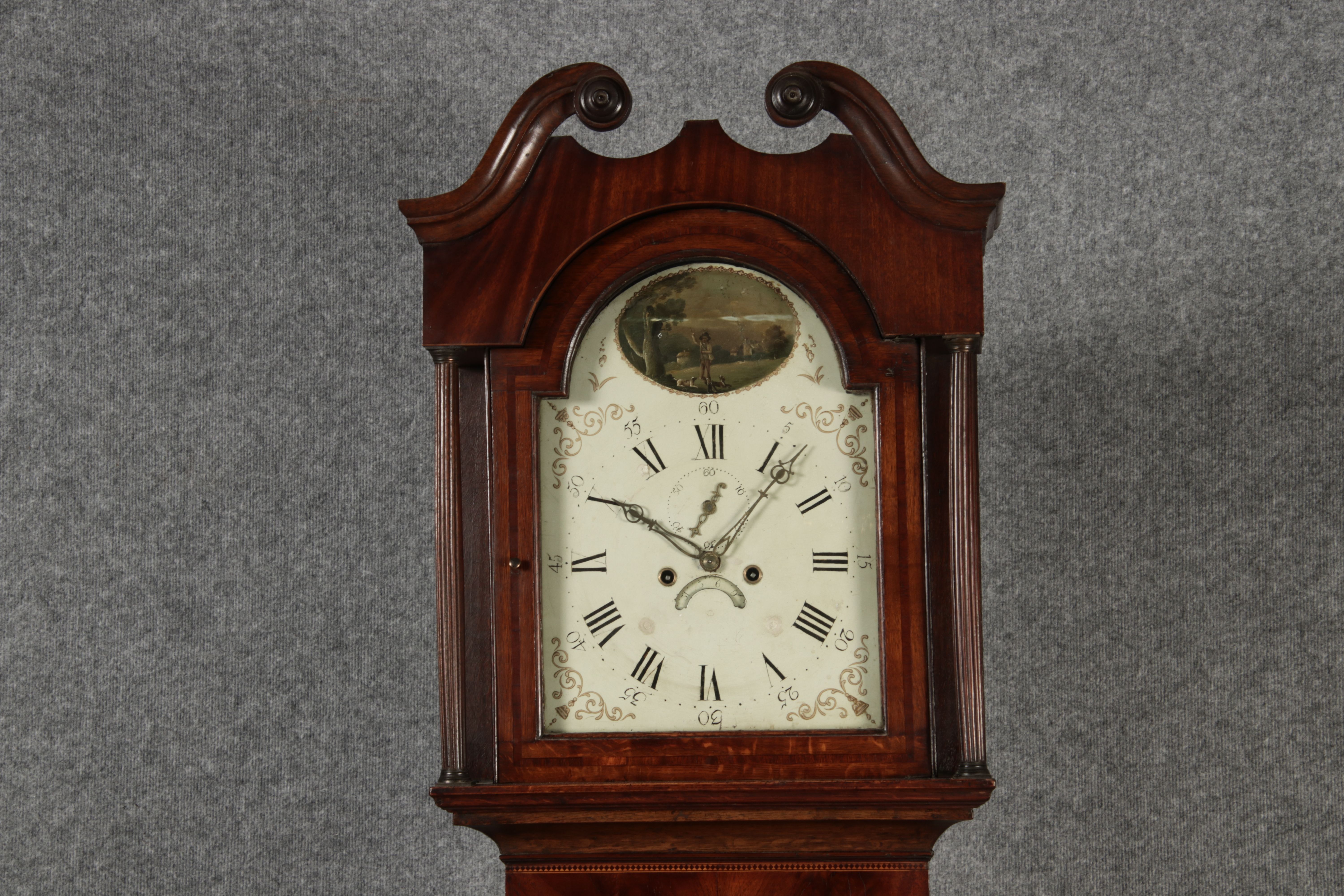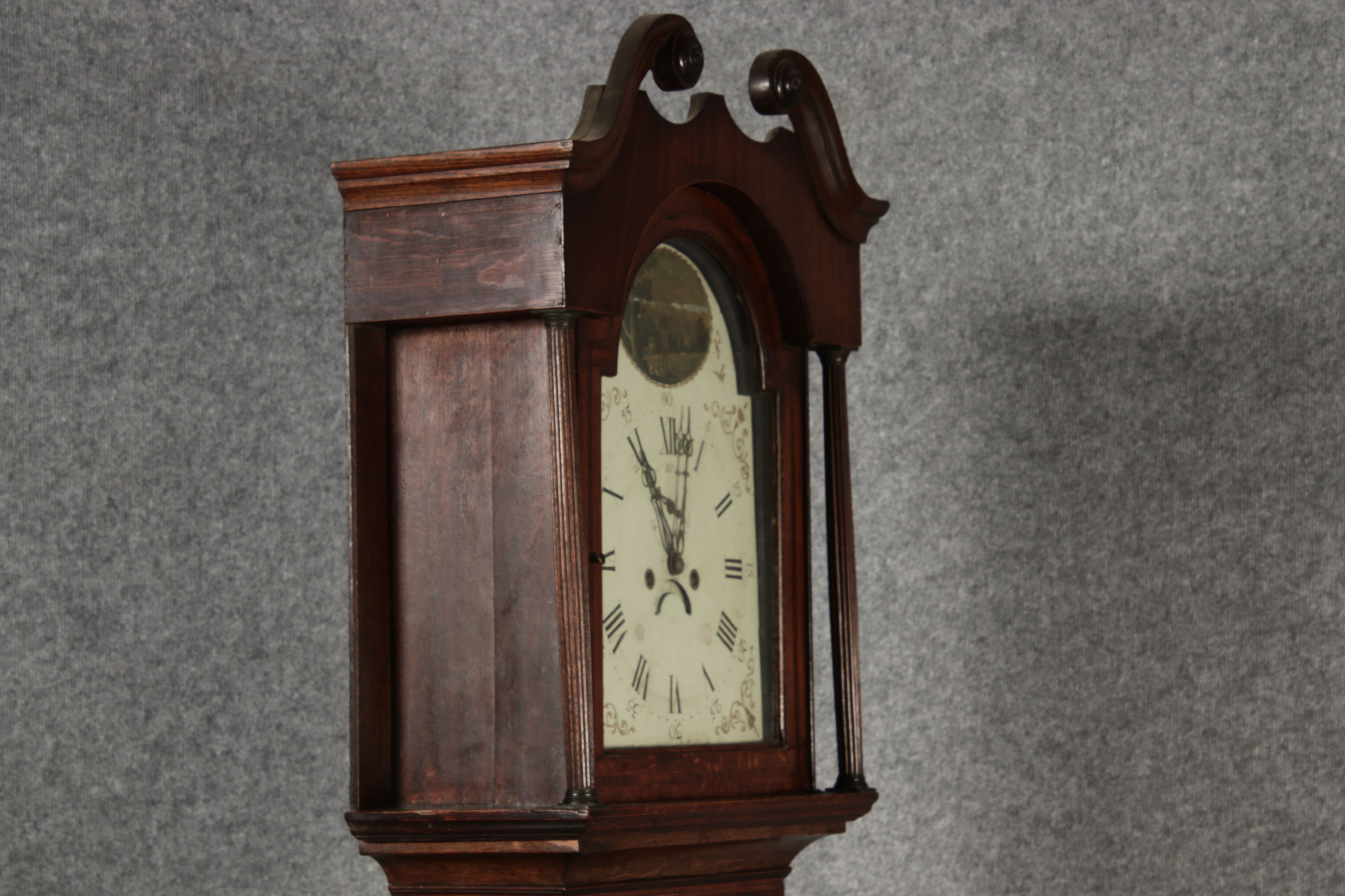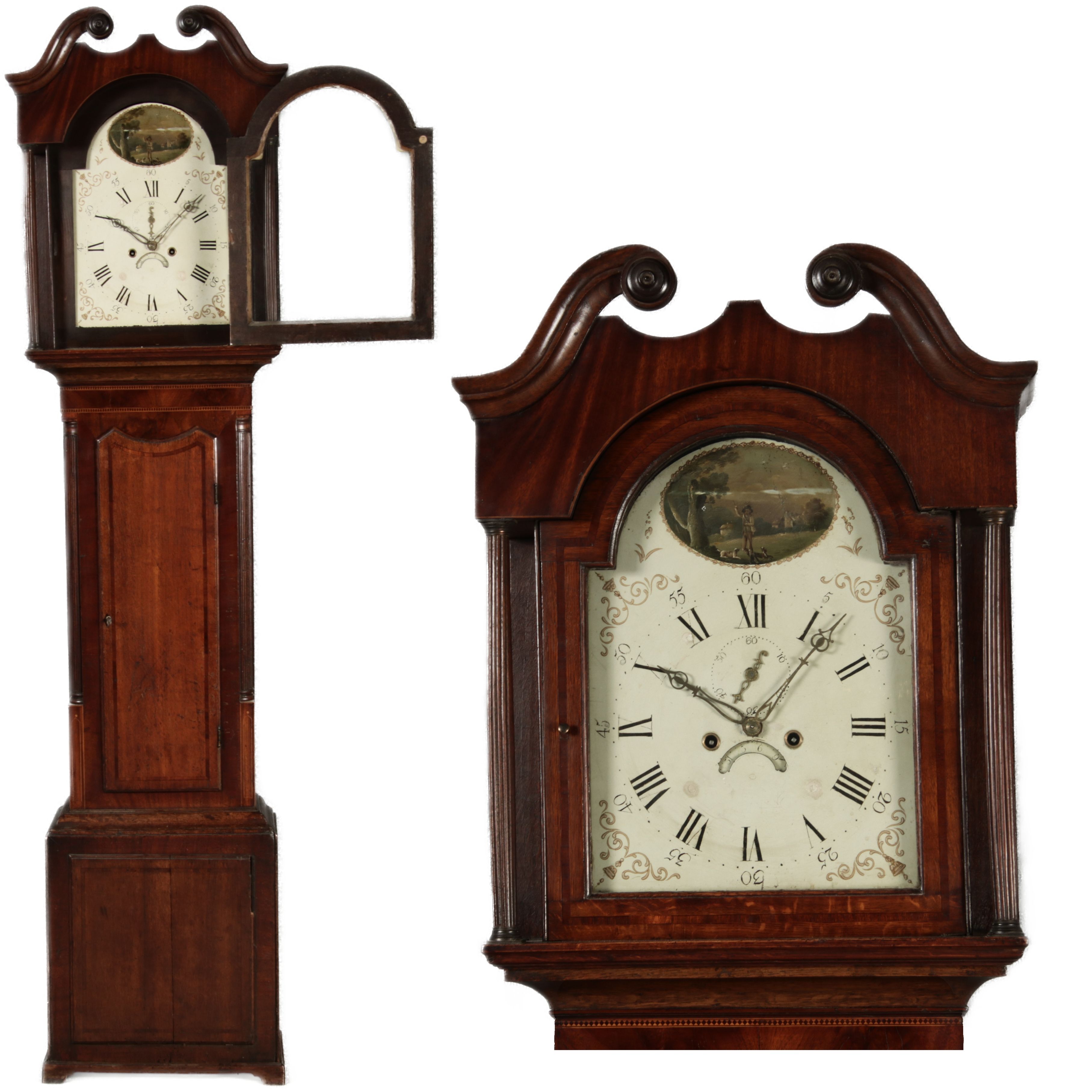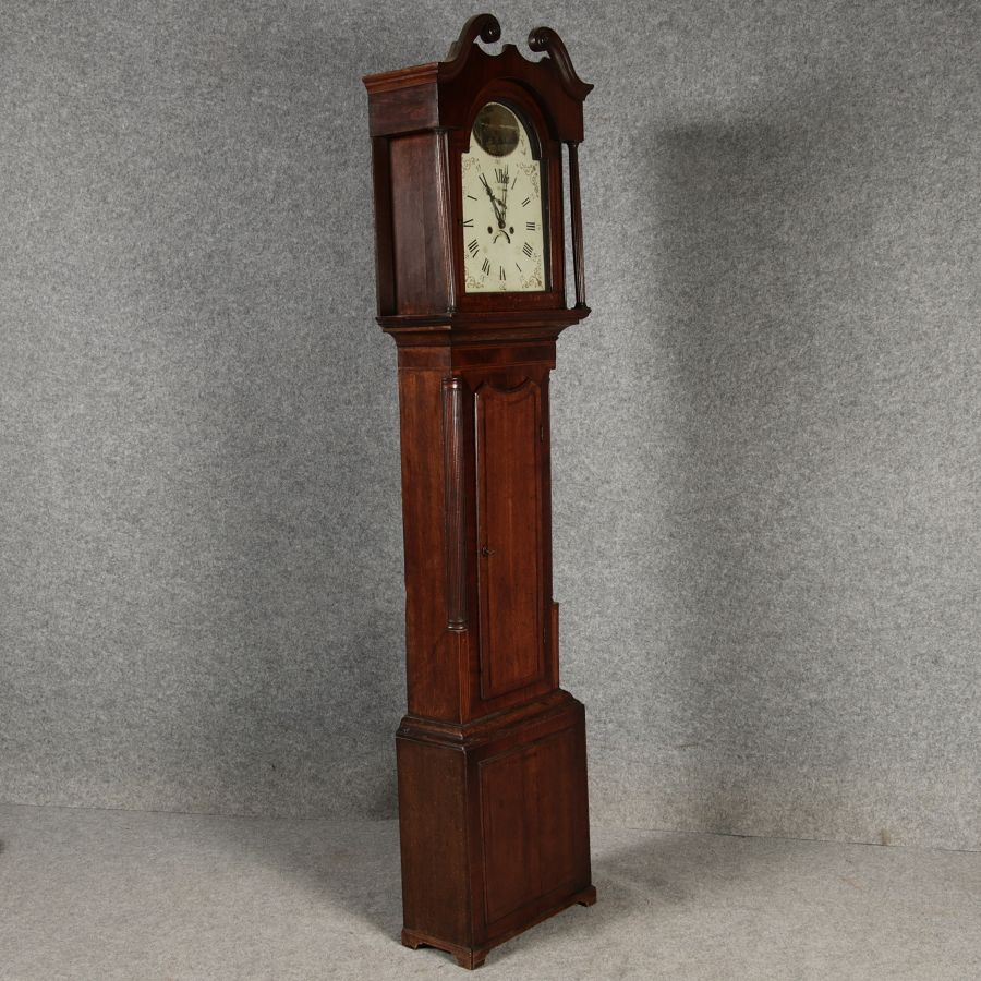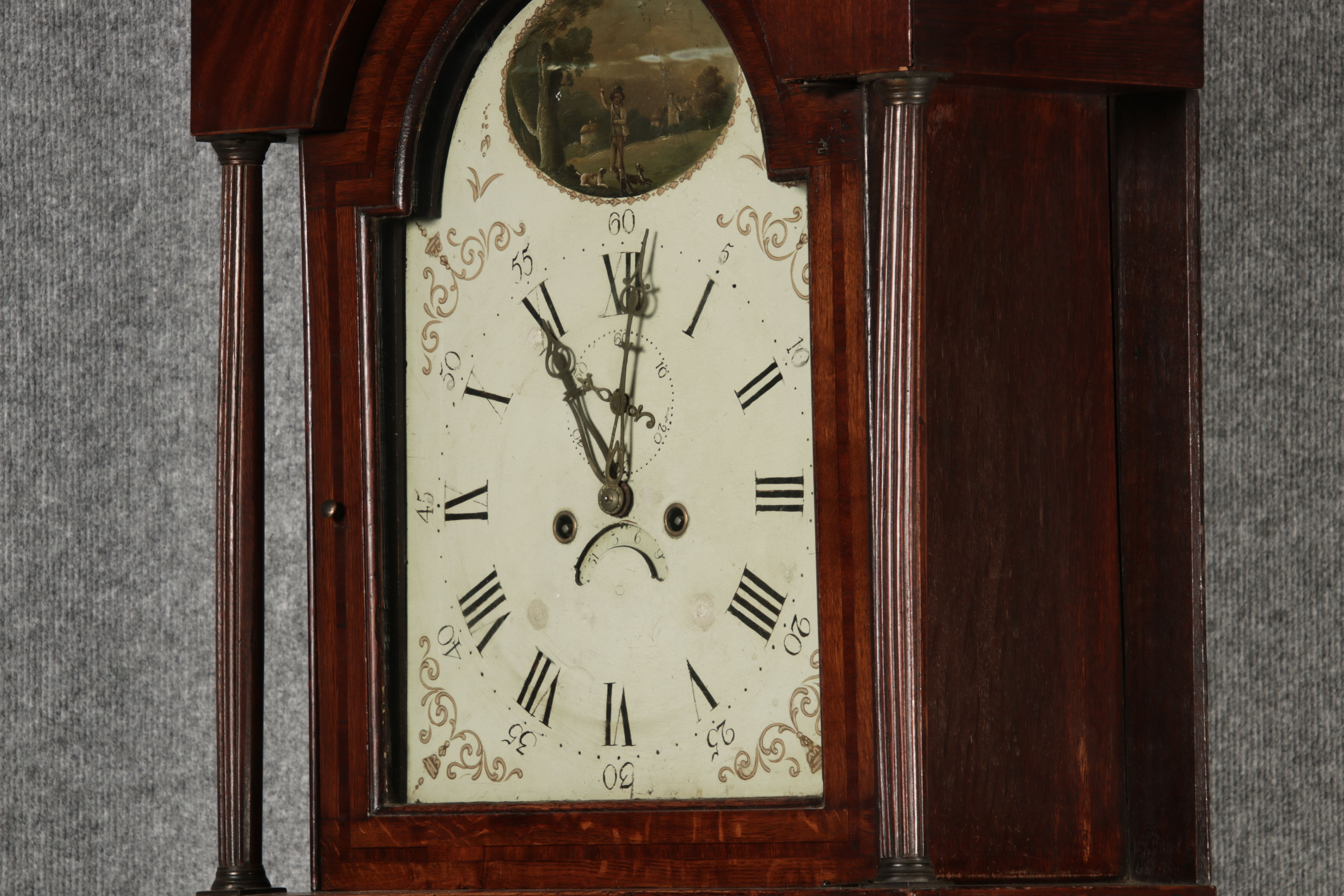 Antike Englische Standuhr im klassischen Design aus dem 19 Jh. Diese elegante antike Standuhr besticht durch ihre handwerkliche Verarbeitung und die Verwendung von Edler Hölzer, die dem Stück eine warme Ausstrahlung verleihen. Die Uhr verfügt über ein Gehäuse aus massivem Holz, das einen tiefen, warmen Ton hat und mit einer geschmackvollen Patina versehen ist, die im Laufe der Jahre entwickelt wurde. Die geschwungene Krone im klassischen Stil sowie die detailreiche Gestaltung des Ziffernblatts tragen zum Erscheinungsbild bei. Das Ziffernblatt selbst ist mit römischen Ziffern versehen und zeigt feine Verzierungen im Barockstil. Über dem Ziffernblatt befindet sich eine dekorative Malerei, die eine ländliche Szene darstellt, und dem Design einen zusätzlichen Hauch von Eleganz und Kunstfertigkeit verleiht. Die Uhr besitzt ein mechanisches Uhrwerk, das über ein Pendel angetrieben wird.