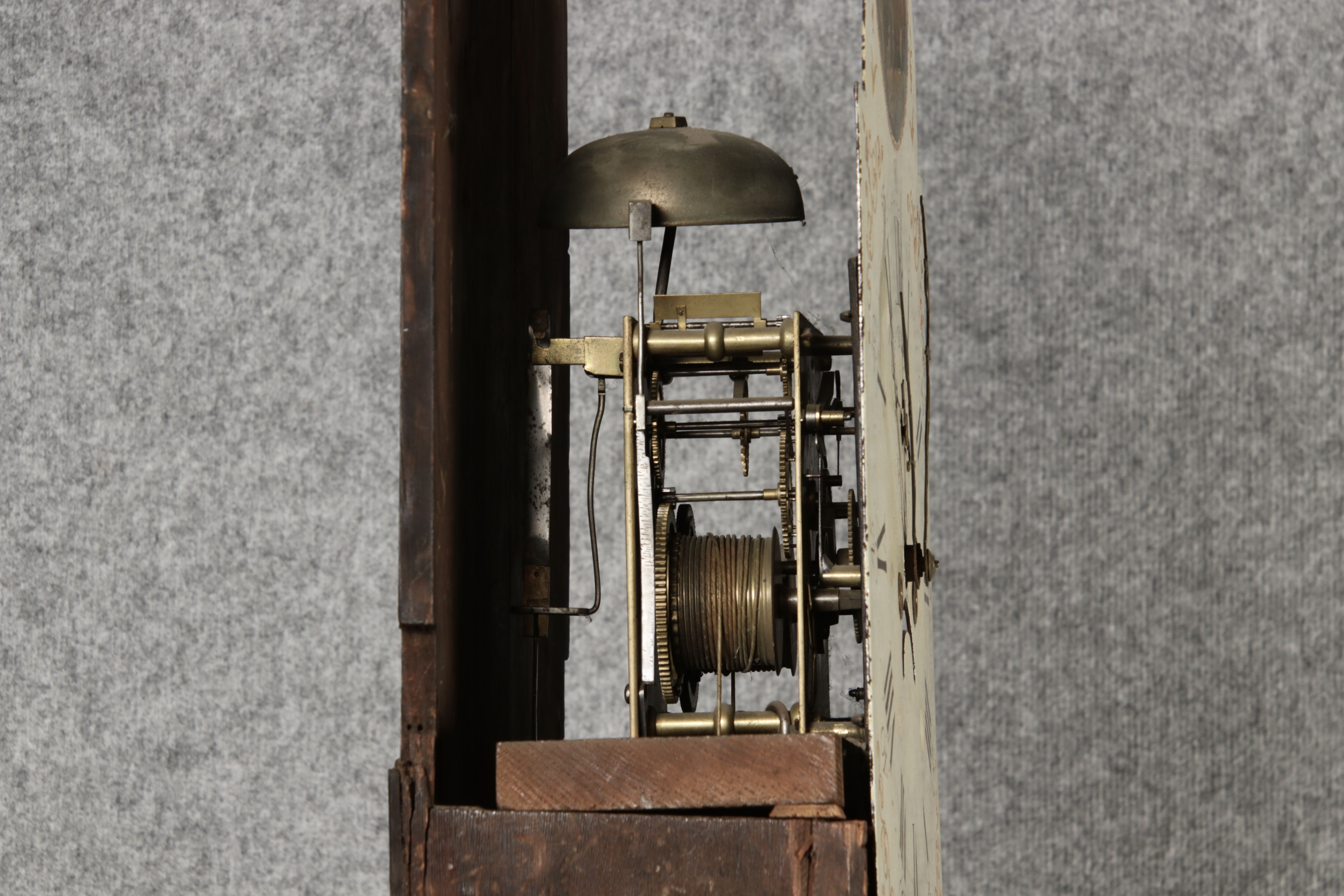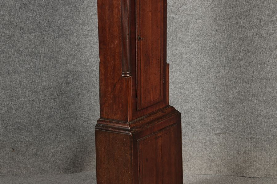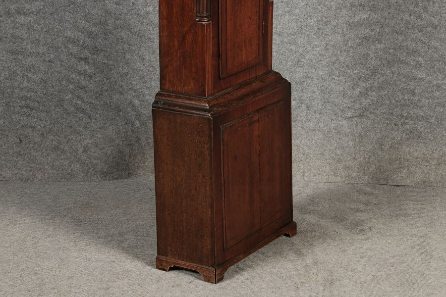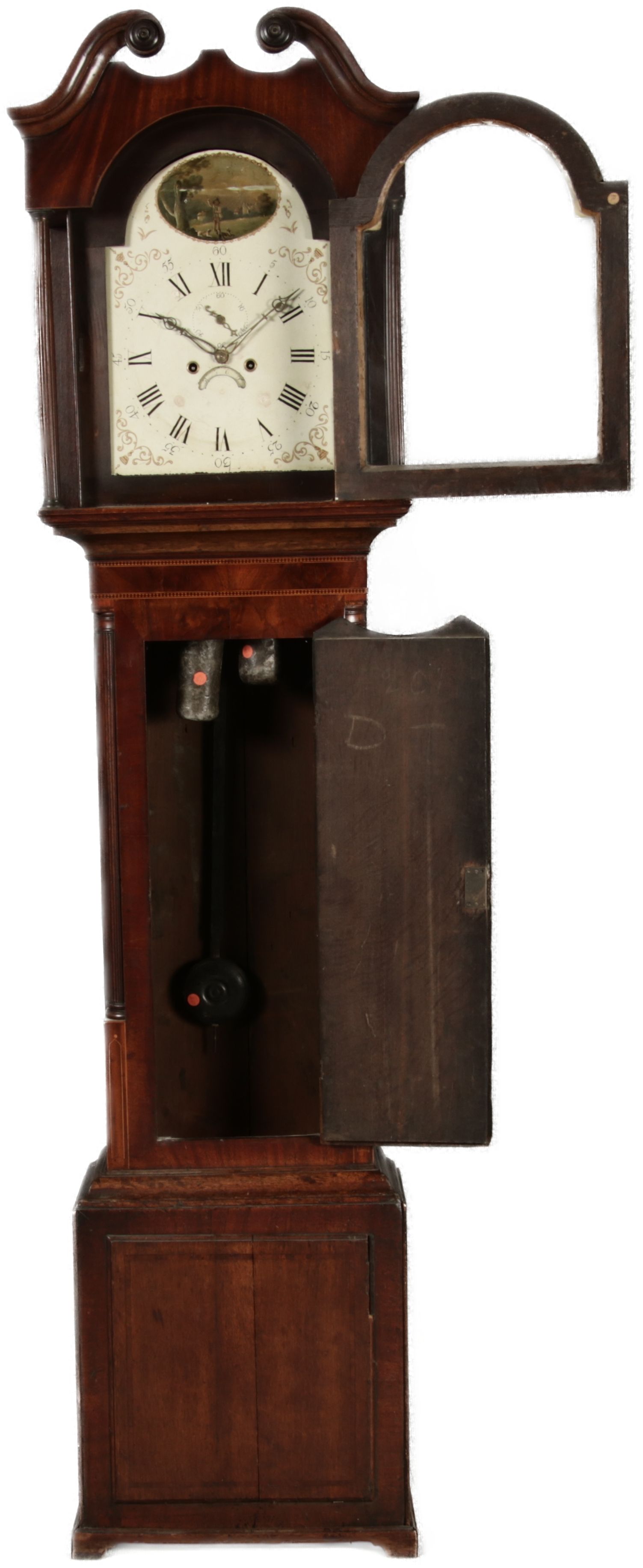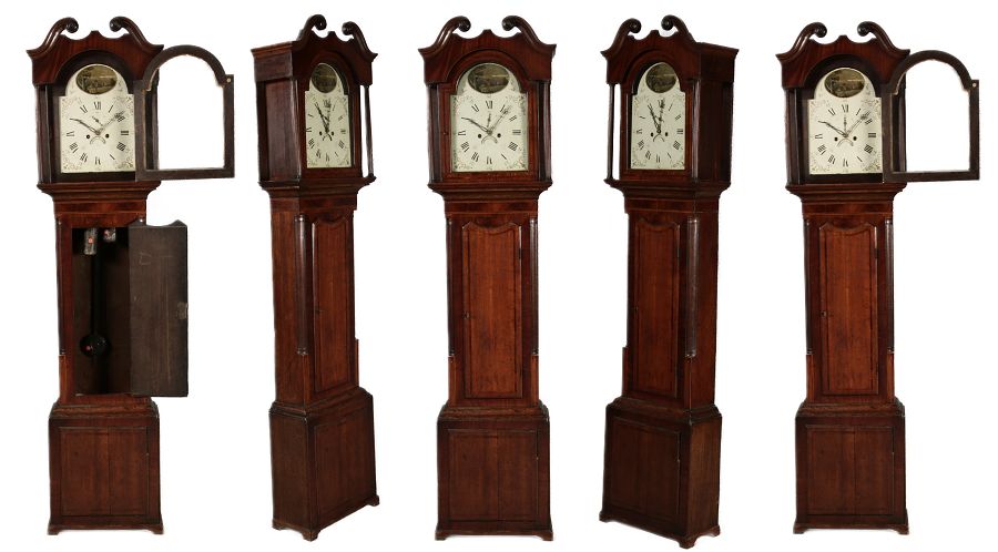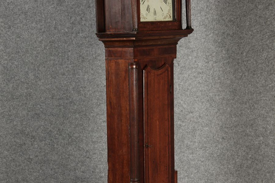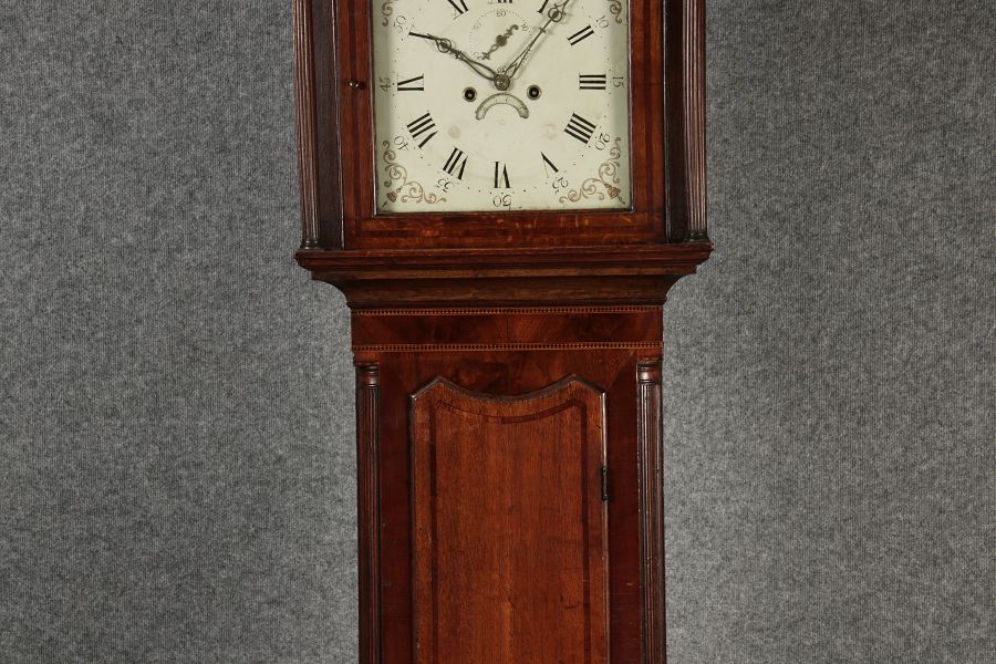 Antike Englische Standuhr im klassischen Design aus dem 19 Jh. Diese elegante antike Standuhr besticht durch ihre handwerkliche Verarbeitung und die Verwendung von Edler Hölzer, die dem Stück eine warme Ausstrahlung verleihen. Die Uhr verfügt über ein Gehäuse aus massivem Holz, das einen tiefen, warmen Ton hat und mit einer geschmackvollen Patina versehen ist, die im Laufe der Jahre entwickelt wurde. Die geschwungene Krone im klassischen Stil sowie die detailreiche Gestaltung des Ziffernblatts tragen zum Erscheinungsbild bei. Das Ziffernblatt selbst ist mit römischen Ziffern versehen und zeigt feine Verzierungen im Barockstil. Über dem Ziffernblatt befindet sich eine dekorative Malerei, die eine ländliche Szene darstellt, und dem Design einen zusätzlichen Hauch von Eleganz und Kunstfertigkeit verleiht. Die Uhr besitzt ein mechanisches Uhrwerk, das über ein Pendel angetrieben wird.