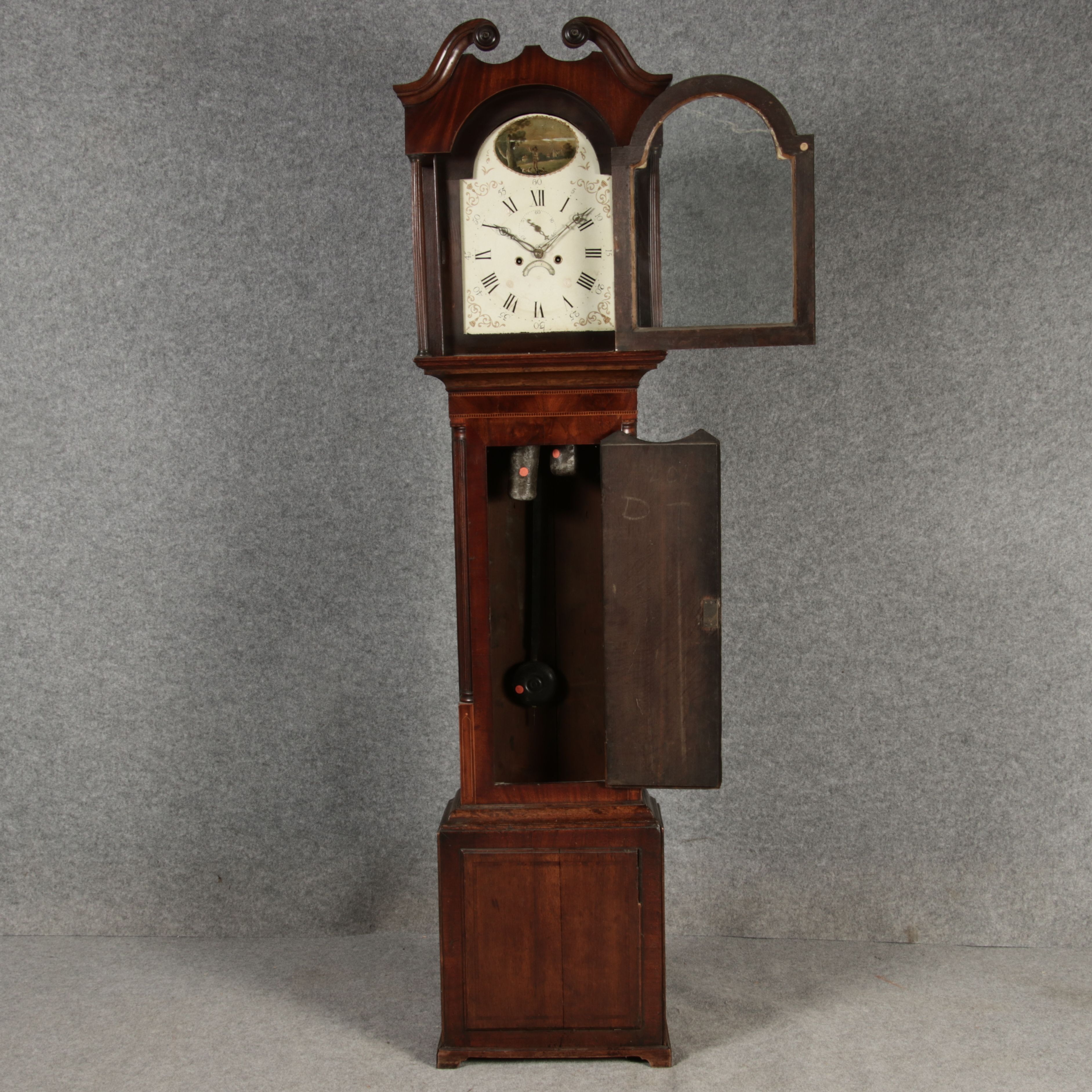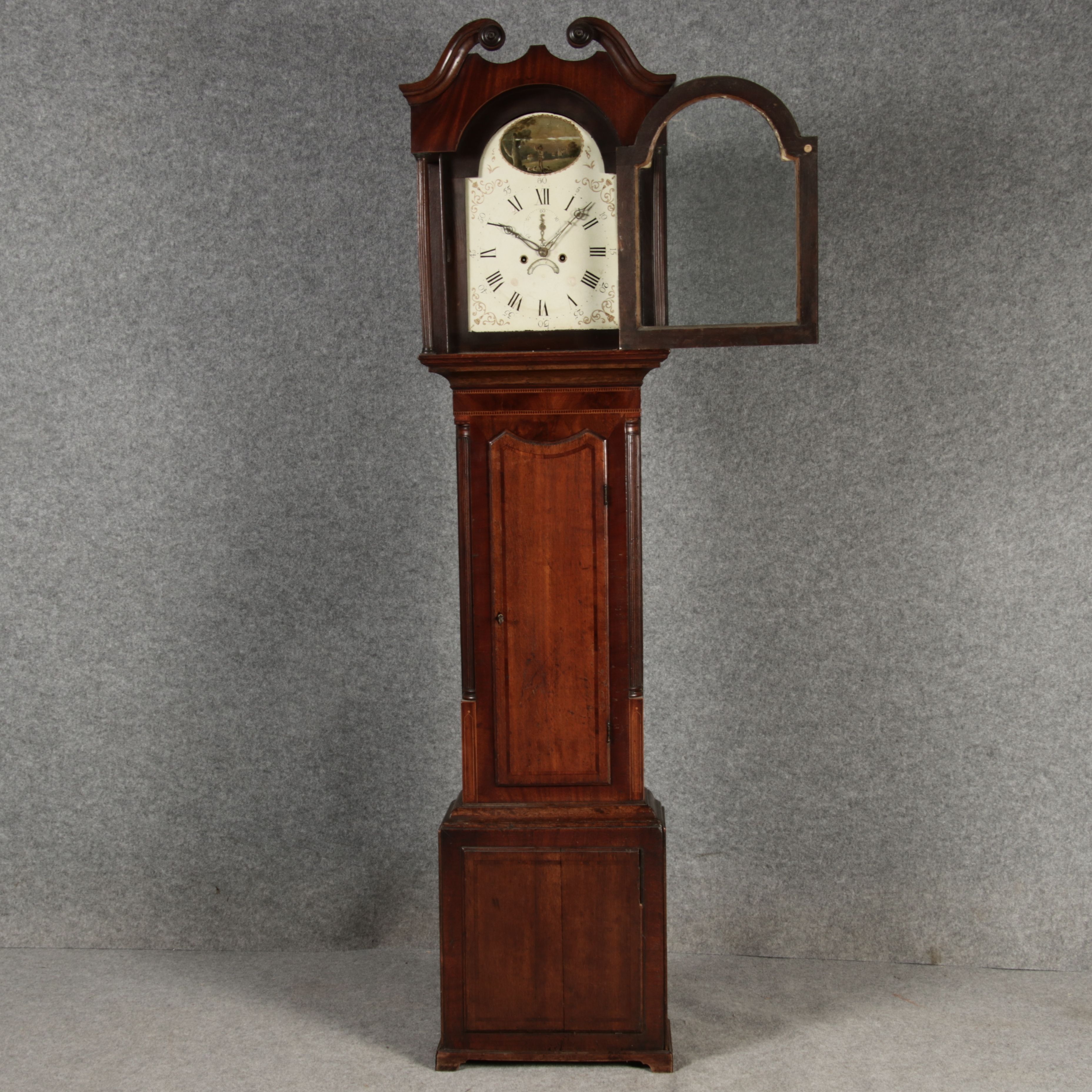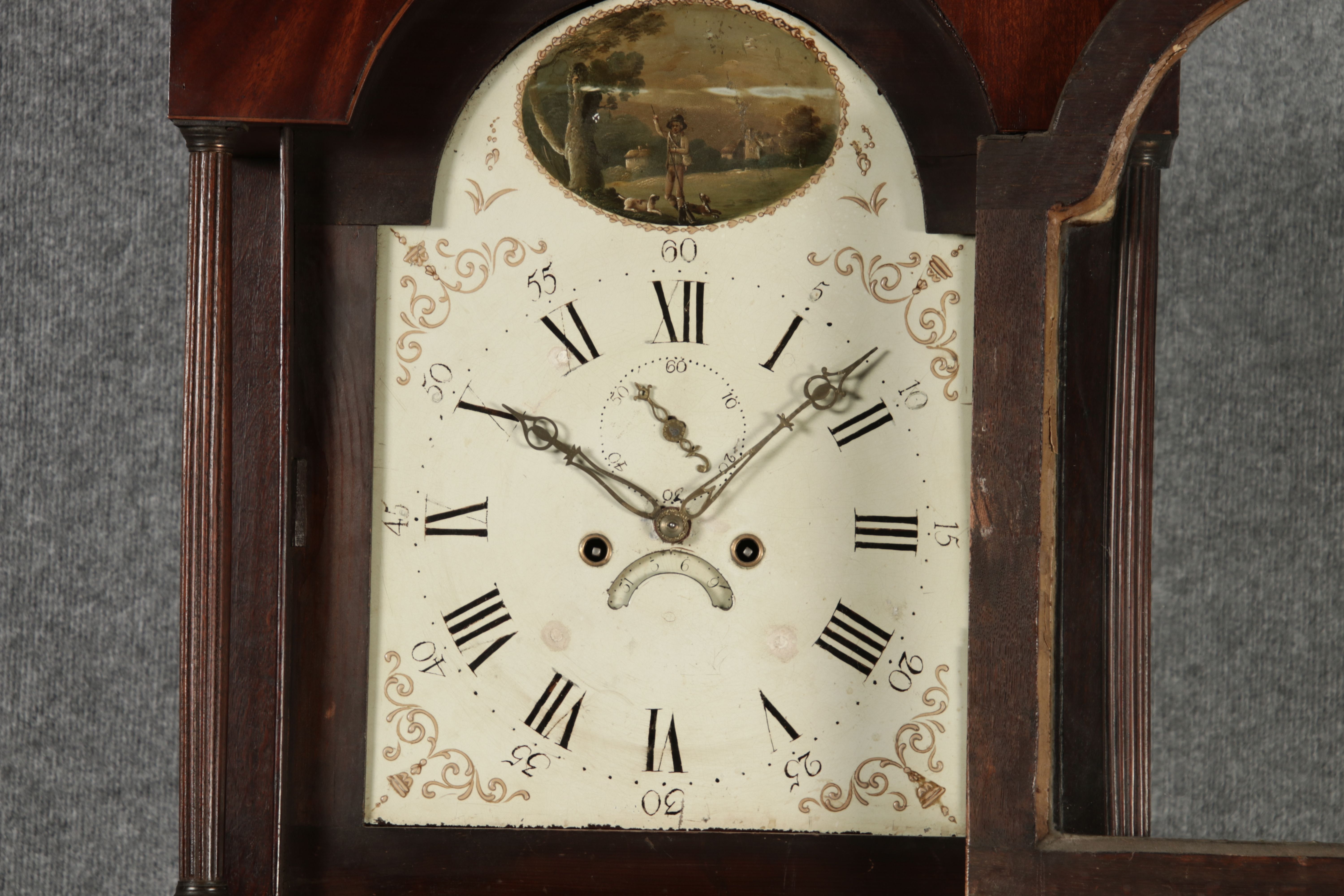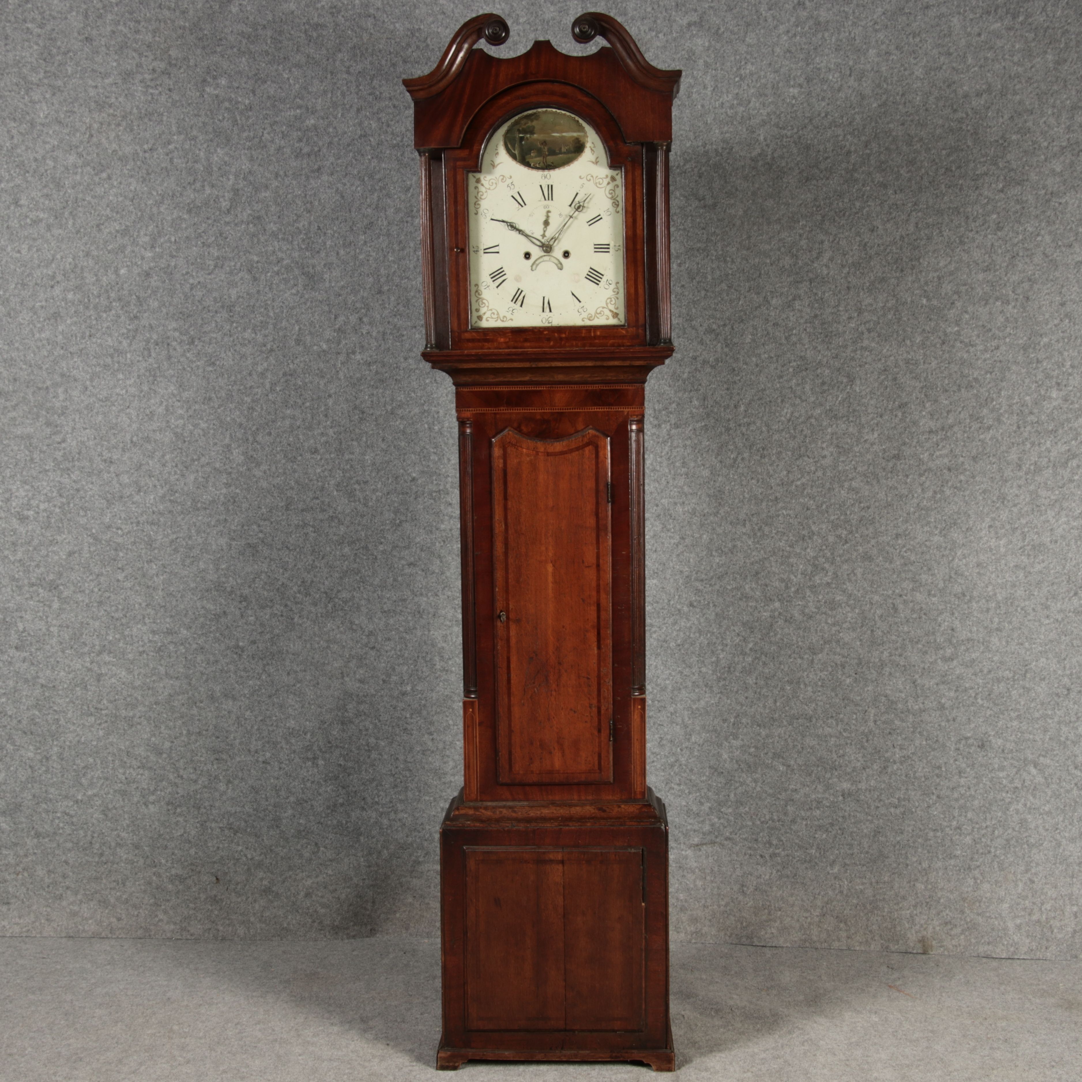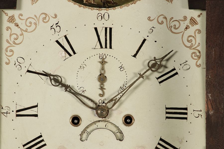 Beschreibung/description: Antike Englische Standuhr im klassischen Design aus dem 19 Jh. Diese elegante antike Standuhr besticht durch ihre handwerkliche Verarbeitung und die Verwendung von Edler Hölzer, die dem Stück eine warme Ausstrahlung verleihen. Die Uhr verfügt über ein Gehäuse aus massivem Holz, das einen tiefen, warmen Ton hat und mit einer geschmackvollen Patina versehen ist, die im Laufe der Jahre entwickelt wurde. Die geschwungene Krone im klassischen Stil sowie die detailreiche Gestaltung des Ziffernblatts tragen zum Erscheinungsbild bei. Das Ziffernblatt selbst ist mit römischen Ziffern versehen und zeigt feine Verzierungen im Barockstil. Über dem Ziffernblatt befindet sich eine dekorative Malerei, die eine ländliche Szene darstellt, und dem Design einen zusätzlichen Hauch von Eleganz und Kunstfertigkeit verleiht. Die Uhr besitzt ein mechanisches Uhrwerk, das über ein Pendel angetrieben wird. ArtikelNummer /number: stuhr104