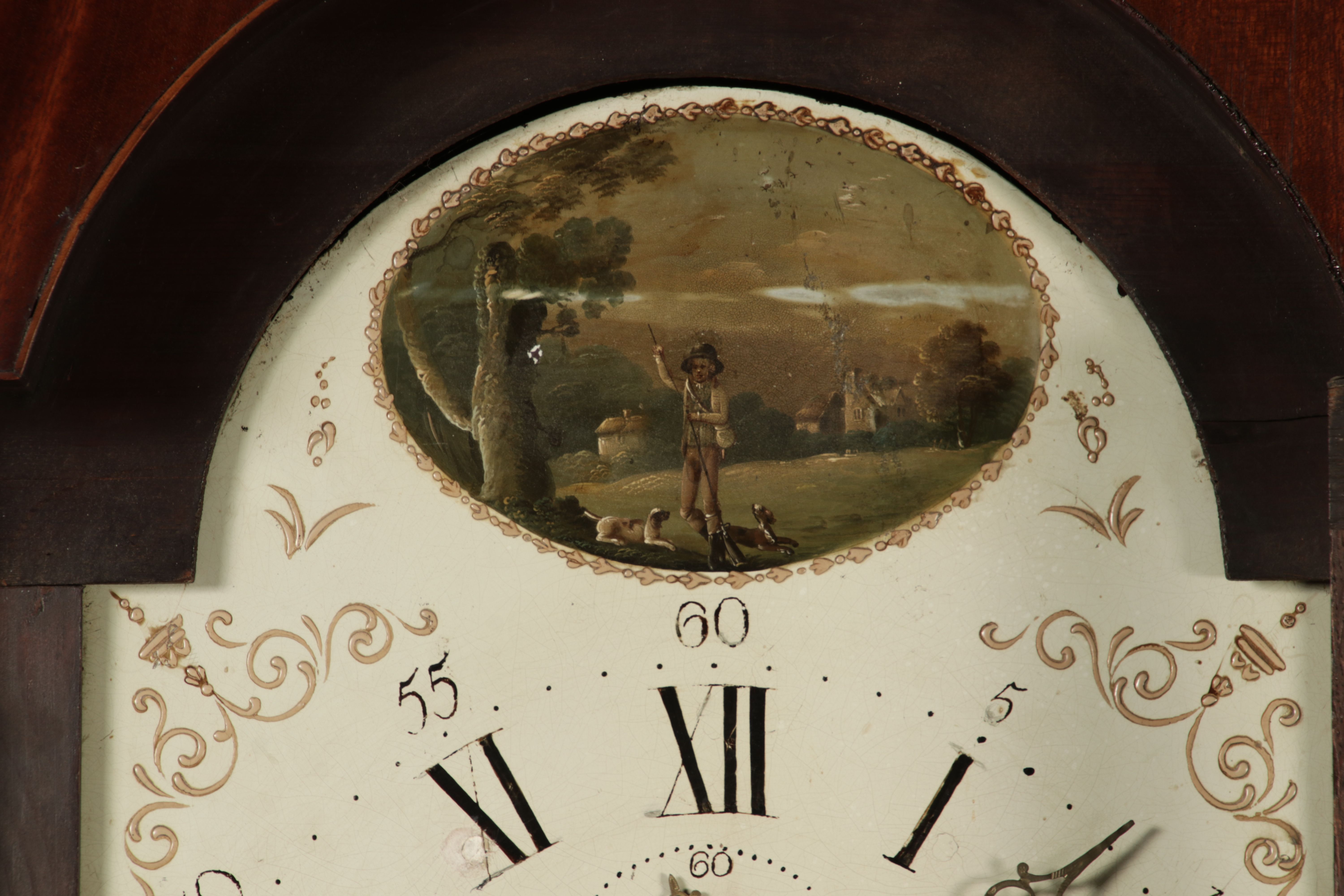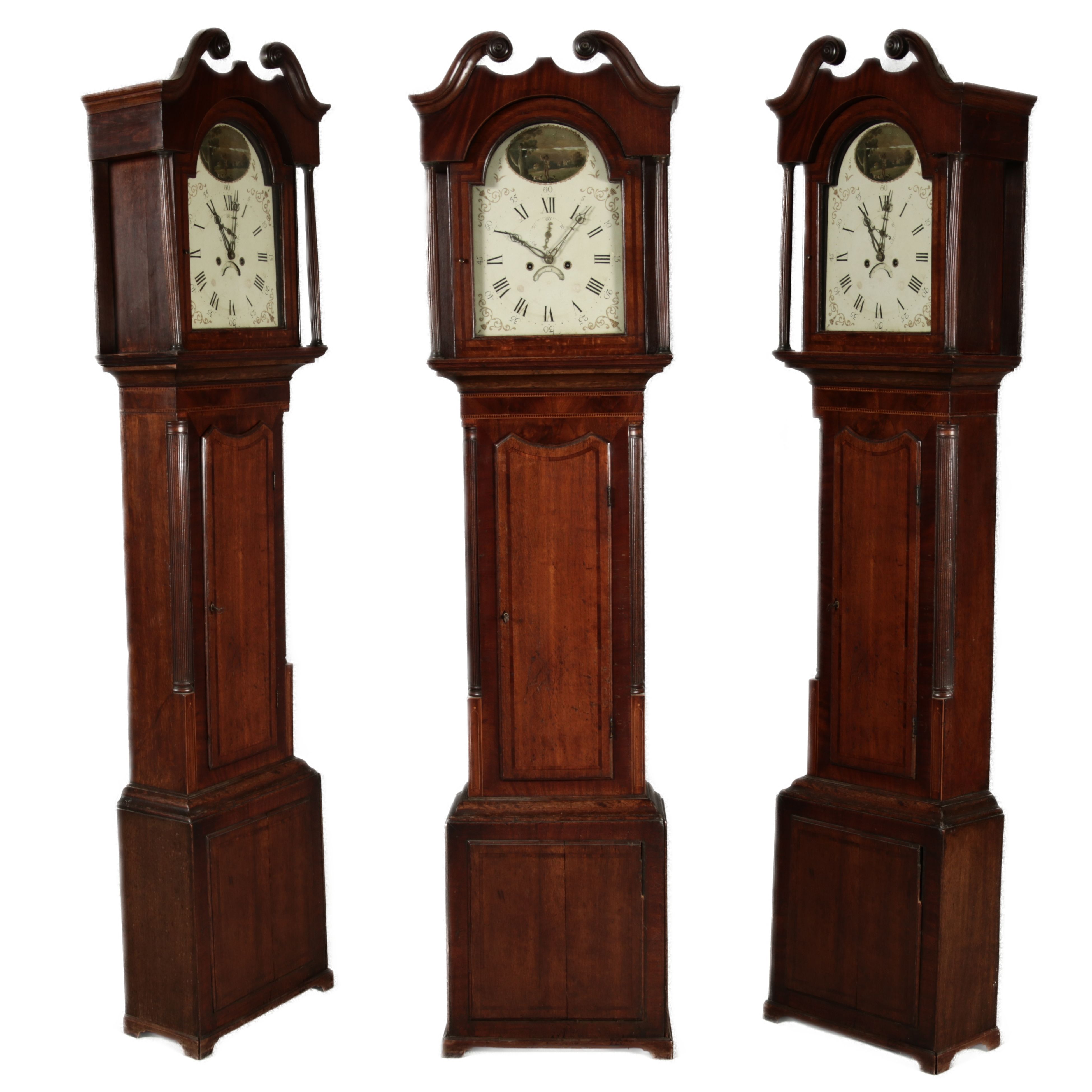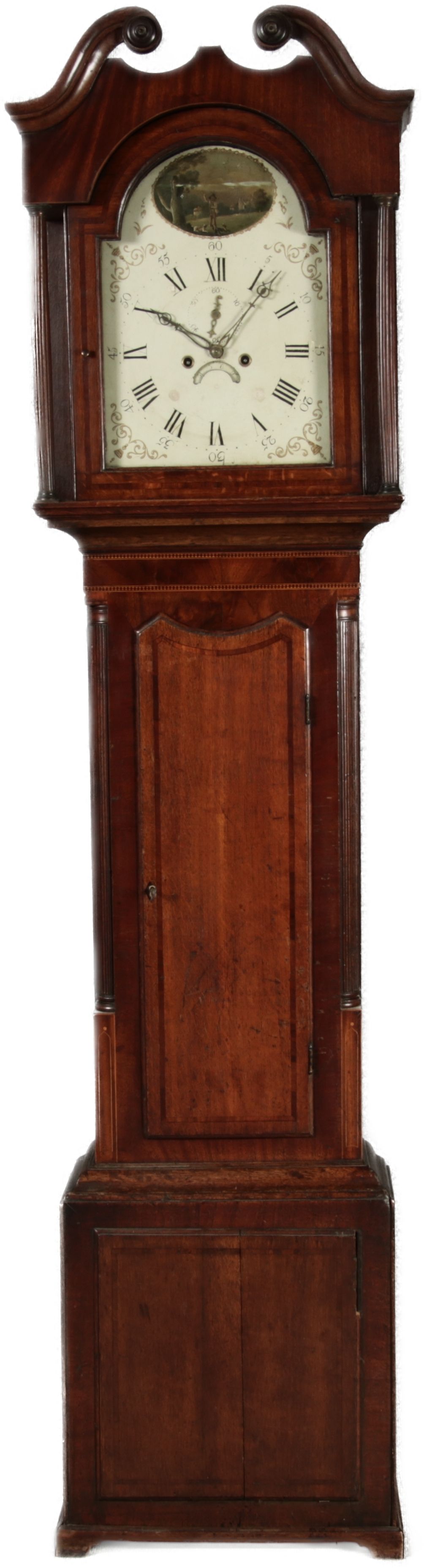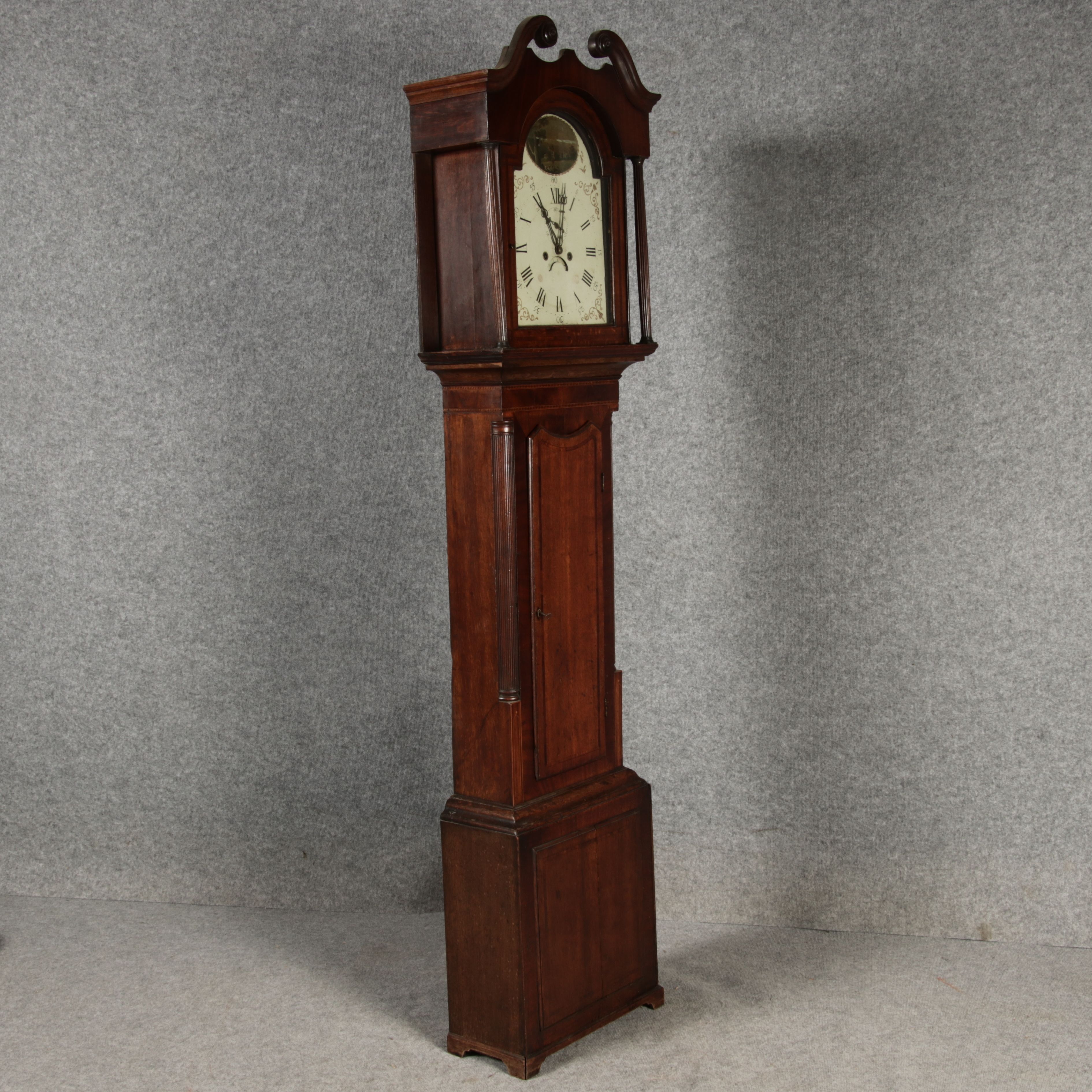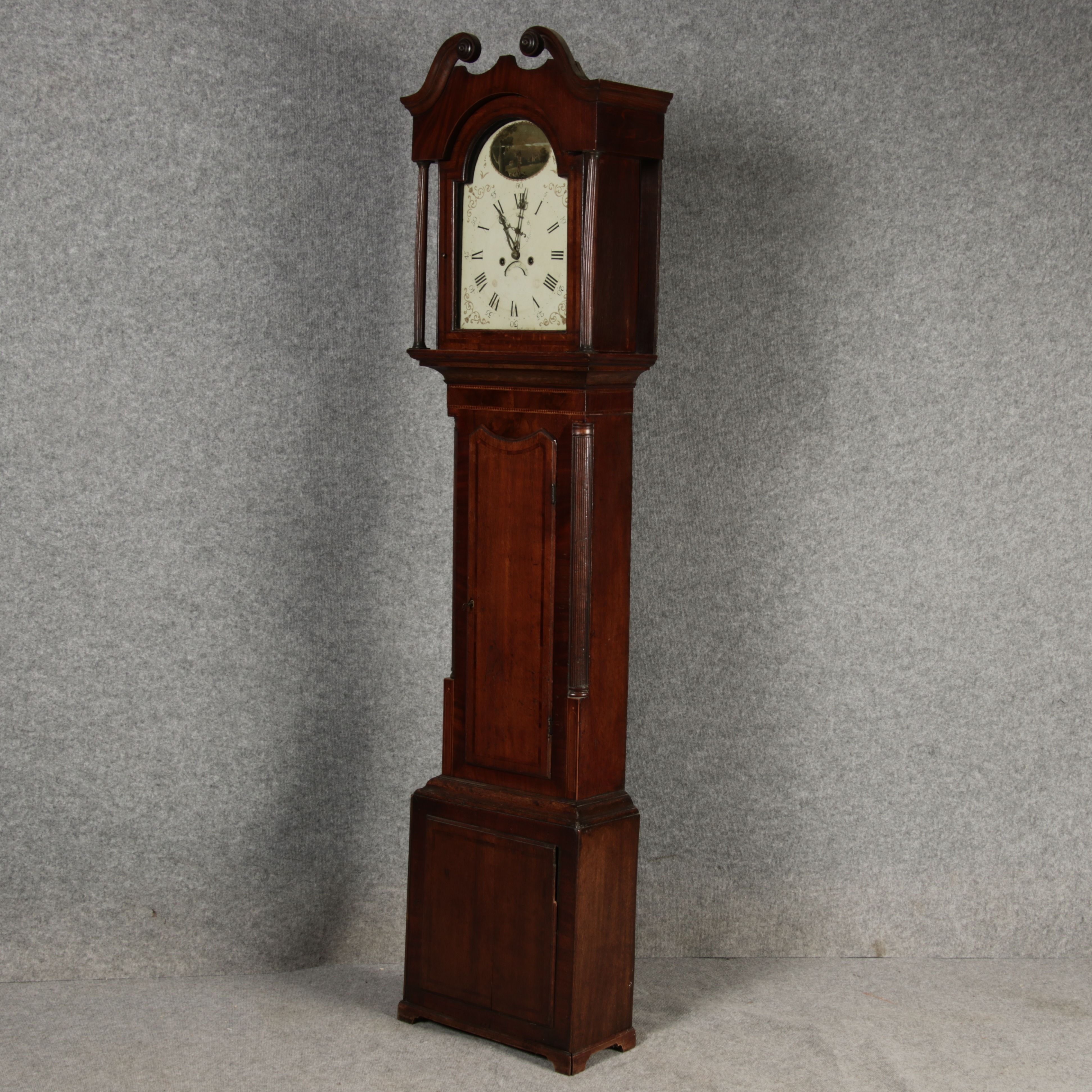 Beschreibung/description: Antike Englische Standuhr im klassischen Design aus dem 19 Jh. Diese elegante antike Standuhr besticht durch ihre handwerkliche Verarbeitung und die Verwendung von Edler Hölzer, die dem Stück eine warme Ausstrahlung verleihen. Die Uhr verfügt über ein Gehäuse aus massivem Holz, das einen tiefen, warmen Ton hat und mit einer geschmackvollen Patina versehen ist, die im Laufe der Jahre entwickelt wurde. Die geschwungene Krone im klassischen Stil sowie die detailreiche Gestaltung des Ziffernblatts tragen zum Erscheinungsbild bei. Das Ziffernblatt selbst ist mit römischen Ziffern versehen und zeigt feine Verzierungen im Barockstil. Über dem Ziffernblatt befindet sich eine dekorative Malerei, die eine ländliche Szene darstellt, und dem Design einen zusätzlichen Hauch von Eleganz und Kunstfertigkeit verleiht. Die Uhr besitzt ein mechanisches Uhrwerk, das über ein Pendel angetrieben wird. ArtikelNummer /number: stuhr104