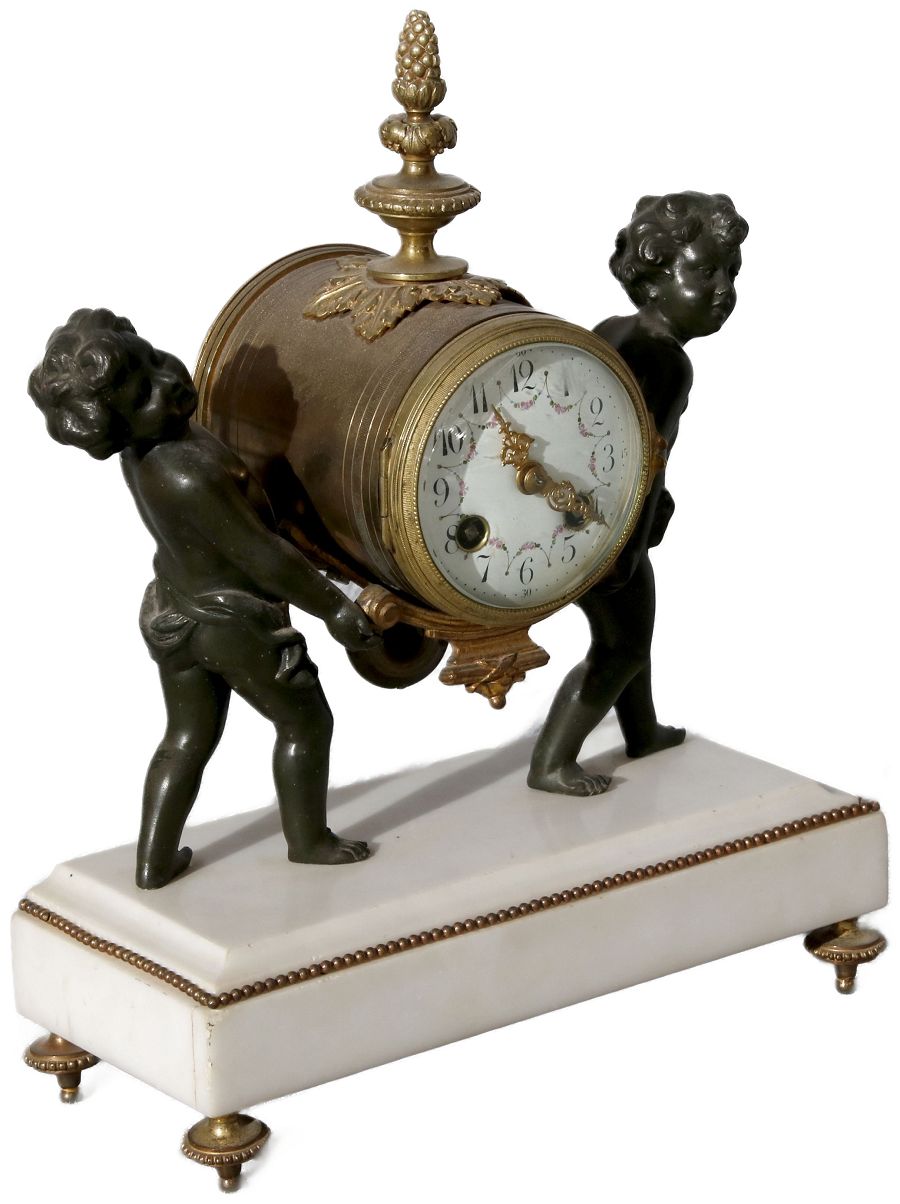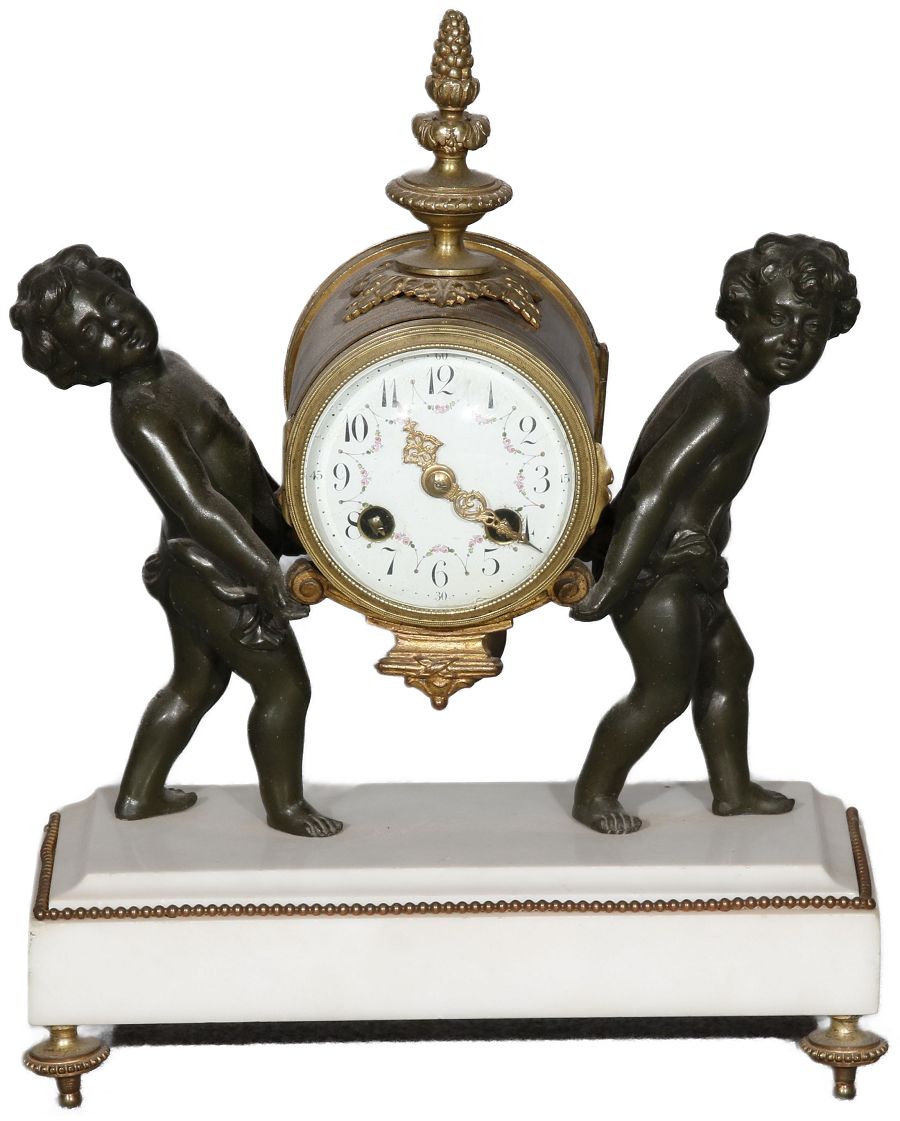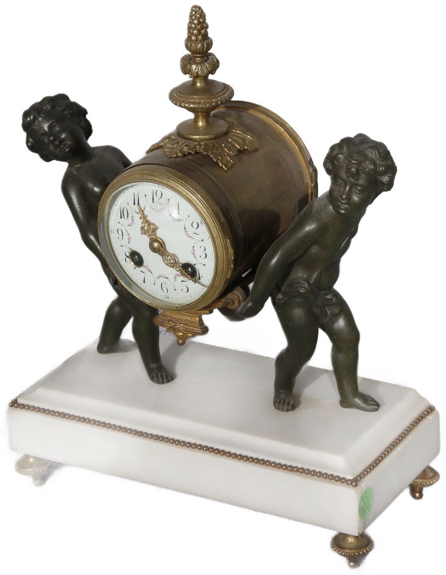 Für XXL Bild hier klicken1 Uhren Spezifikationen Art der Uhr Kamin- Uhr Tisch- Uhr mit Beistellern Alter und Herkunft Alter Wahrscheinlich Mitte 19 Jh. und die Herkunft ist wahrscheinlich Frankreich Gehäuse Material Messing Bronze Mamor Masse Uhr Höhe ca. 33 cm, Breite ca. 26 cm Masse Beisteller Höhe ca. 31 cm, Breite ca. 13 cm Material Uhrwerk Messing Eisen Pendel- Aufhängung Pendelfeder Hemmung Ankerhemmung Schlagwerk 1/2 Stunden und volle Stunden Schlag auf Glocke Zustand Gehäuse Guter Zustand mit Gebrauchsspuren, Bilder sind Bestandteil der Auktion. Zustand Uhrwerk Guter Zustand mit Gebrauchsspuren. Uhrwerk ist vor ca. 3 Jahren überholt worden und läuft einwandfrei. Bilder sind Bestandteil der Auktion. |