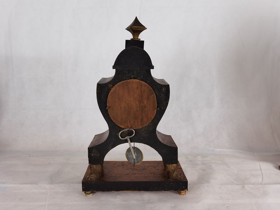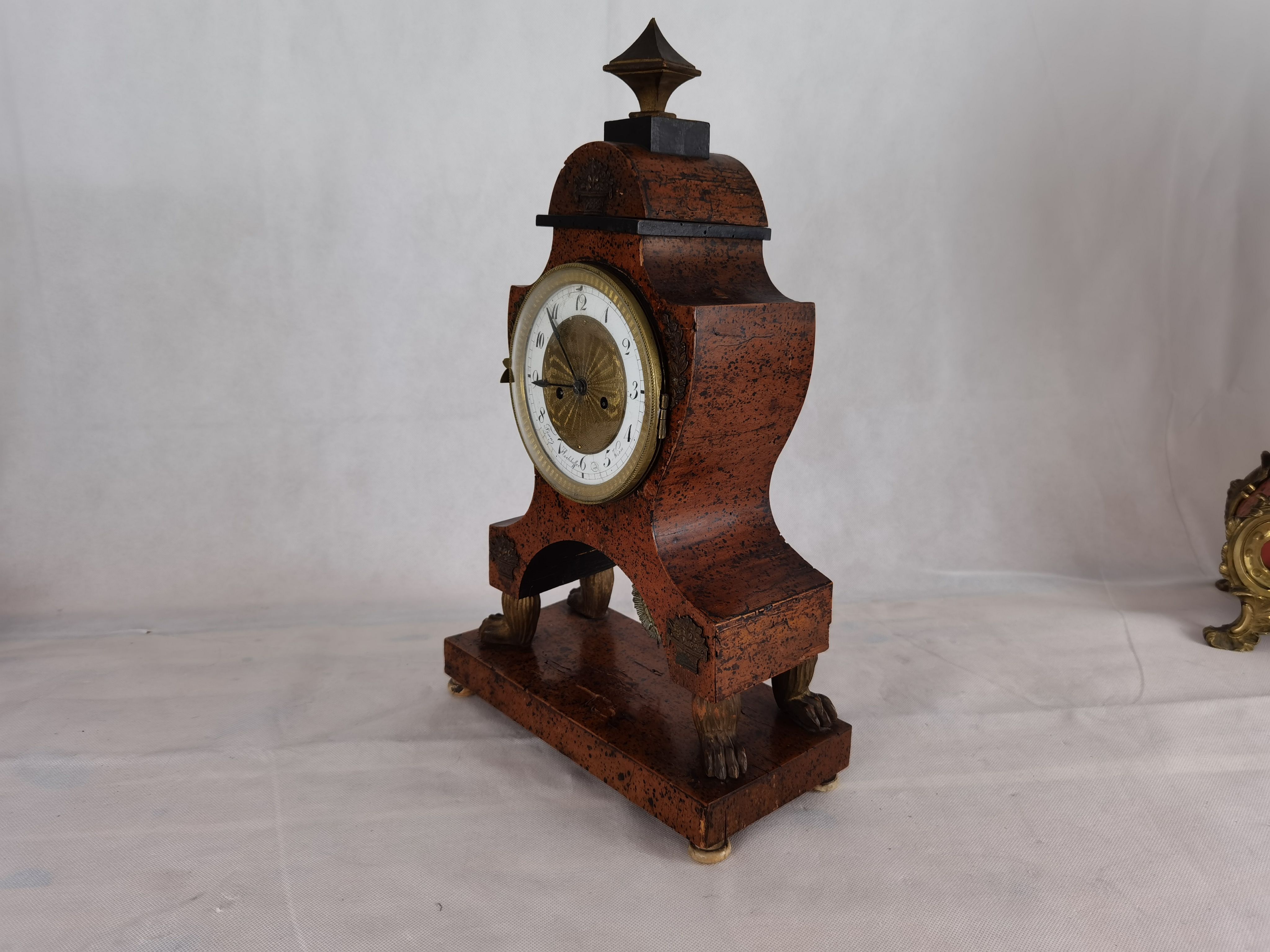 Für XXL Bild hier klicken1 Uhren Spezifikationen Art der Uhr Pendüle Kamin- Uhr Tisch- Uhr Alter und Herkunft um1820 / und die Herkunft ist Österreich Wien Gehäuse Material Messing Bronze Holz Masse Uhr Höhe ca. cm, Breite ca. cm, Tiefe ca. cm Masse Beisteller Höhe ca. 43 cm, Breite ca. 26 cm, Tiefe ca. 12 cm Material Uhrwerk Messing Eisen Pendel- Aufhängung Fadenaufhängung Hemmung und Gewichte Ankerhemmung Schlagwerk 1/1 1/2 Schlag auf Tonfeder Zustand Gehäuse Guter Zustand mit Gebrauchsspuren, teilweise ergänzt (Füß hinten links ergänzt), beschädigt, mit Fehlstellen, Schwundrissen, alt restauriert siehe Bilder. Bilder sind Bestandteil der Auktion. Zustand Uhrwerk Guter Zustand mit Gebrauchsspuren. Uhrwerk läuft, jedoch ohne Garantie. Bilder sind Bestandteil der Auktion. |