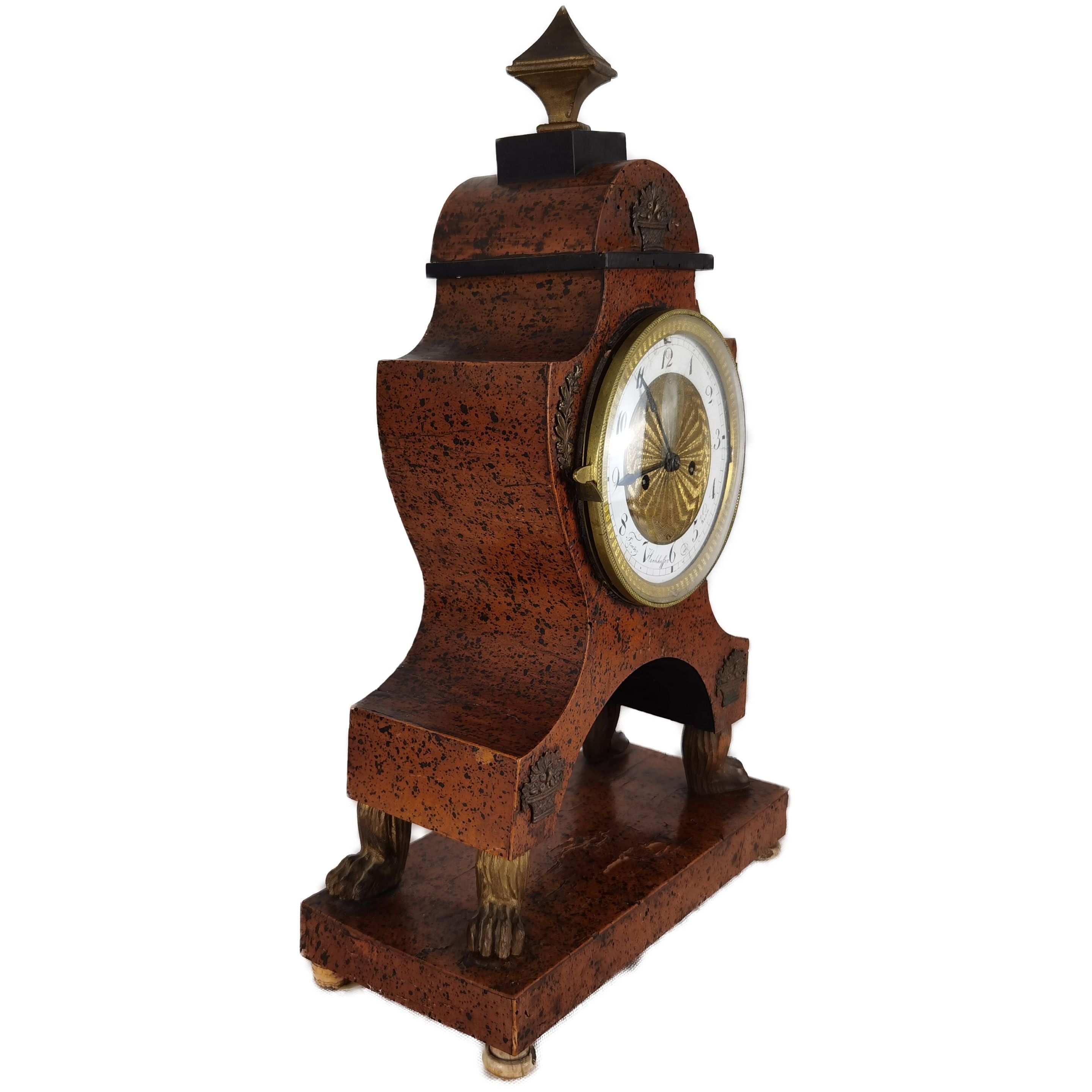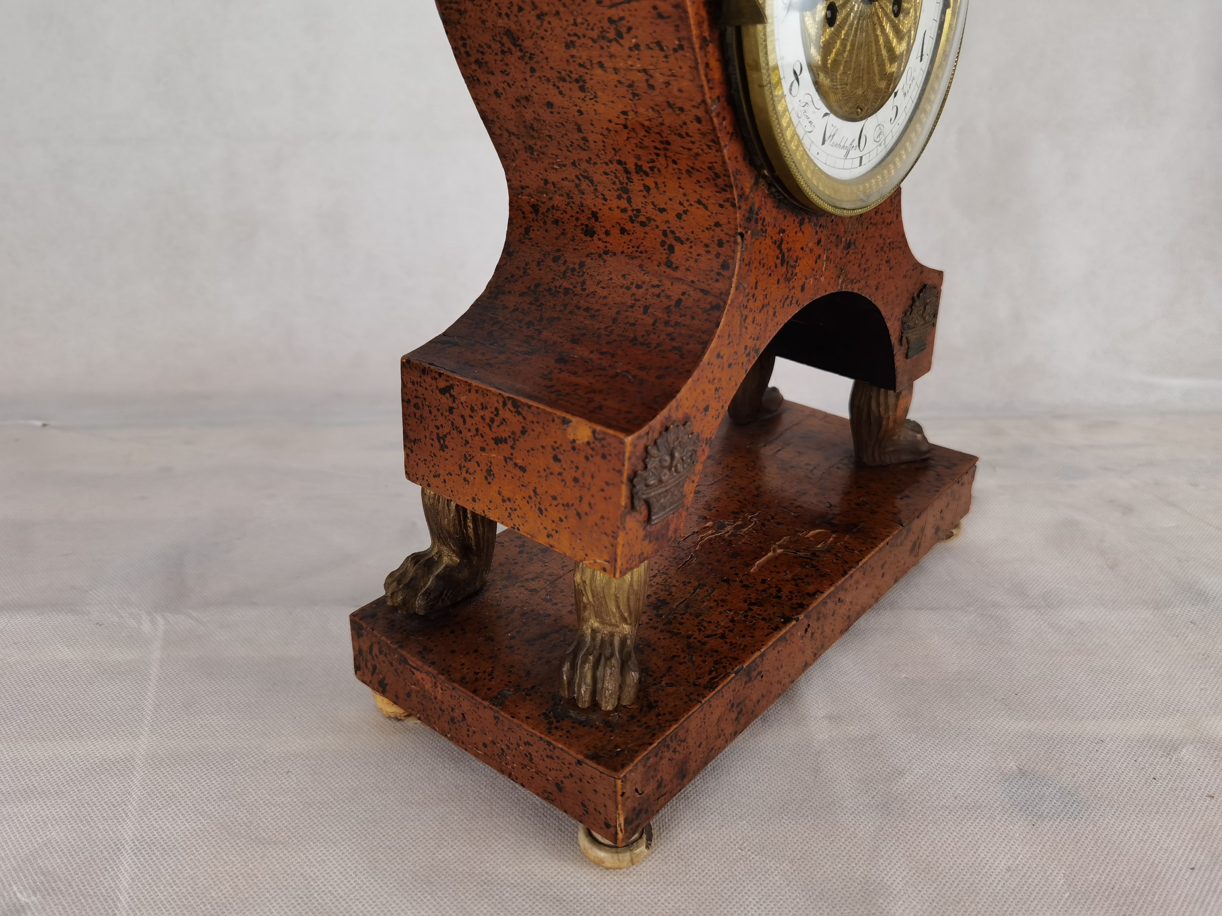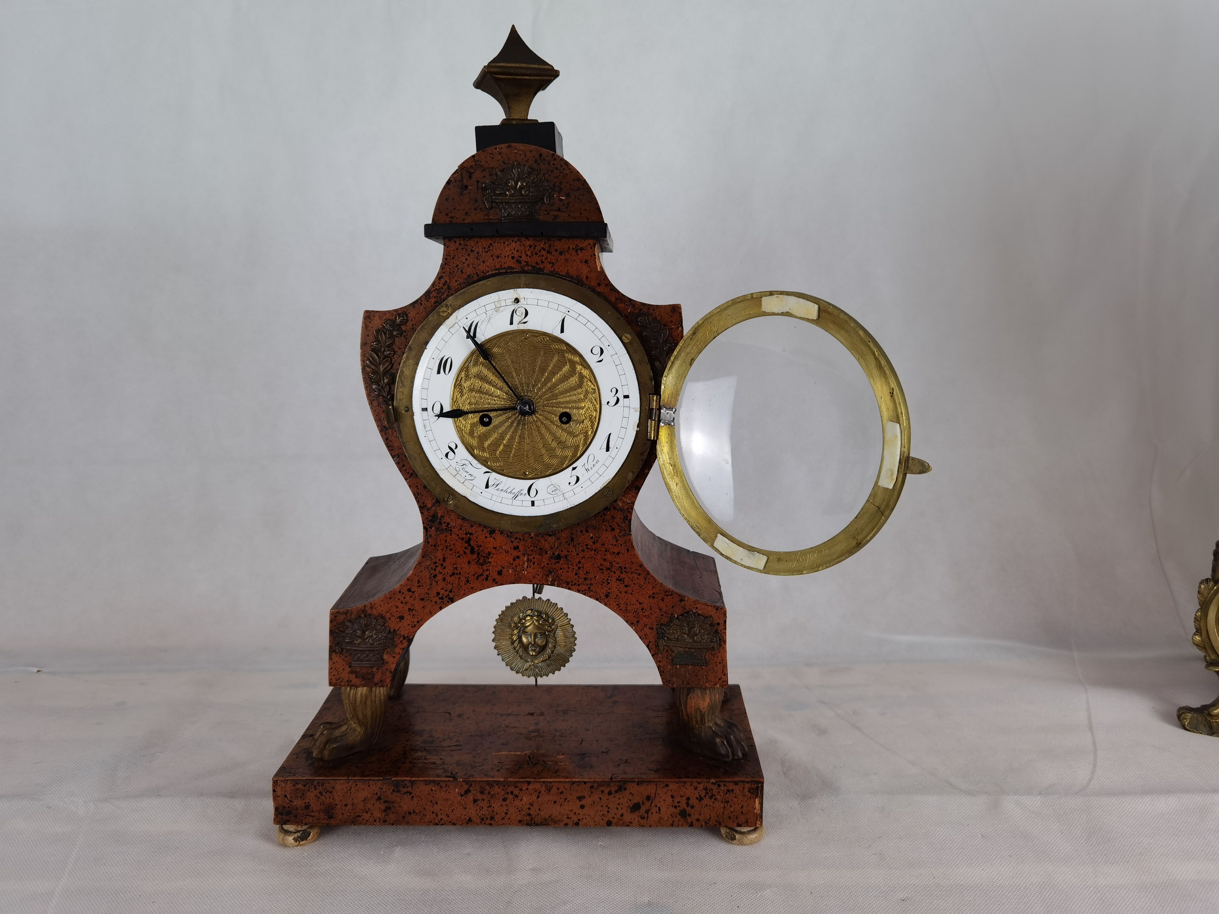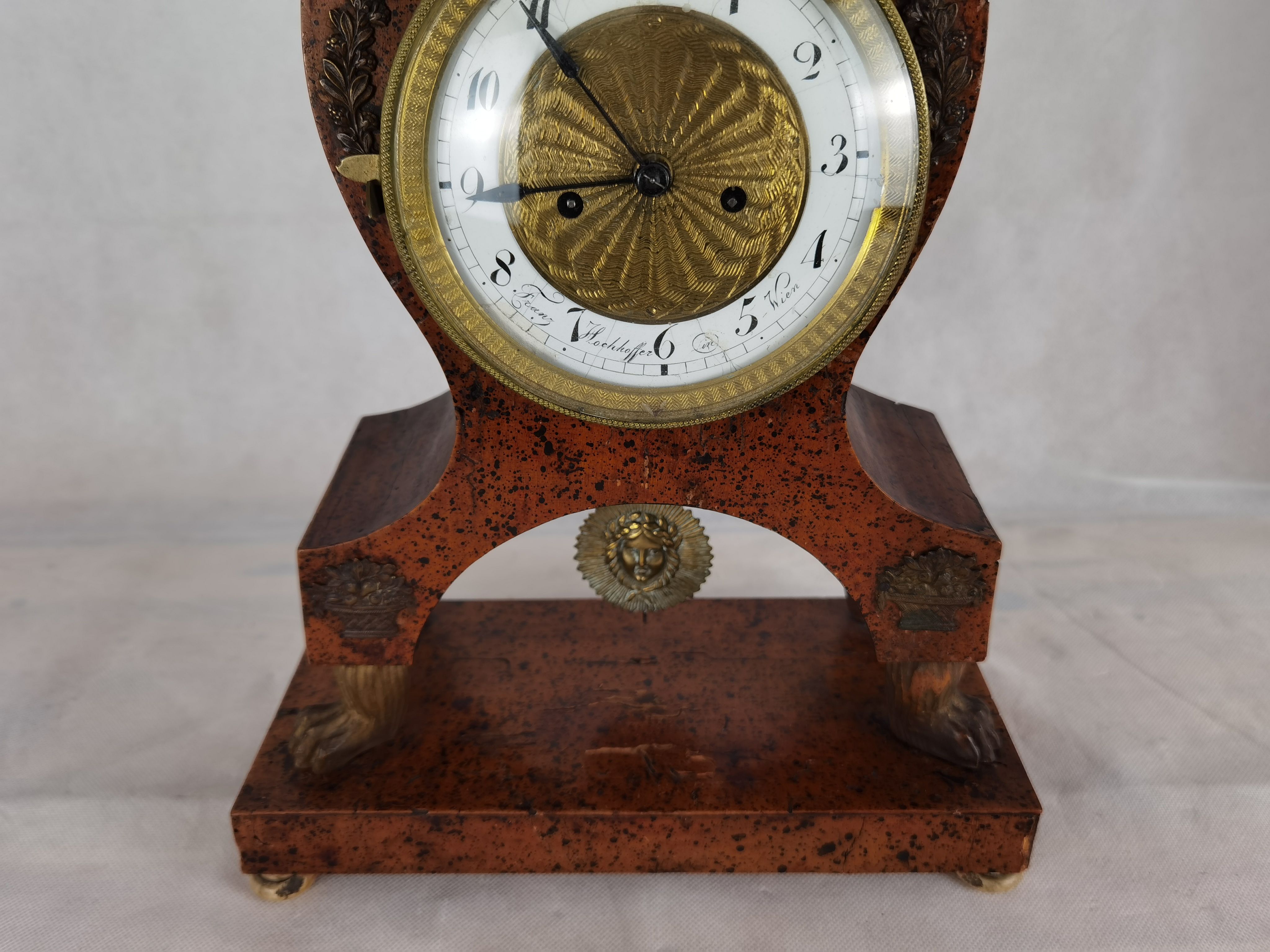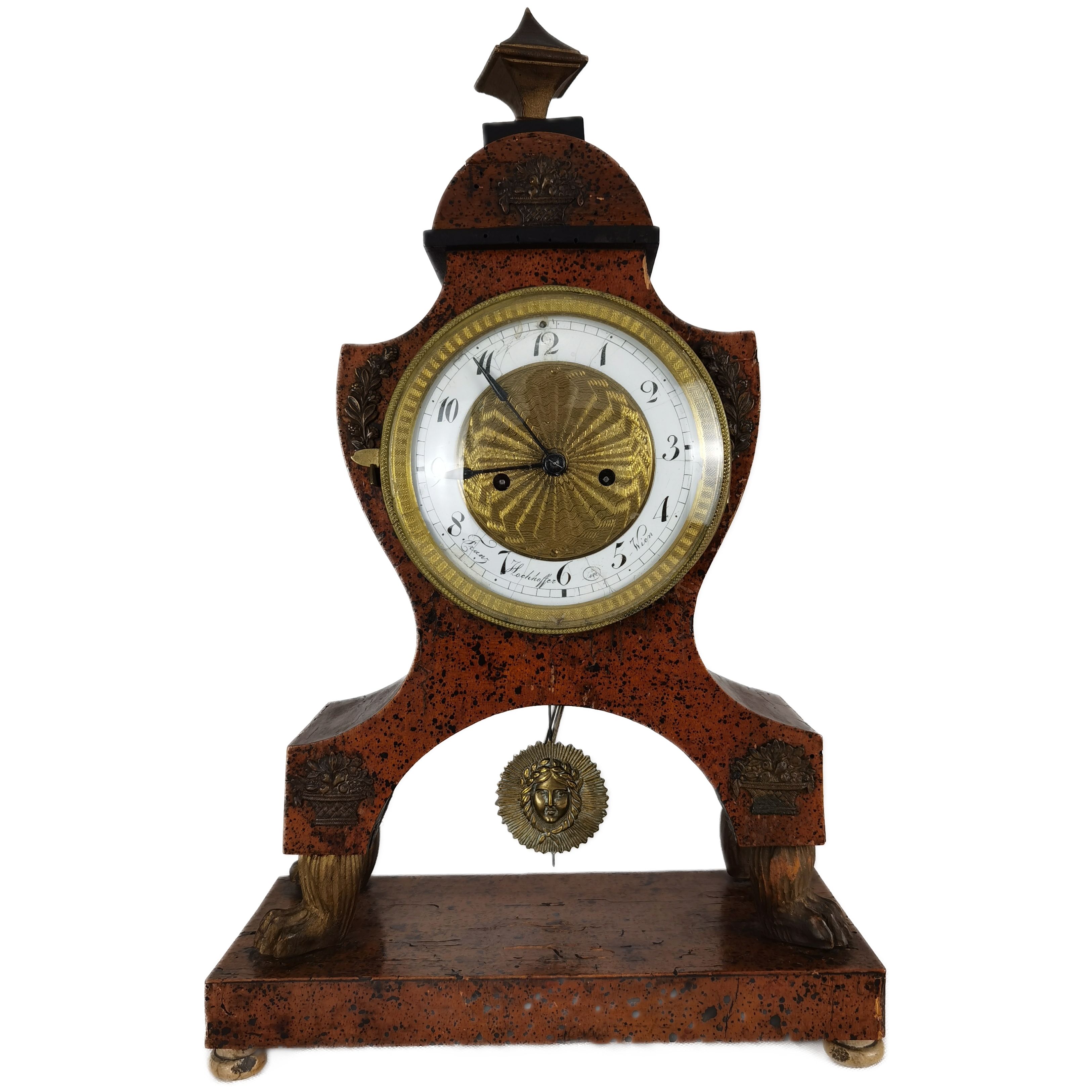 Beschreibung/description: Antike Uhr Wien Biedermeier signiert um 1820. Das Ziffernblatt ist signiert mit „Franz Hochhoffer in Wien“. Geschnitzte Elemente wie die Löwen Füßchen und Messing Sonnen Pendel, Zifferblatt und Blumenkörbchen auf dem Gehäuse. Das Uhrwerk hat Fadenaufhängung. ArtikelNummer /number: uh111
