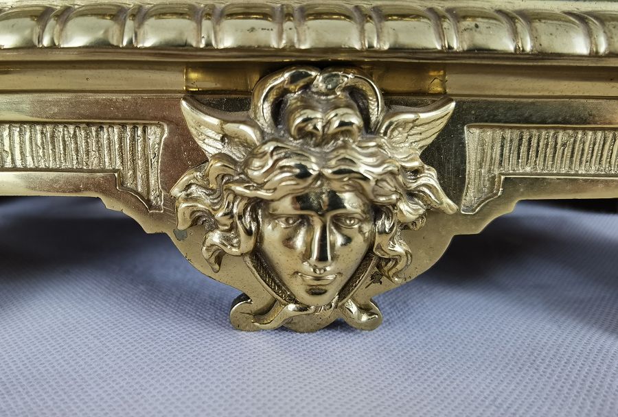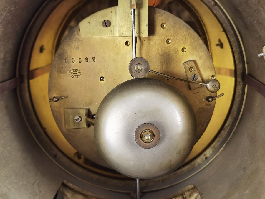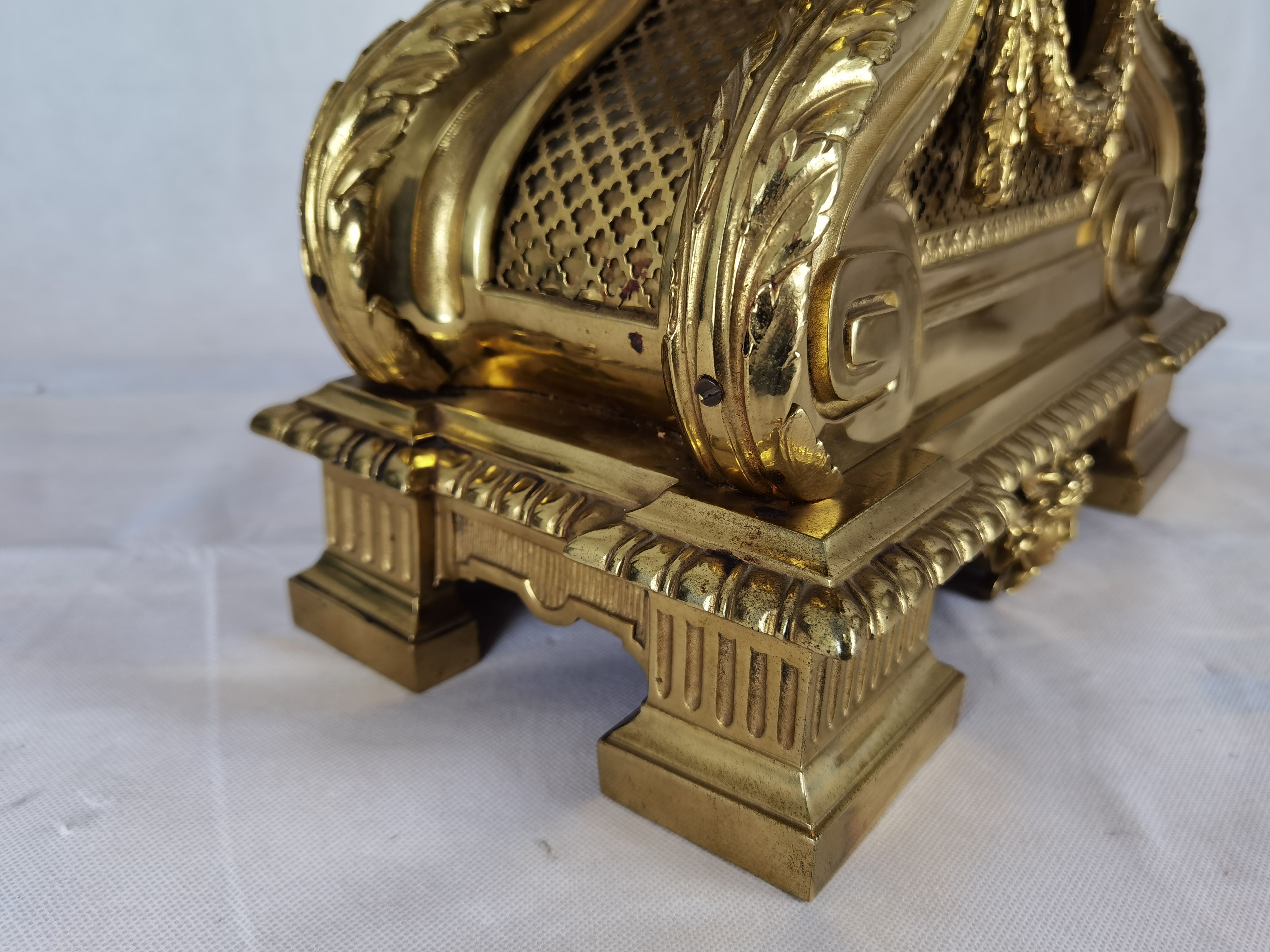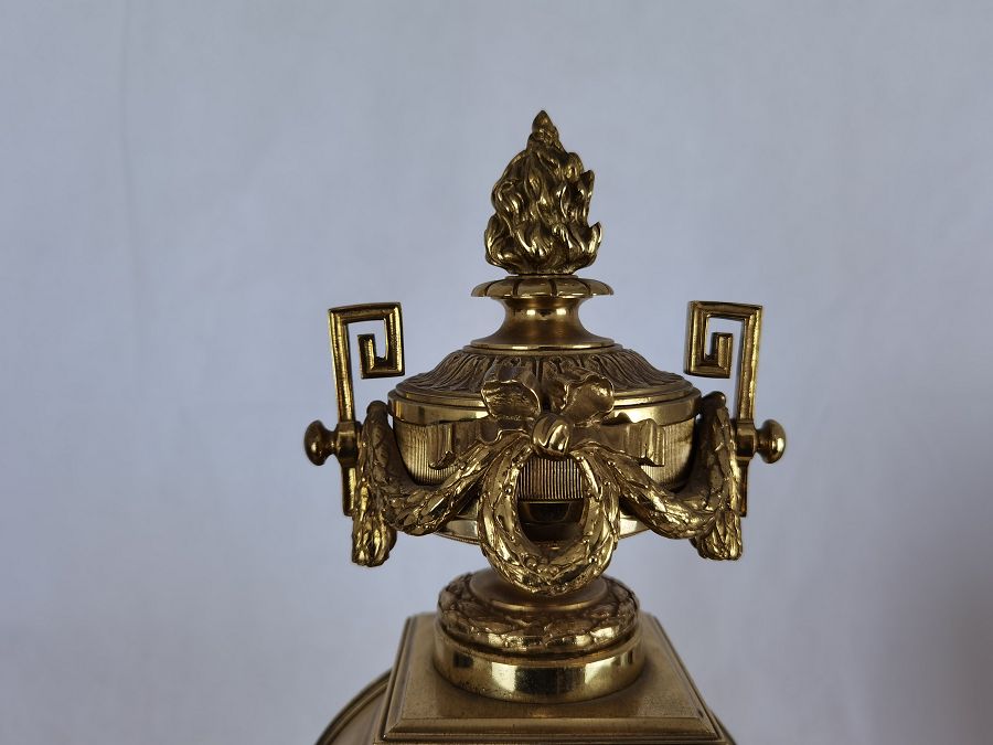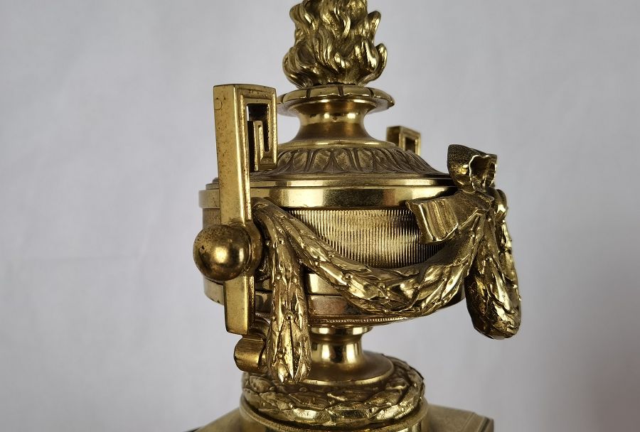 für die Minuten. Das Uhrwerk ist auf der Platine mit der Signatur des Uhrmachers "Hymarg Paris" versehen. Dieses sorgfältig gearbeitete Stück ist mit einer Schale versehen, die das ewige Feuer enthält. Auf beiden Seiten sind Löwenköpfe die mit Trageringen versehen. Der Zylinder des Uhrwerks wird von Konsolen aus Akanthusblättern getragen. Das Ganze ruht auf einer gestuften Basis mit rechteckigem Querschnitt. |