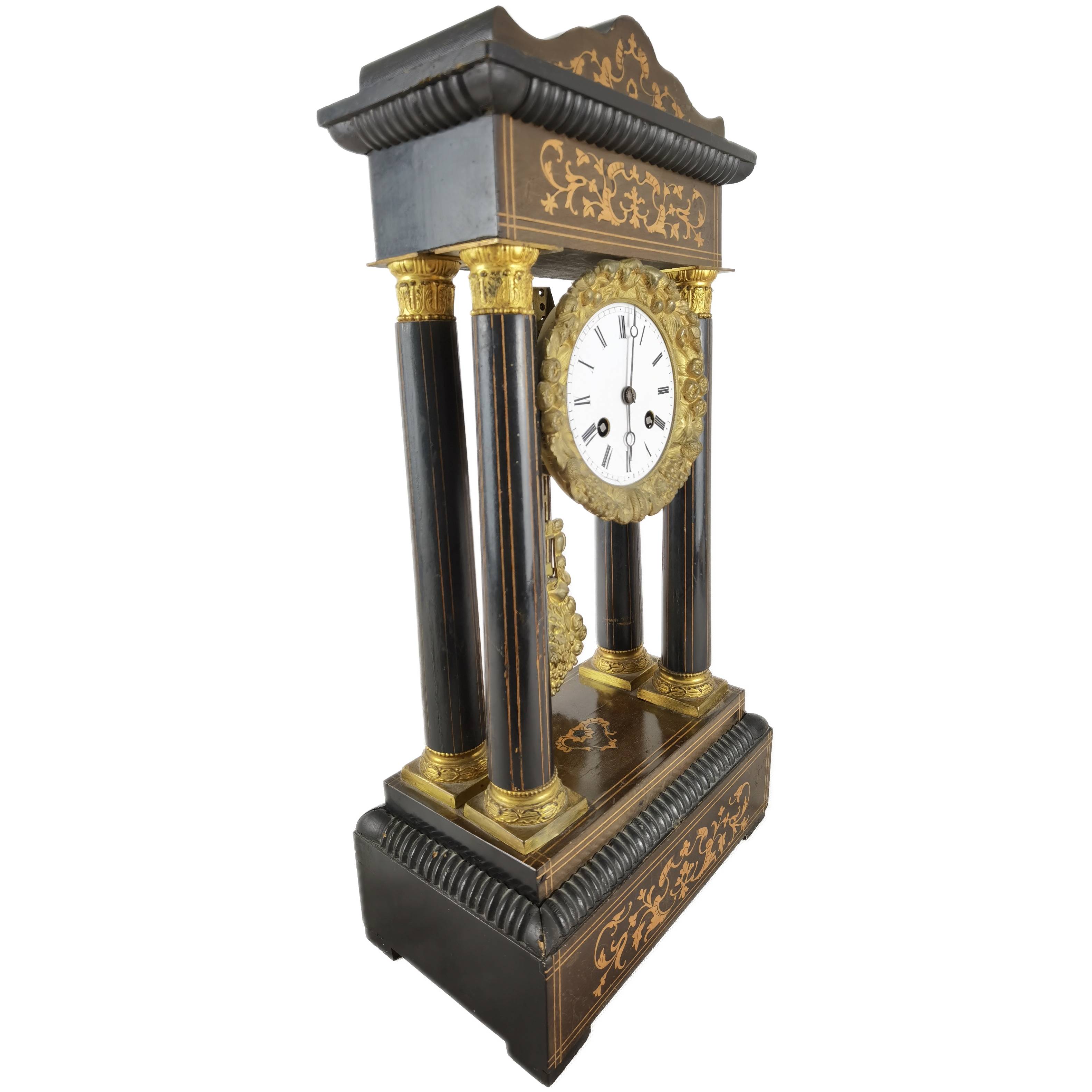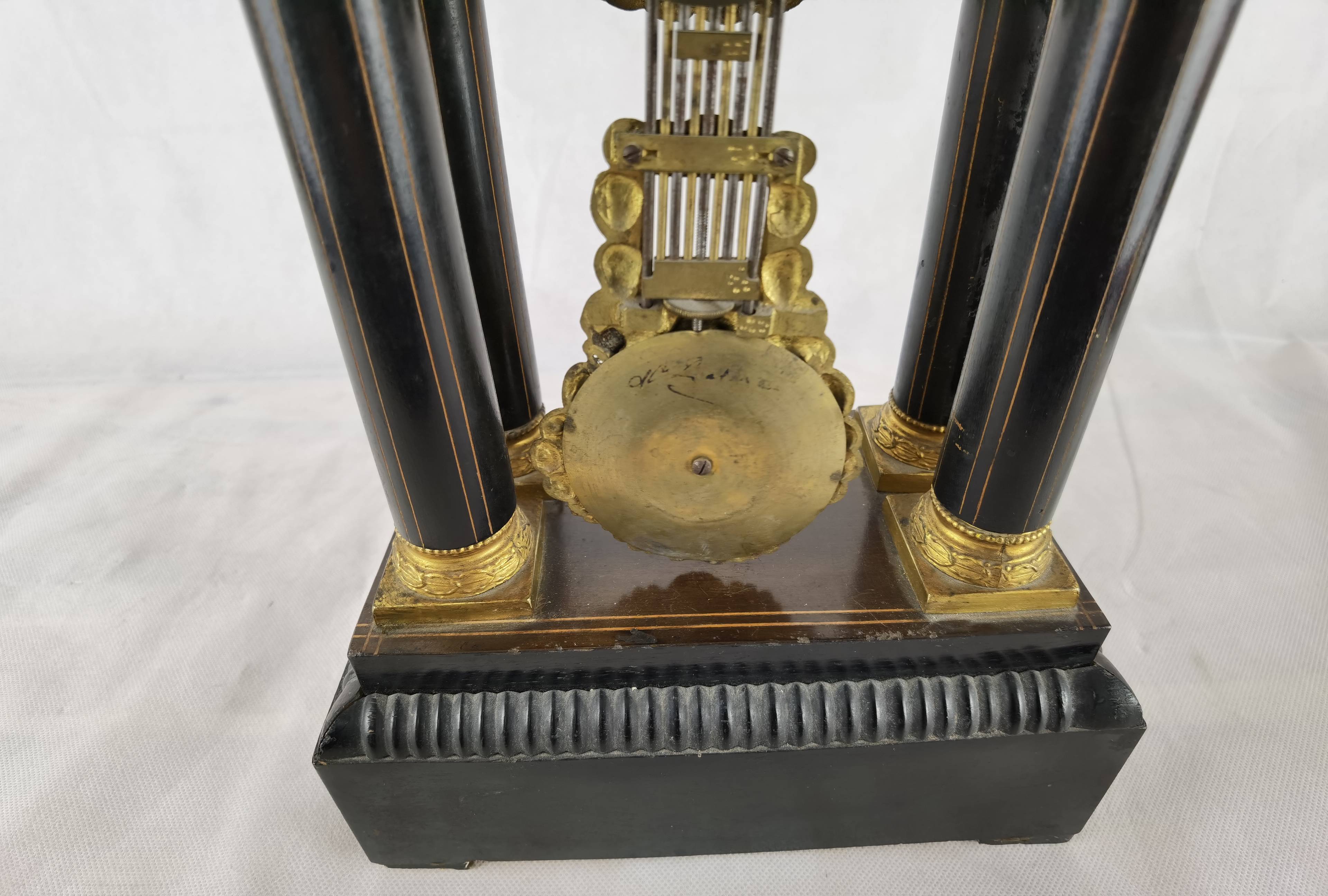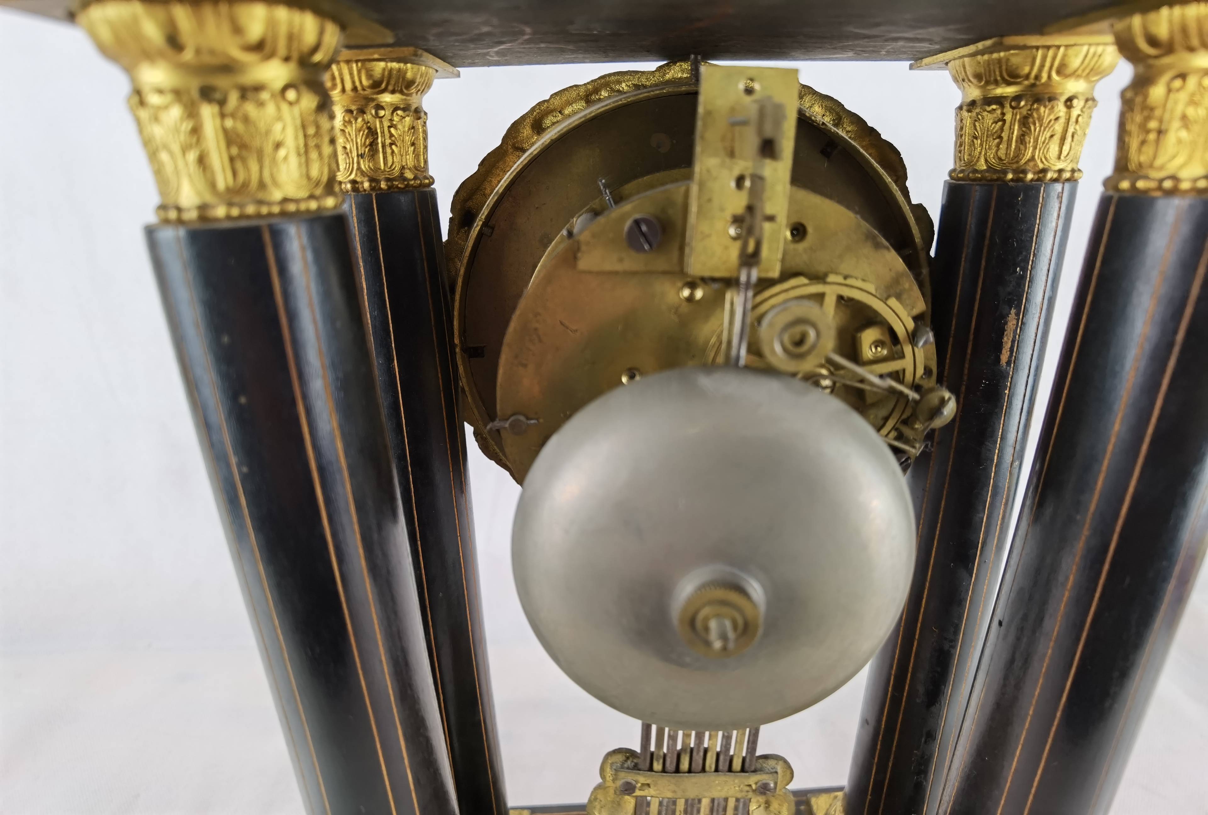 Beschreibung/description: Antike französische Säulenuhr, signiert „Japy Frères, Paris“, um 1840/50 Elegante Pendeluhr mit achttägigem Federzugwerk und klassischem Aufbau in viersäuliger Architektur. Das Uhrwerk verfügt über Stunden- und Halbstundenschlag auf Glocke sowie eine Pendelfederaufhängung. Das Emailzifferblatt mit römischen Ziffern ist von vergoldeter Bronzelunette eingefasst und mit feinen gebläuten Stahlzeigern ausgestattet. Auch die reich verzierte Pendellinse besteht aus feuervergoldeter Bronze. Das sorgfältig gearbeitete Holzgehäuse zeigt kunstvolle Marketerie-Intarsien im Biedermeier-Stil und ist mit dekorativen Bronzeapplikationen veredelt. Die vier schwarzen Säulen mit vergoldeten Basen und Kapitellen verleihen der Uhr einen repräsentativen, klassizistisch inspirierten Charakter.