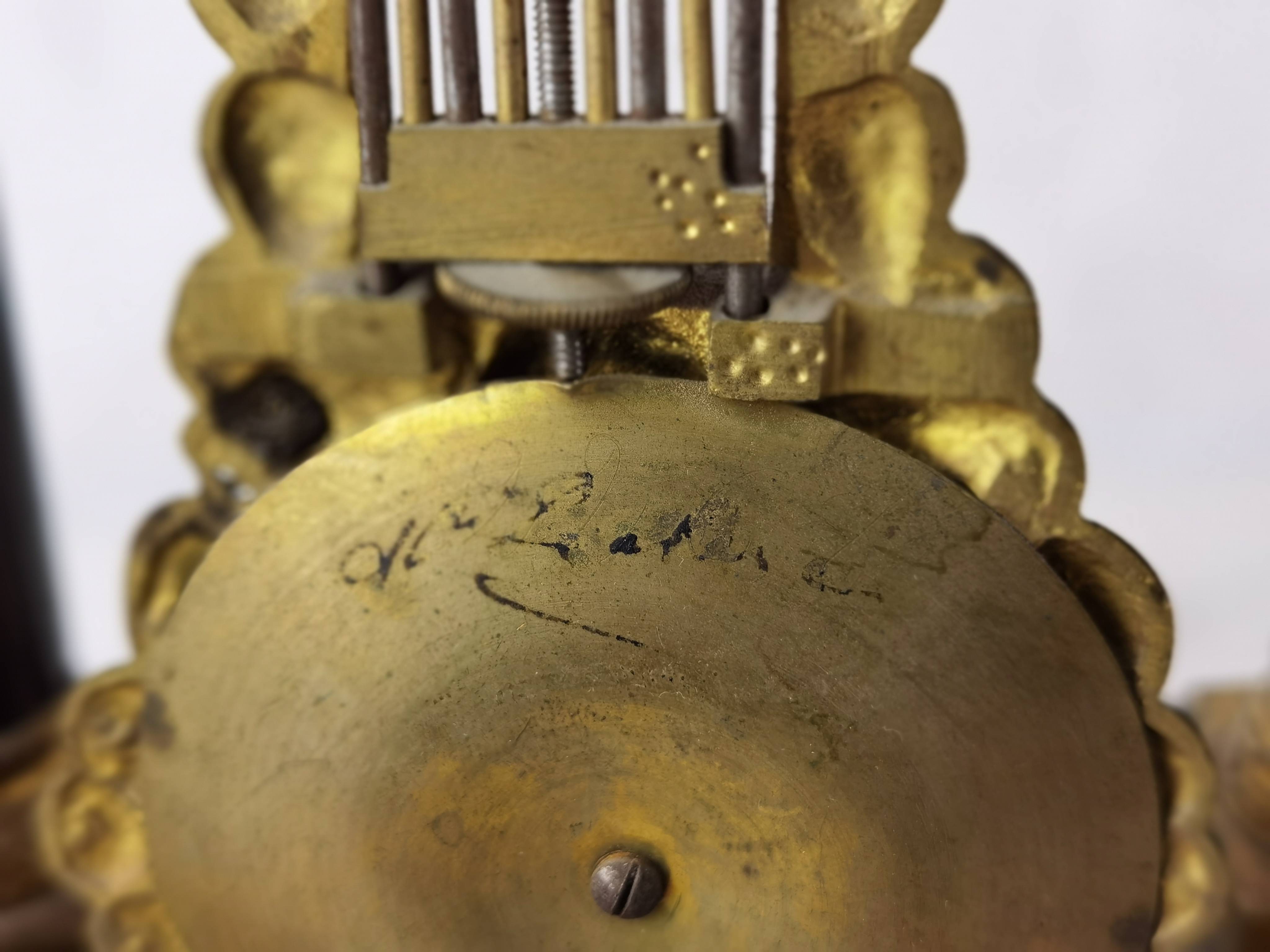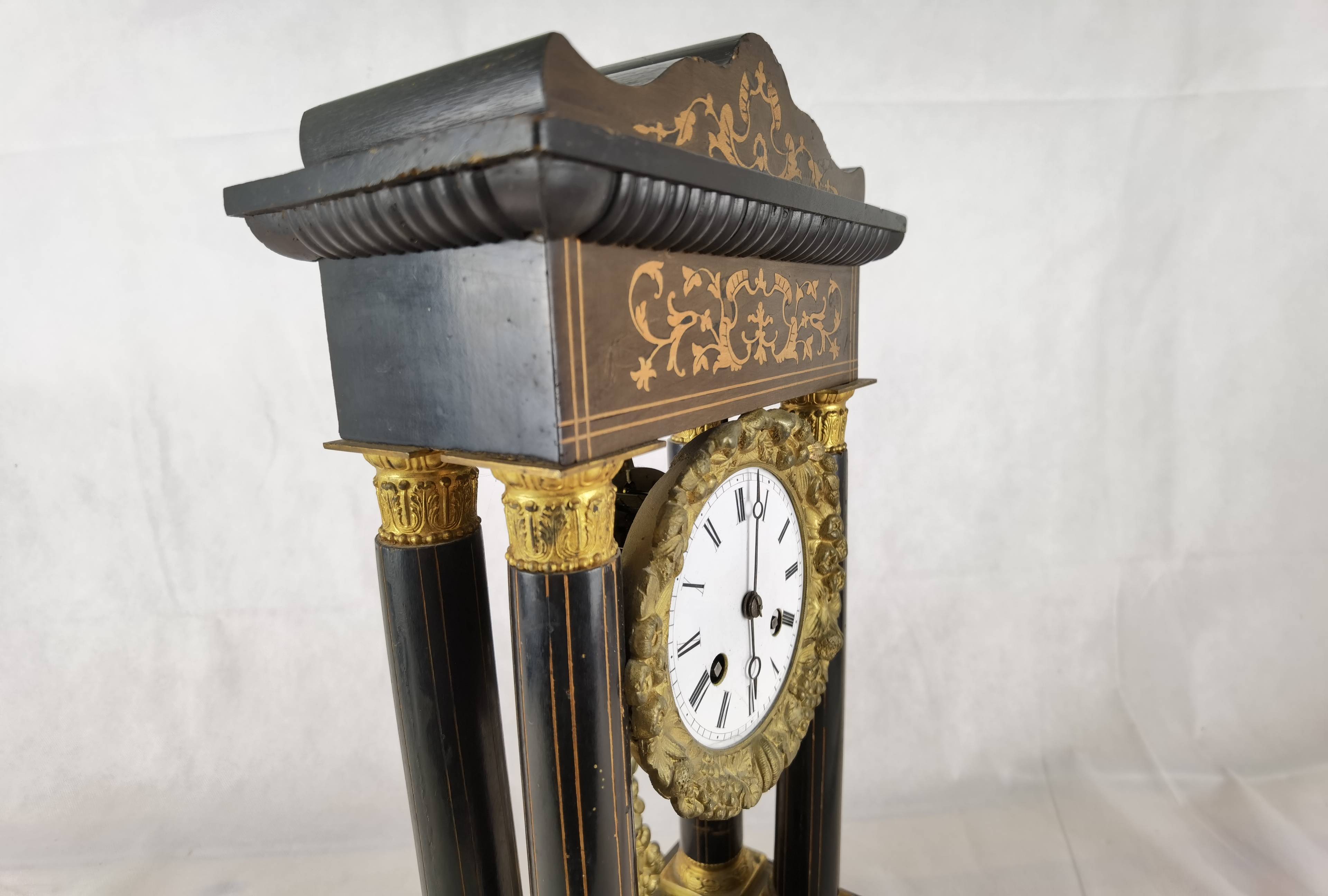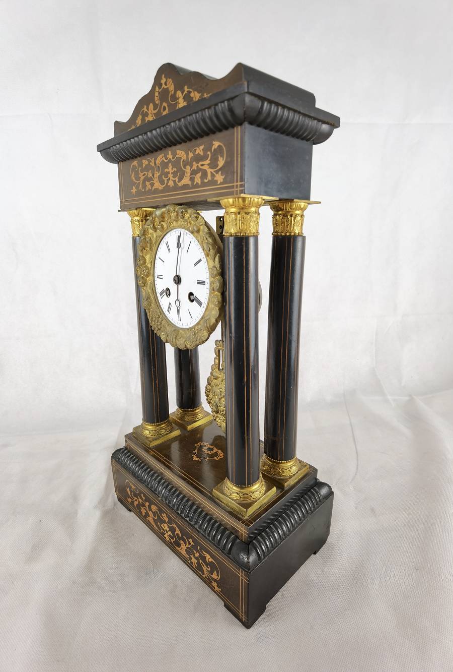 Beschreibung/description: Antike französische Säulenuhr, signiert „Japy Frères, Paris“, um 1840/50 Elegante Pendeluhr mit achttägigem Federzugwerk und klassischem Aufbau in viersäuliger Architektur. Das Uhrwerk verfügt über Stunden- und Halbstundenschlag auf Glocke sowie eine Pendelfederaufhängung. Das Emailzifferblatt mit römischen Ziffern ist von vergoldeter Bronzelunette eingefasst und mit feinen gebläuten Stahlzeigern ausgestattet. Auch die reich verzierte Pendellinse besteht aus feuervergoldeter Bronze. Das sorgfältig gearbeitete Holzgehäuse zeigt kunstvolle Marketerie-Intarsien im Biedermeier-Stil und ist mit dekorativen Bronzeapplikationen veredelt. Die vier schwarzen Säulen mit vergoldeten Basen und Kapitellen verleihen der Uhr einen repräsentativen, klassizistisch inspirierten Charakter.
