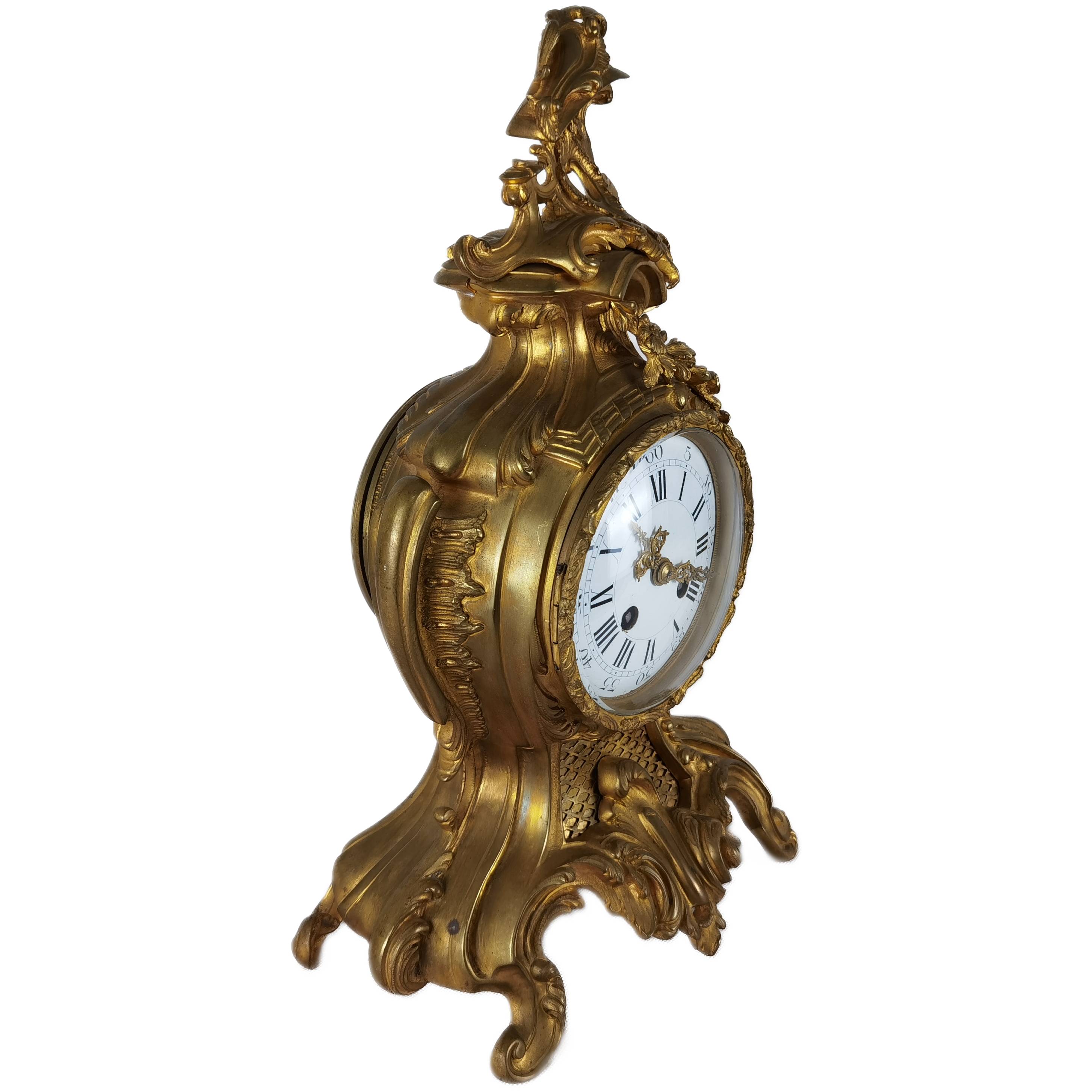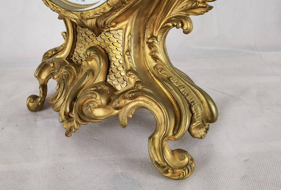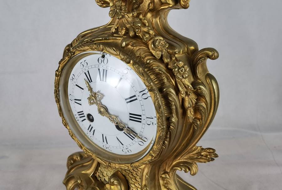 Beschreibung/description: Diese elegante französische Pendule aus dem 19. Jahrhundert präsentiert sich in einem prachtvollen Rokoko-Design mit reichem, geschwungenem Dekor und fein ausgearbeiteten Ornamenten. Das Gehäuse besteht aus feuervergoldetem Bronze (Ormolu) und zeigt die typischen asymmetrischen Formen und floralen Elemente dieser Epoche. Das Emailzifferblatt mit römischen Stunden- und arabischen Minutenangaben ist sehr gut erhalten und verfügt über fein gearbeitete, vergoldete Zeiger. Die Uhr vermittelt einen eindrucksvollen dekorativen Charakter und ist ein klassisches Beispiel französischer Handwerkskunst. Es handelt sich um ein klassisches 8-Tage-Federwerk, typischerweise mit Halbstunden- und Stundenschlag auf Glocke (Gong oder Schale), wie es in französischen Pendulen dieser Zeit üblich ist. ArtikelNummer /number: uhr117