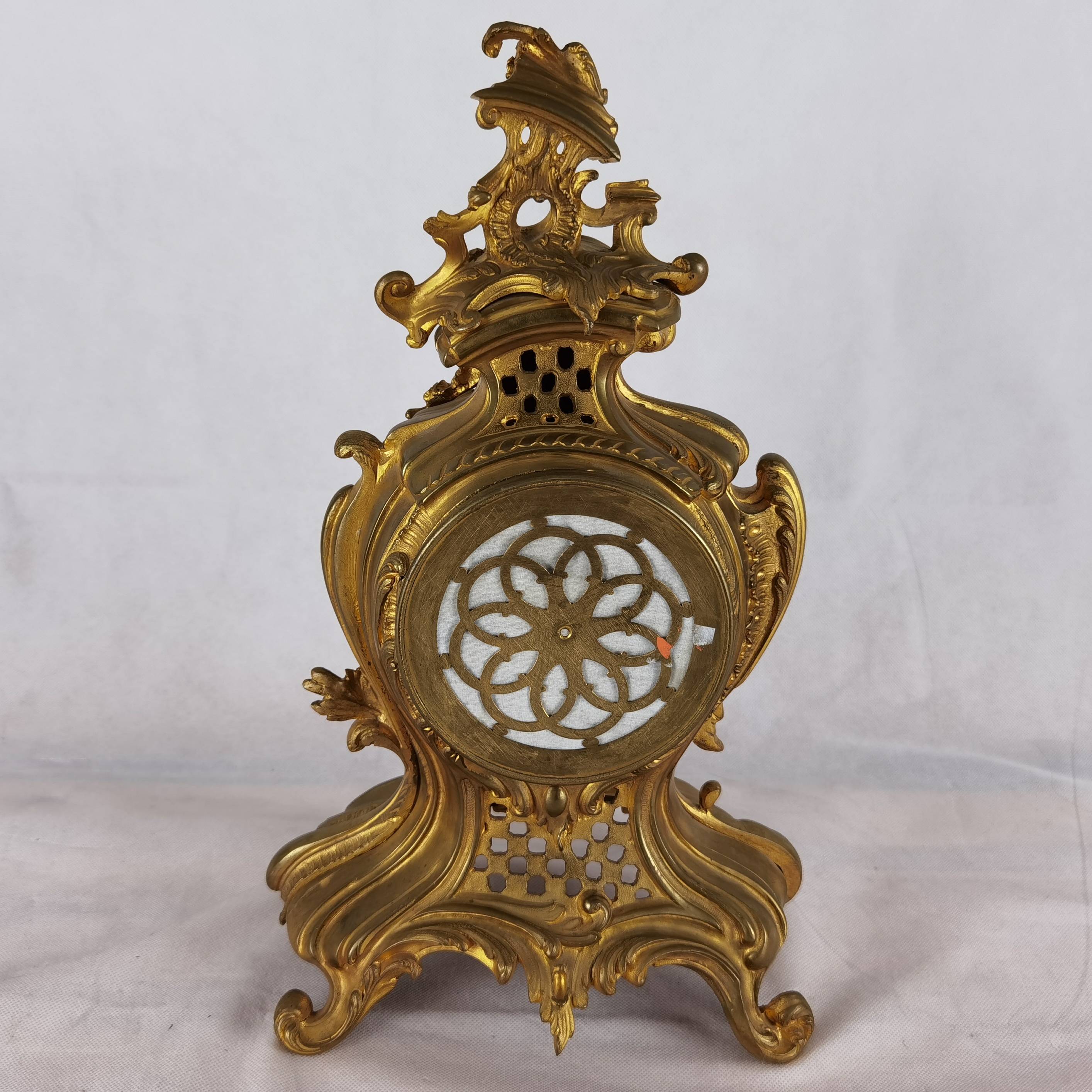 Antike Neorokoko Pendule Bronze, vergoldet 19 Jh. Diese elegante französische Pendule aus dem 19. Jahrhundert präsentiert sich in einem prachtvollen Rokoko-Design mit reichem, geschwungenem Dekor und fein ausgearbeiteten Ornamenten. Das Gehäuse besteht aus feuervergoldetem Bronze (Ormolu) und zeigt die typischen asymmetrischen Formen und floralen Elemente dieser Epoche. Das Emailzifferblatt mit römischen Stunden- und arabischen Minutenangaben ist sehr gut erhalten und verfügt über fein gearbeitete, vergoldete Zeiger. Die Uhr vermittelt einen eindrucksvollen dekorativen Charakter und ist ein klassisches Beispiel französischer Handwerkskunst. Es handelt sich um ein klassisches 8-Tage-Federwerk, typischerweise mit Halbstunden- und Stundenschlag auf Glocke (Gong oder Schale), wie es in französischen Pendulen dieser Zeit üblich ist. |
