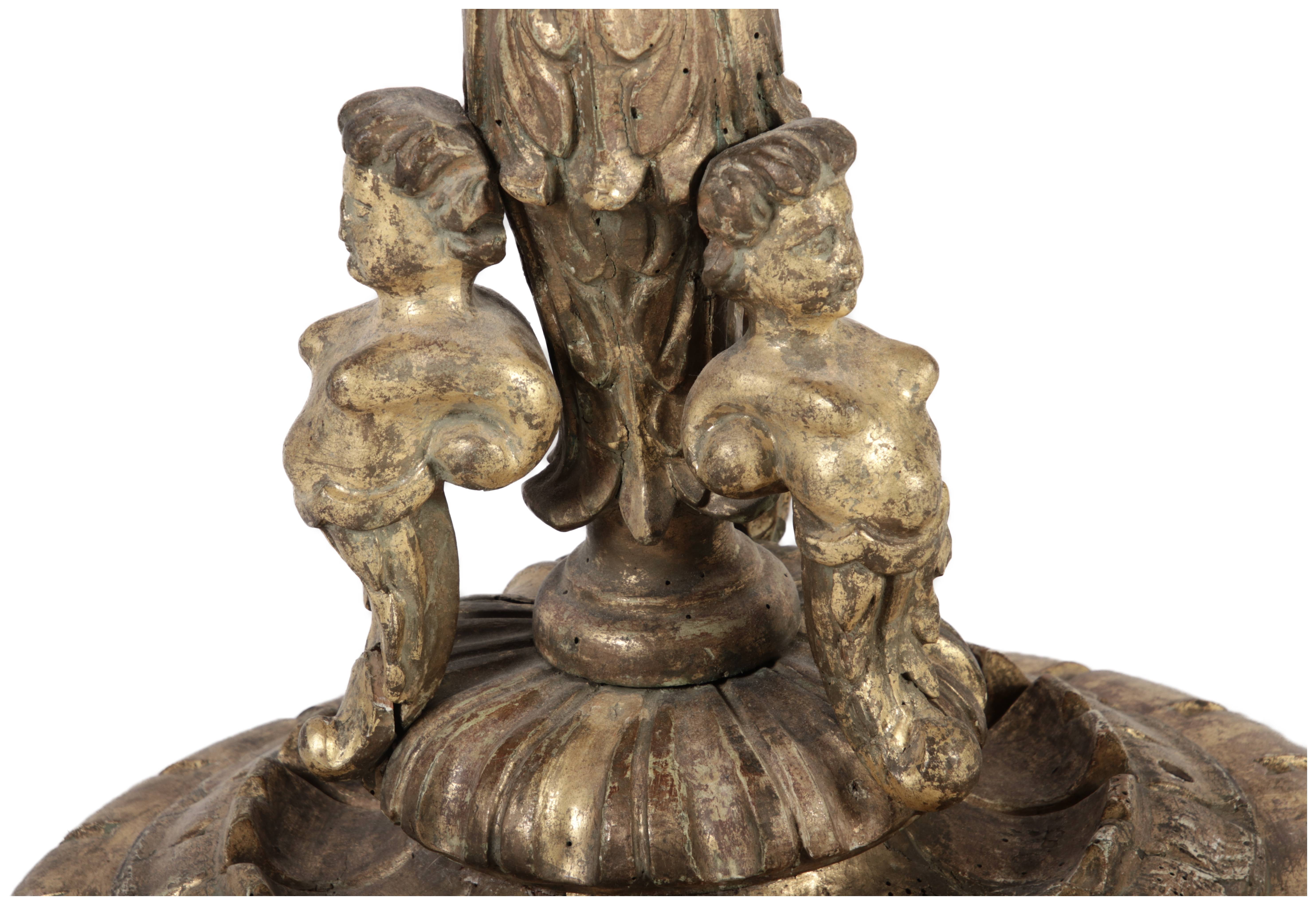 | Antiker 150 cm hoher Bodenleuchter Holz goldgefasst 18 Jh |