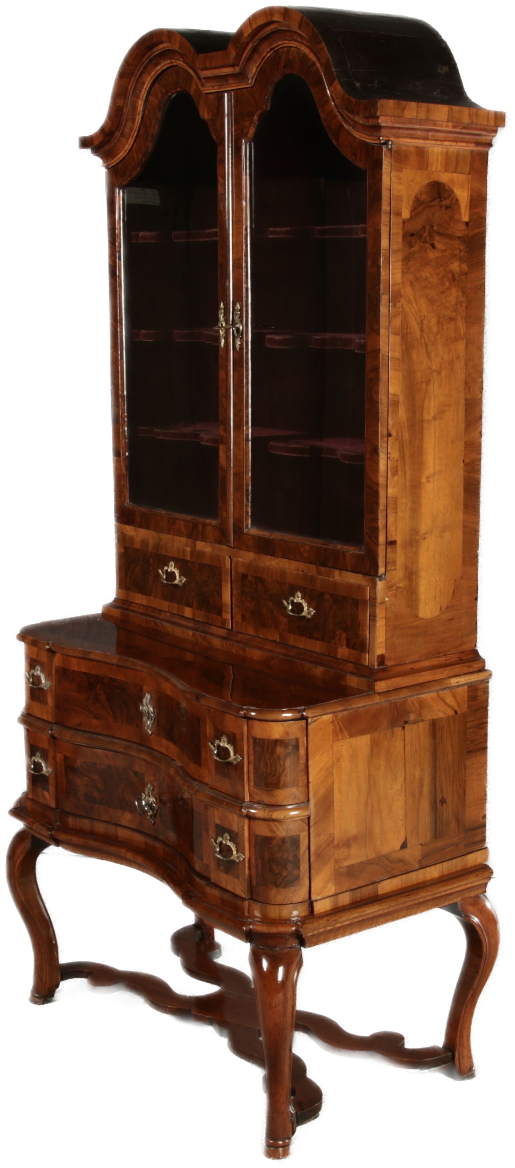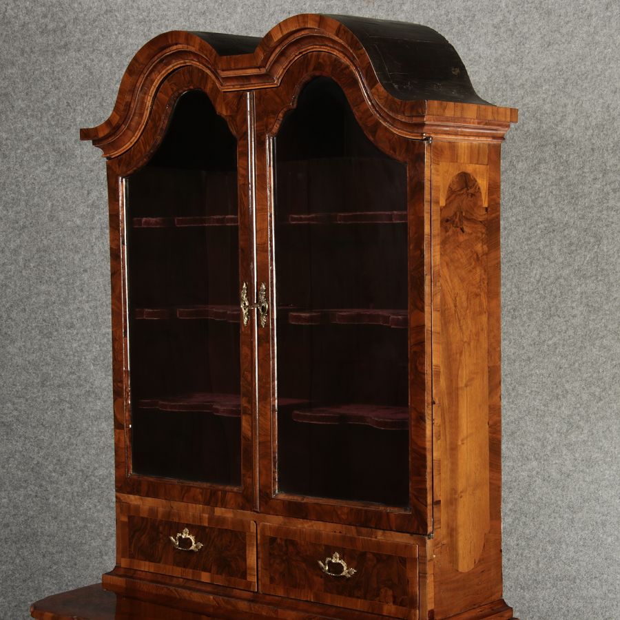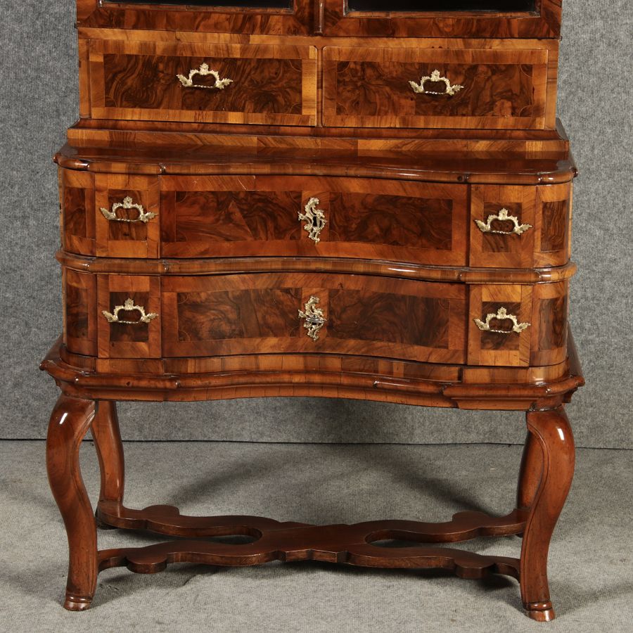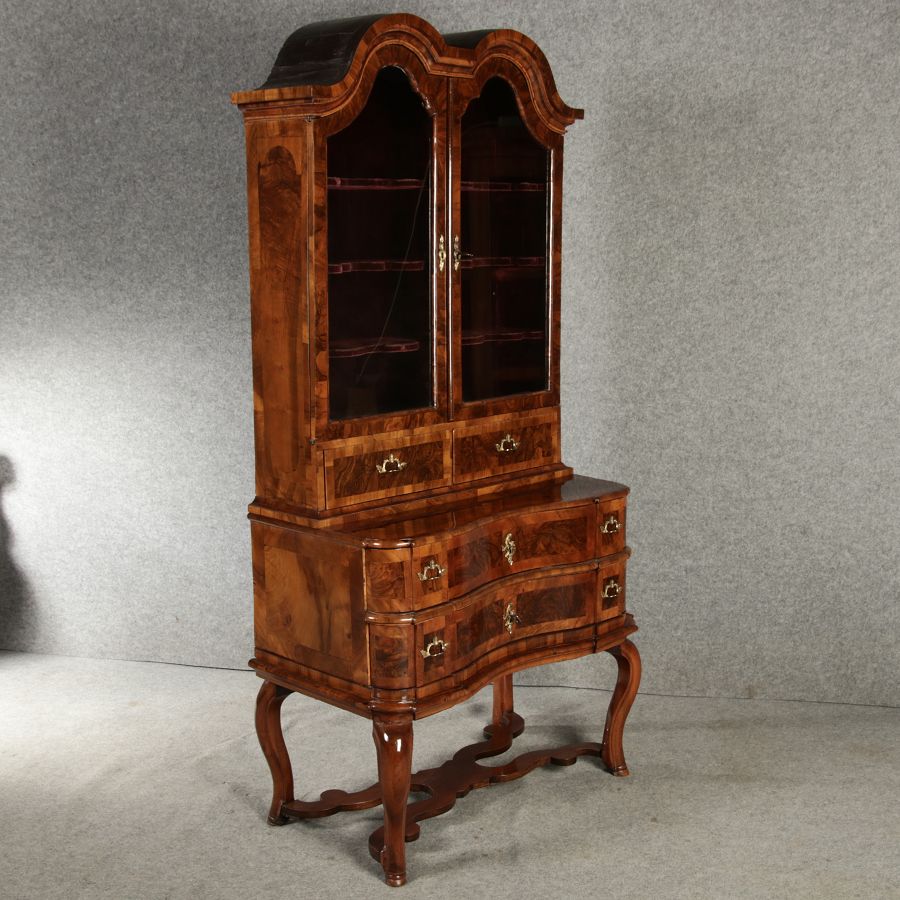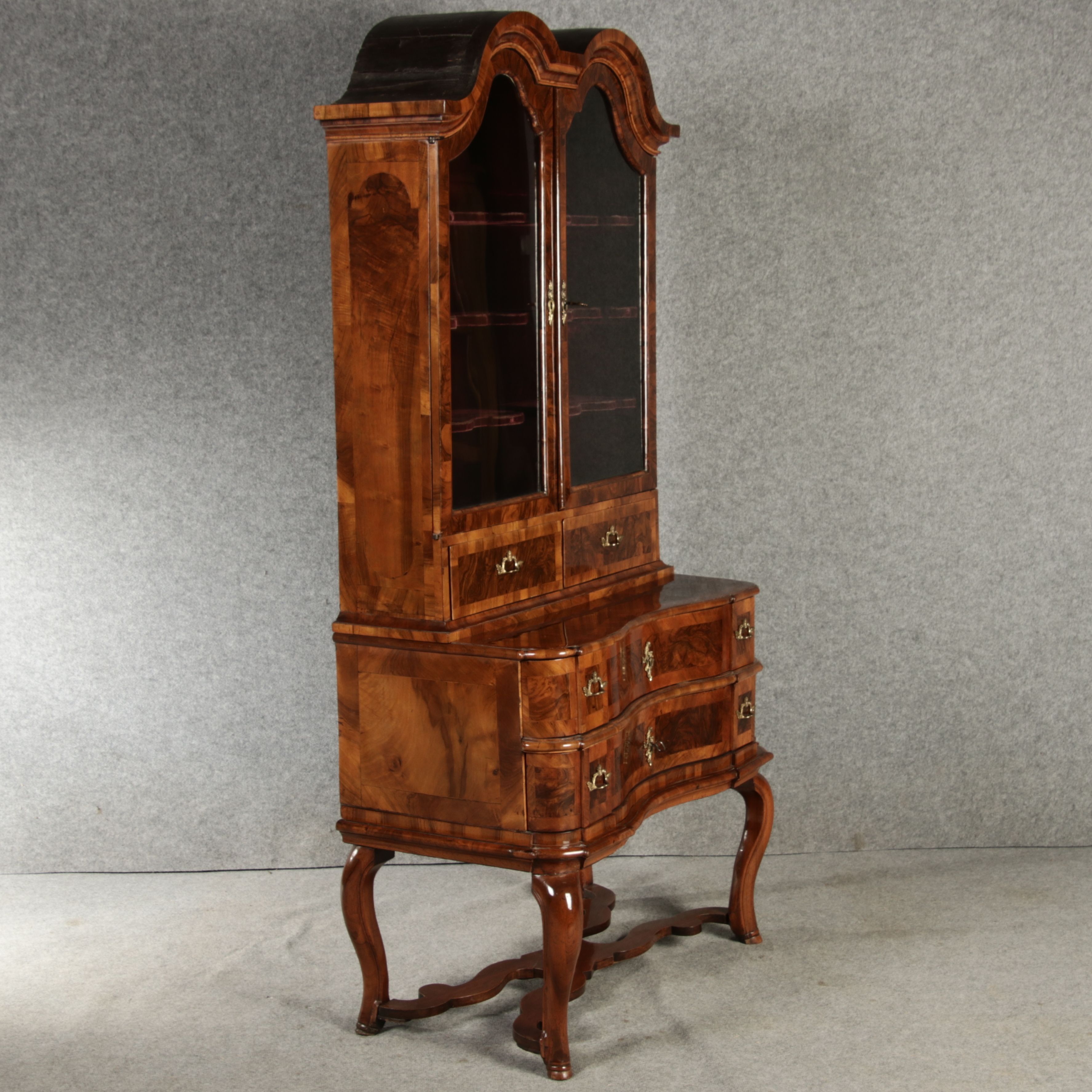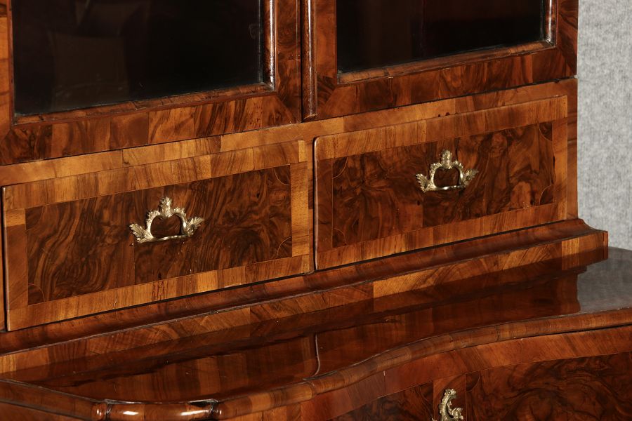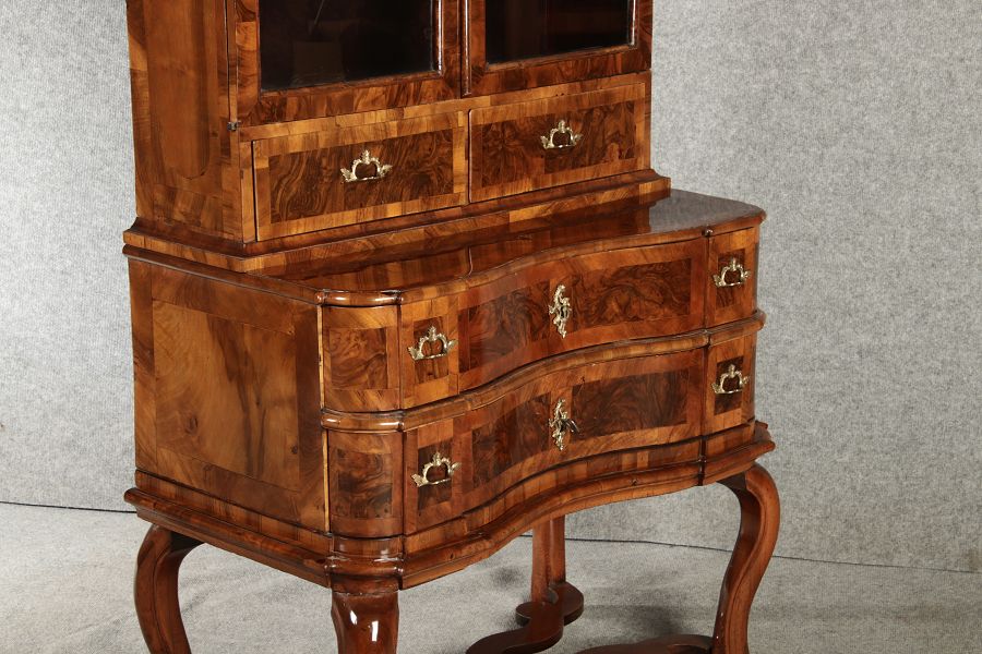 Barock), Nuss, 2-teilig, Untersatz als 2-schübige Kommode a. hohem offen gearbeiteten Sockel, 4 geschweift Beine m. einer flachen Verstrebung, d. Front doppelt geschweift und verkröpft, der Aufsatz mit 2 Schubfächern, darüber Glasteil mit 2 Türen, diese oben doppelt geschweift. Giebel. Rückwand Tannenholz, Oberfläche m. älterer Schellackpolitur. Für XXL Bild hier klicken50 |