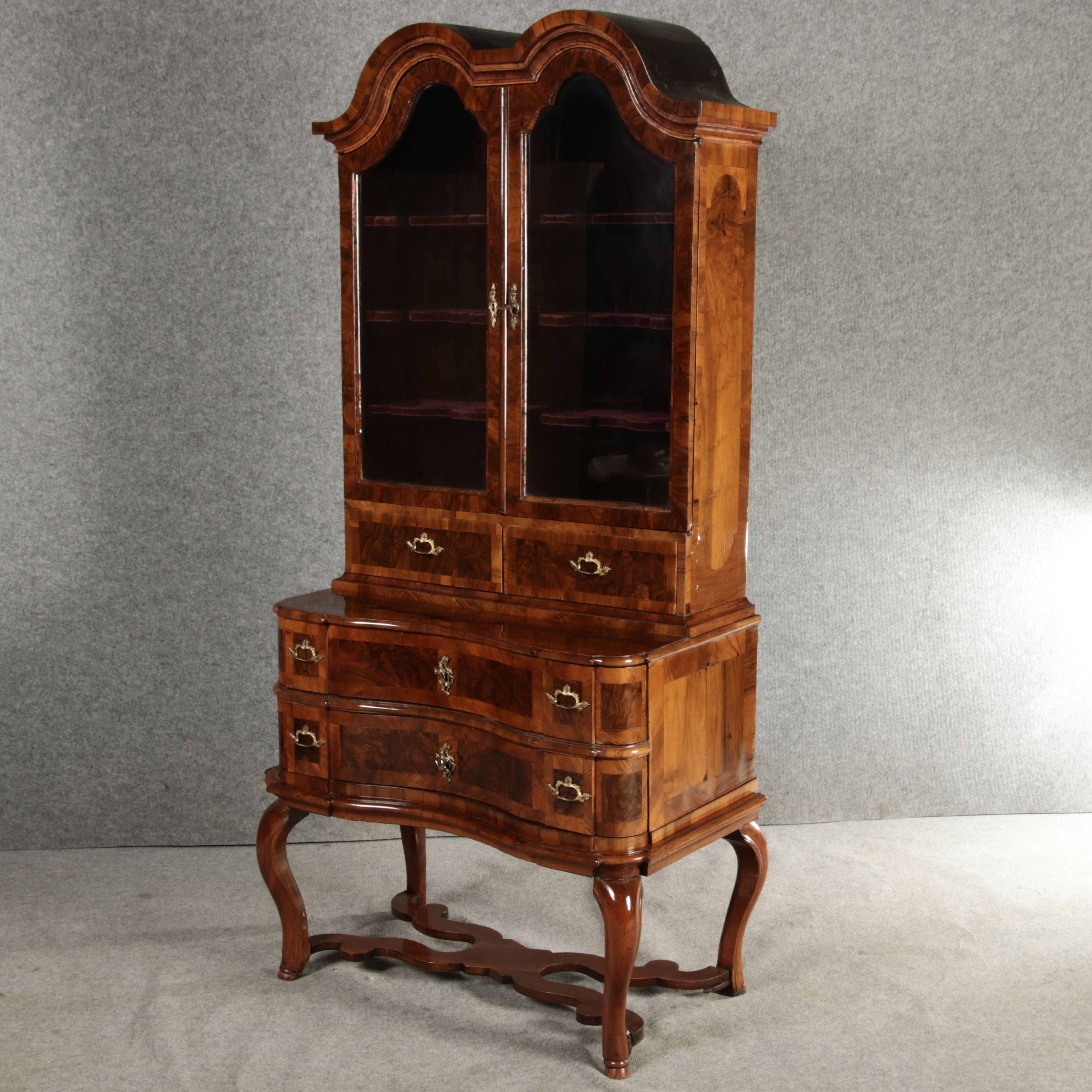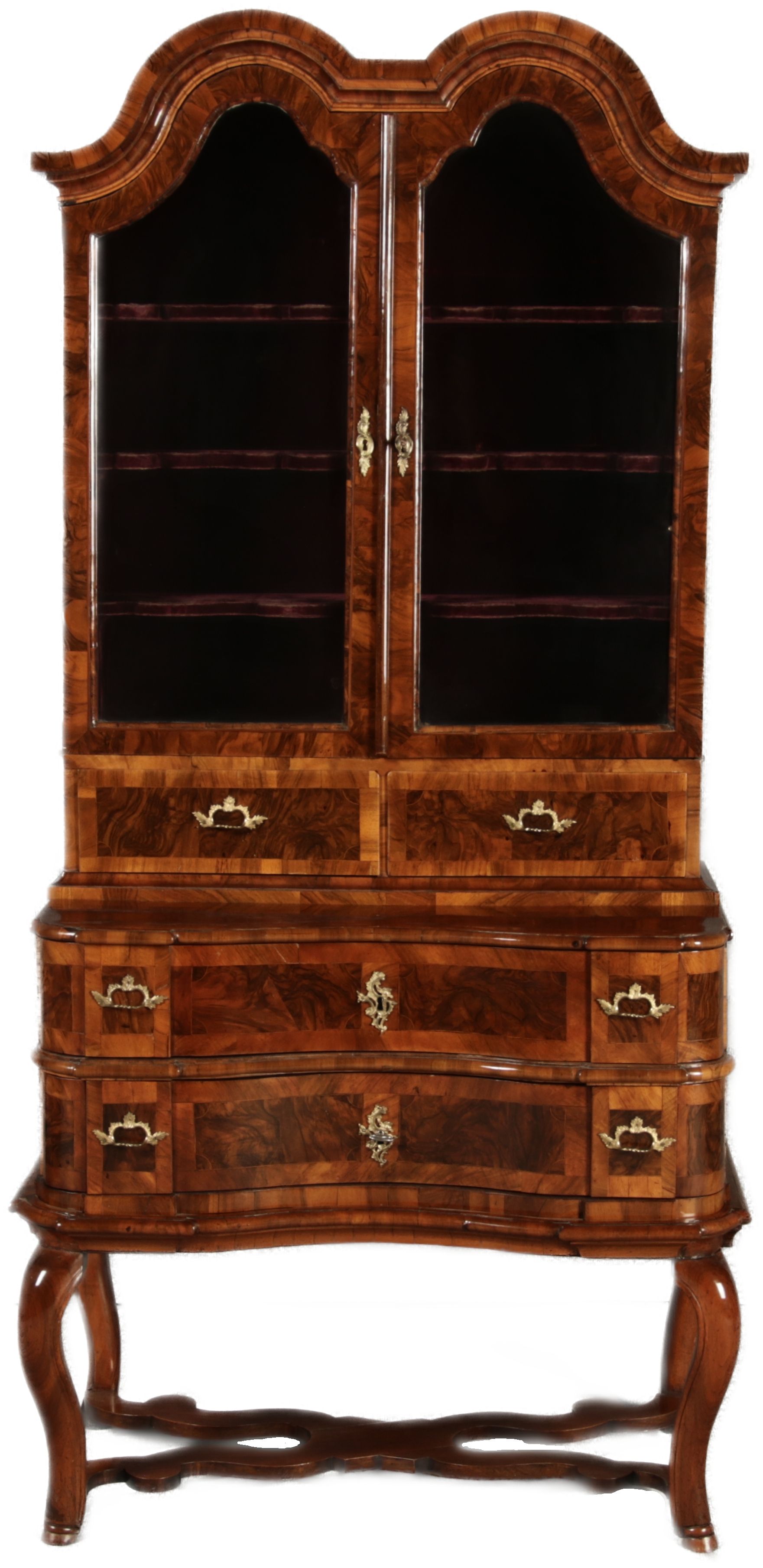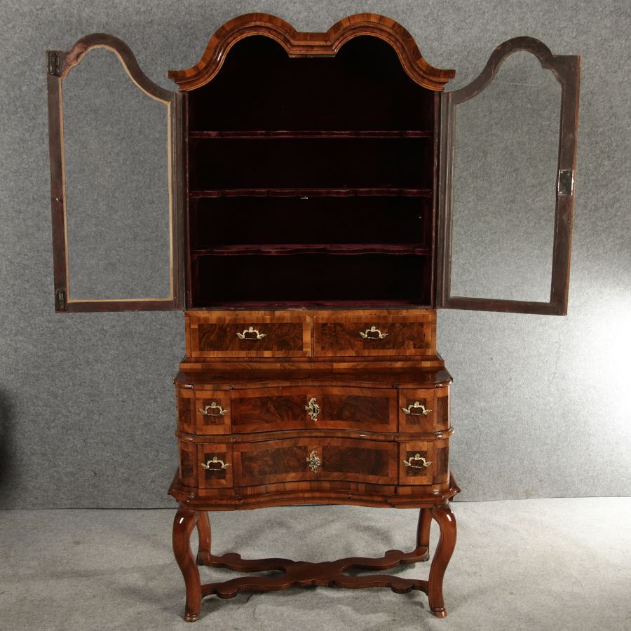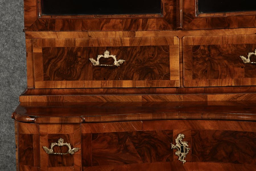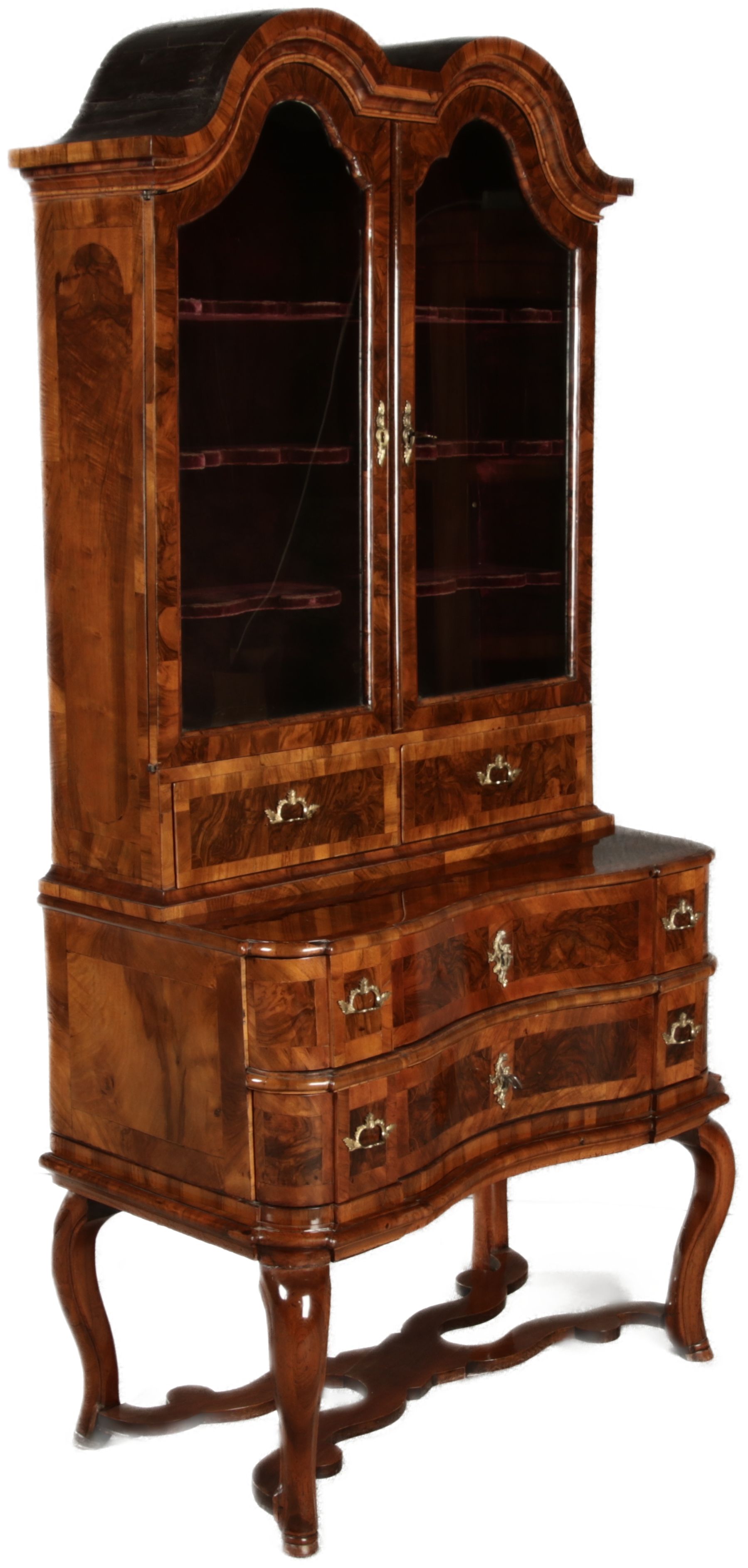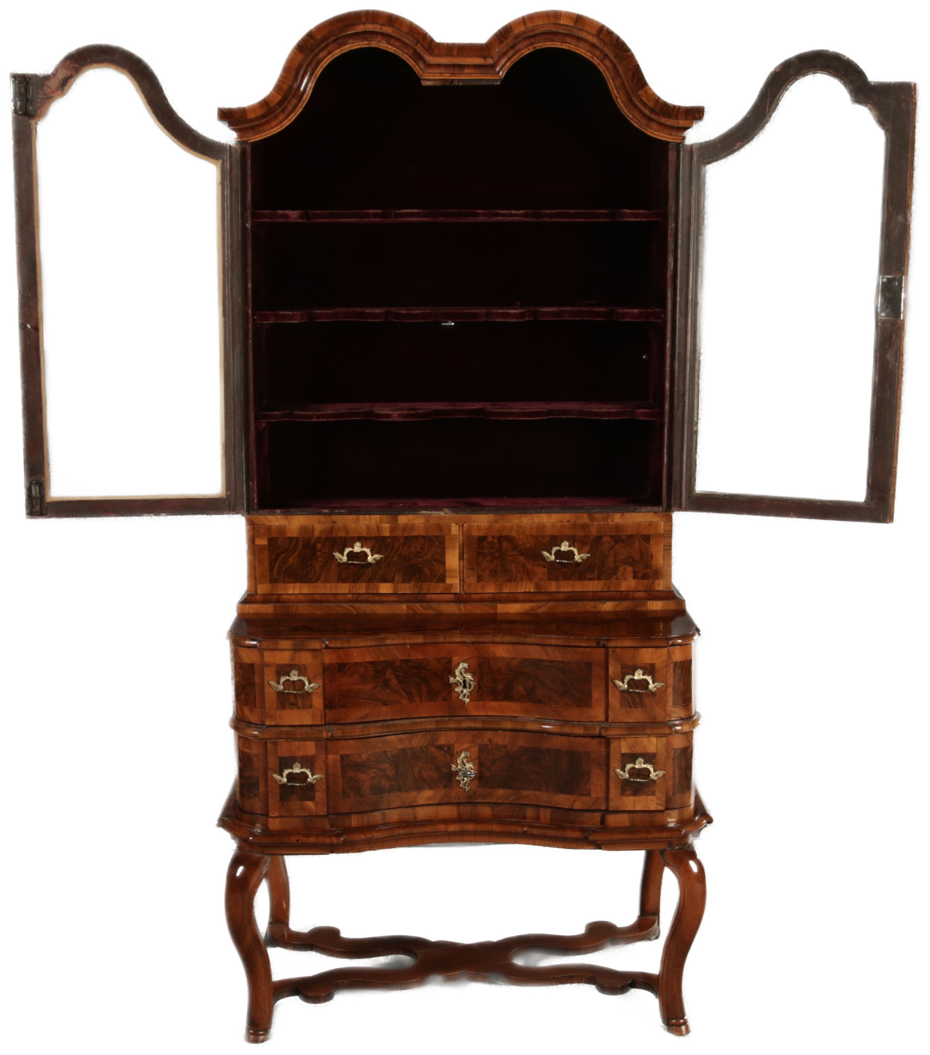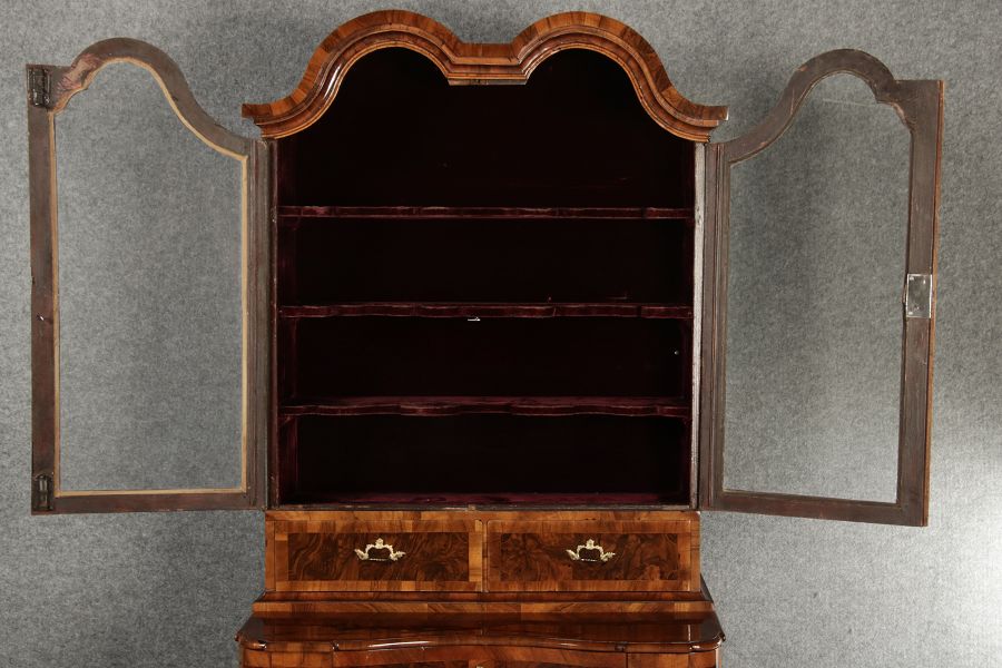 Barock), Nuss, 2-teilig, Untersatz als 2-schübige Kommode a. hohem offen gearbeiteten Sockel, 4 geschweift Beine m. einer flachen Verstrebung, d. Front doppelt geschweift und verkröpft, der Aufsatz mit 2 Schubfächern, darüber Glasteil mit 2 Türen, diese oben doppelt geschweift. Giebel. Rückwand Tannenholz, Oberfläche m. älterer Schellackpolitur. Für XXL Bild hier klicken50 |
