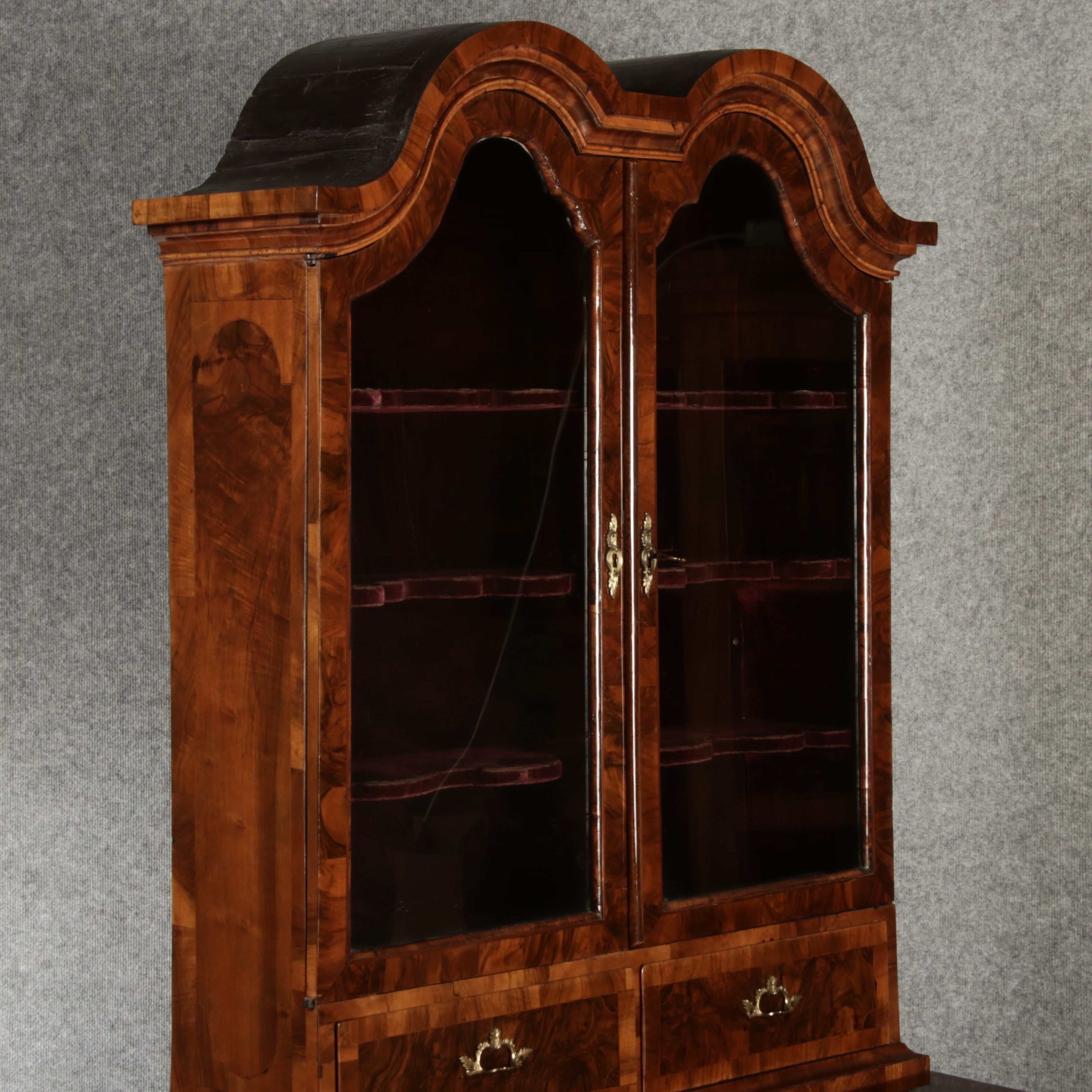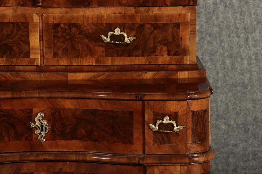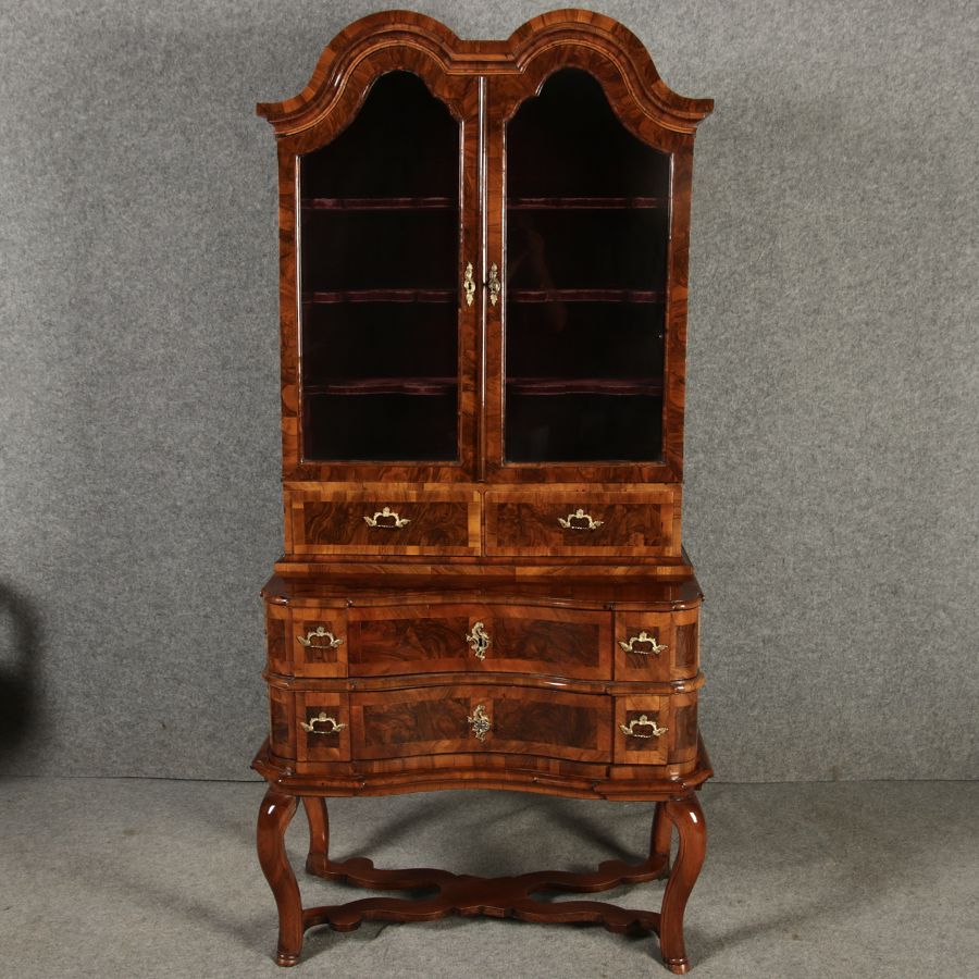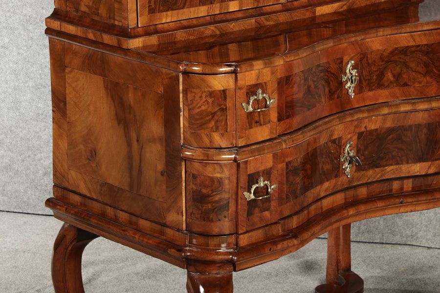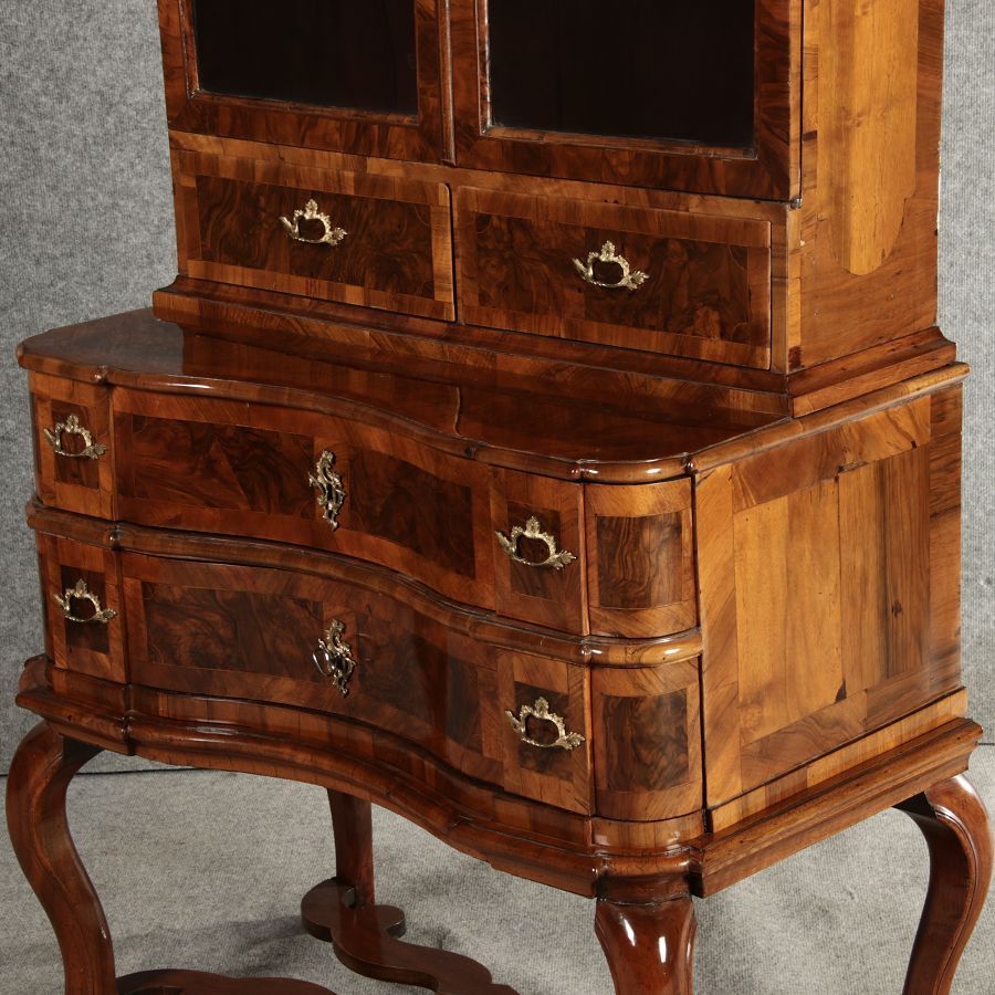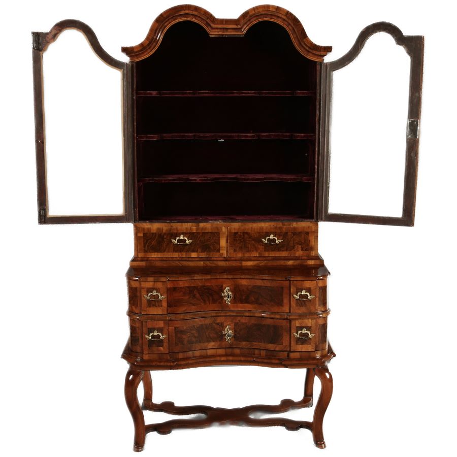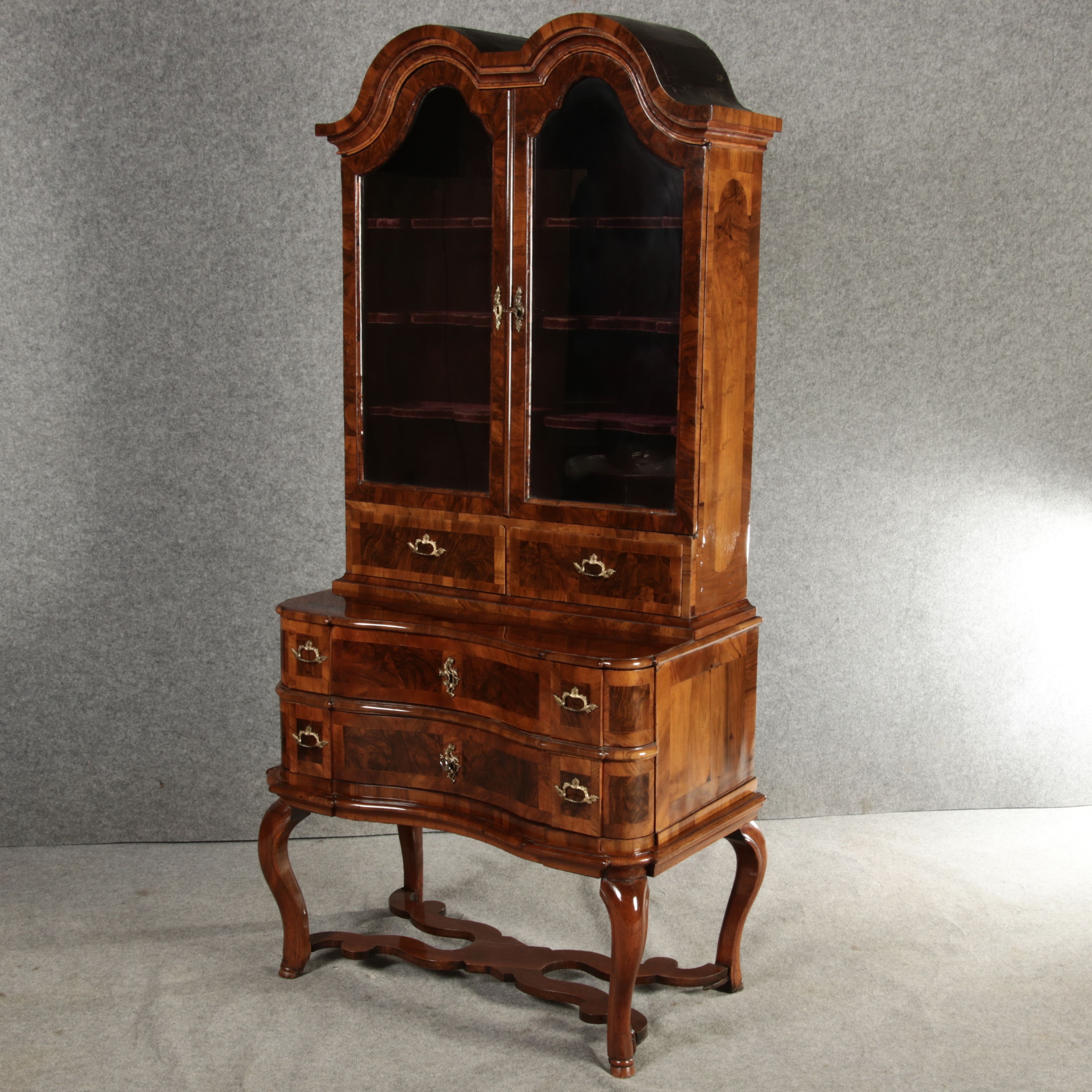 Barock), Nuss, 2-teilig, Untersatz als 2-schübige Kommode a. hohem offen gearbeiteten Sockel, 4 geschweift Beine m. einer flachen Verstrebung, d. Front doppelt geschweift und verkröpft, der Aufsatz mit 2 Schubfächern, darüber Glasteil mit 2 Türen, diese oben doppelt geschweift. Giebel. Rückwand Tannenholz, Oberfläche m. älterer Schellackpolitur. Für XXL Bild hier klicken50 |