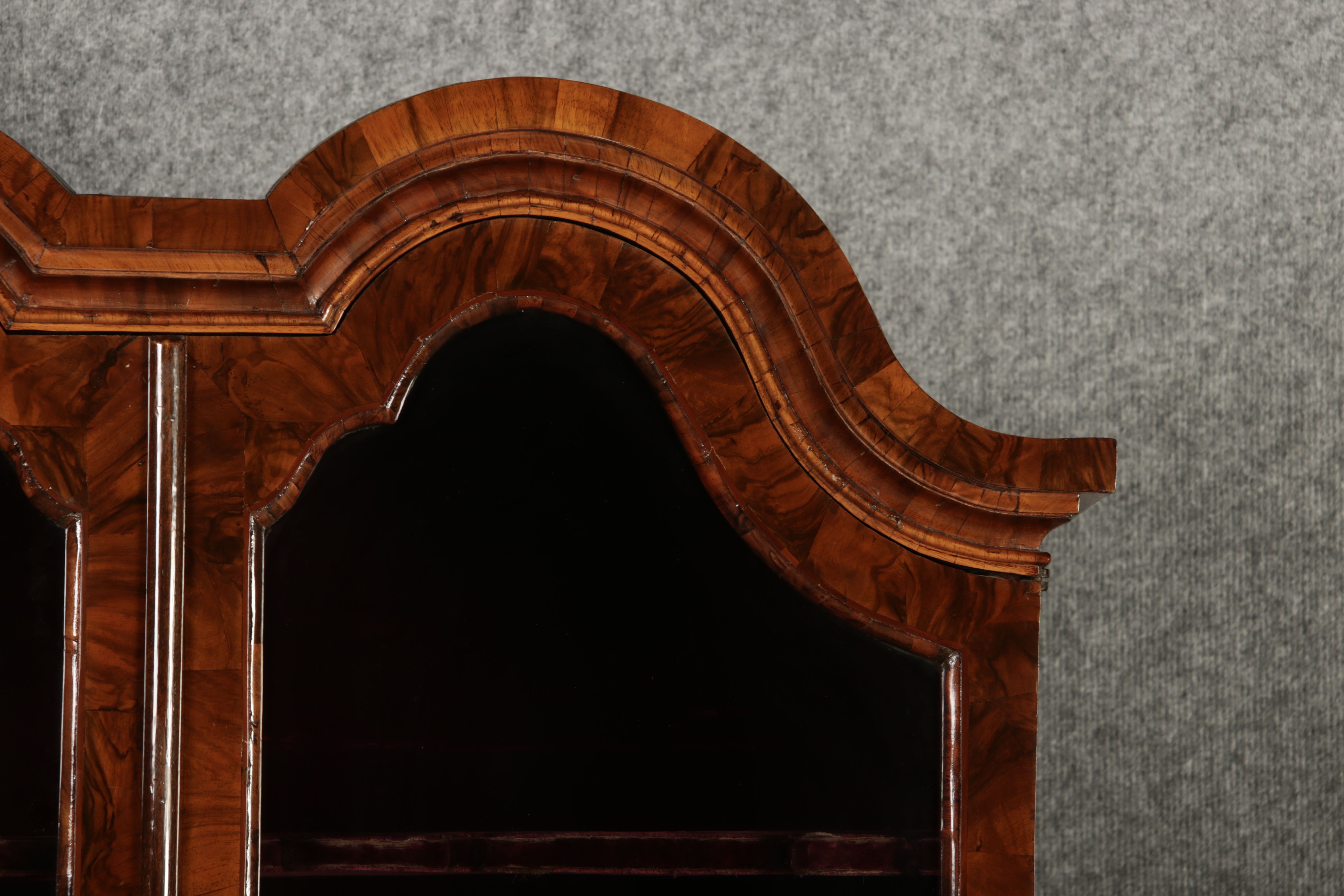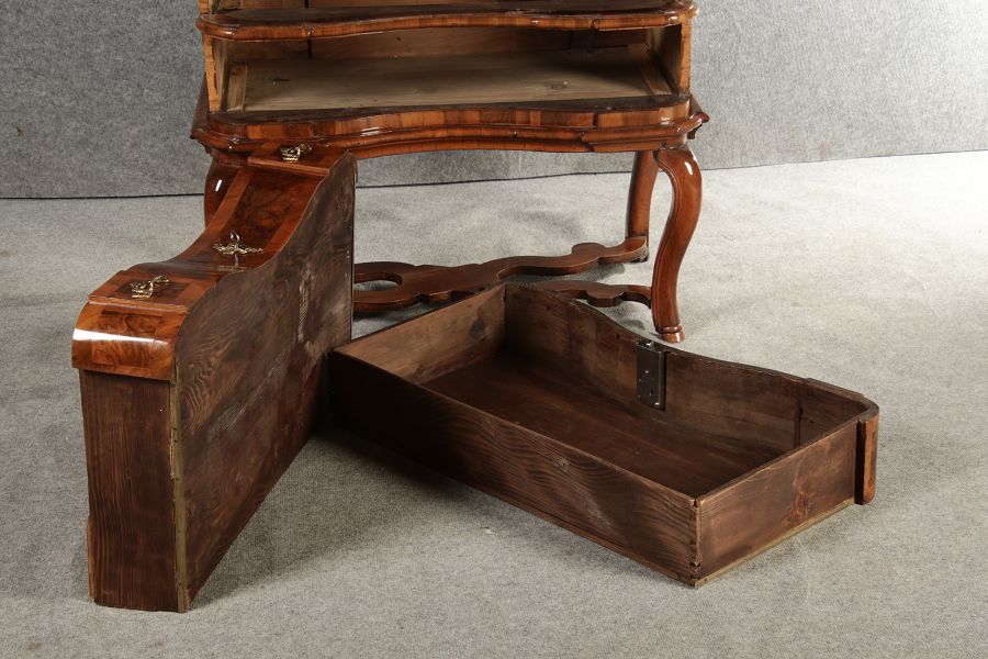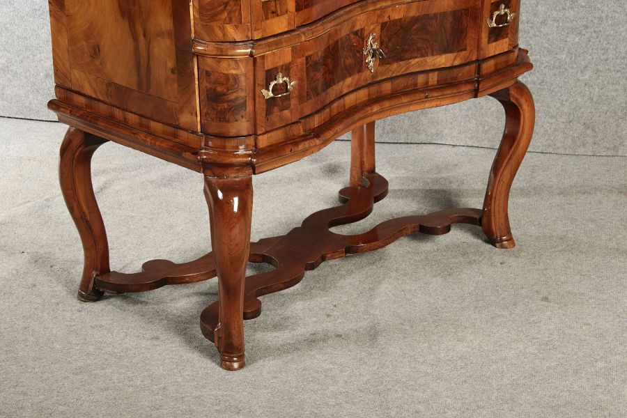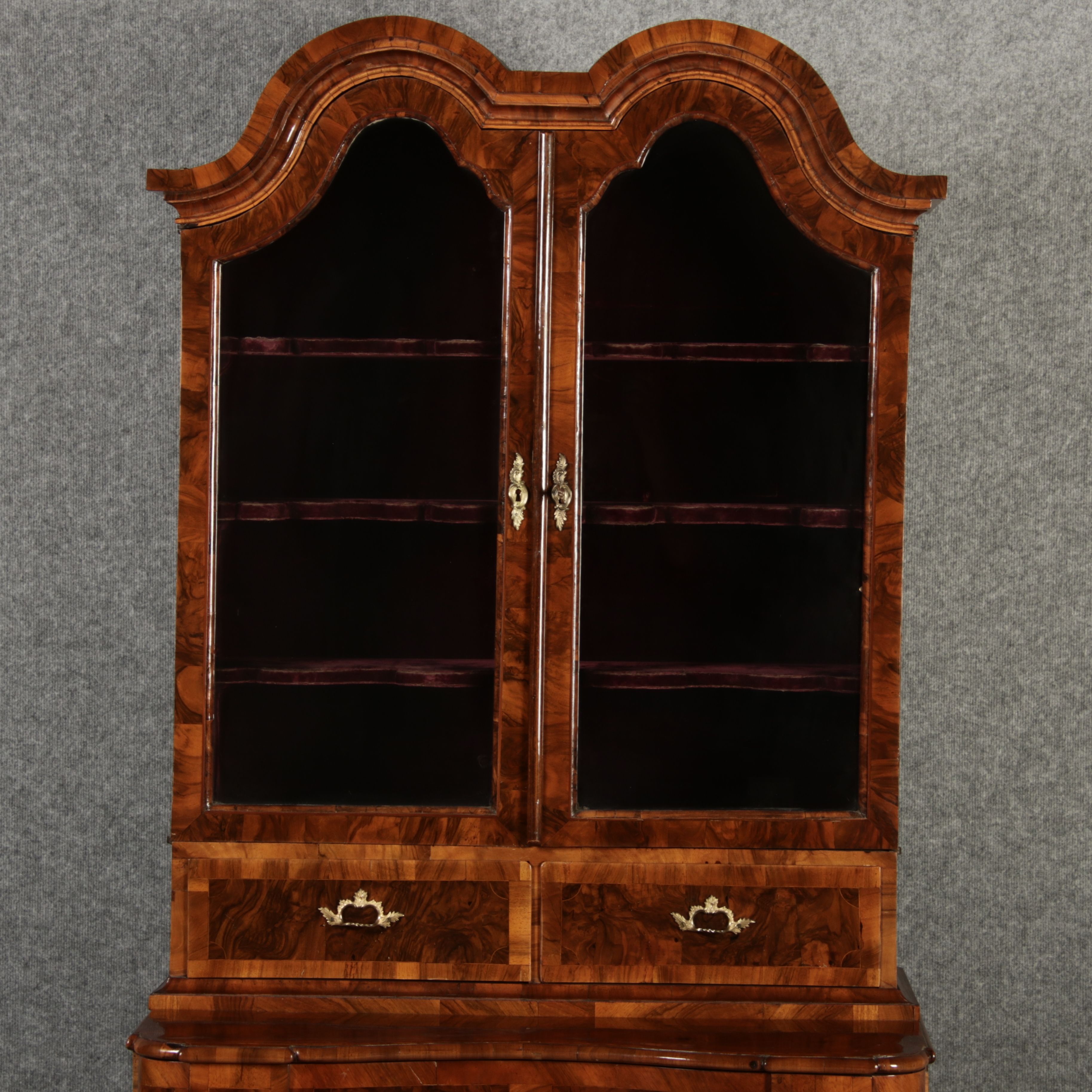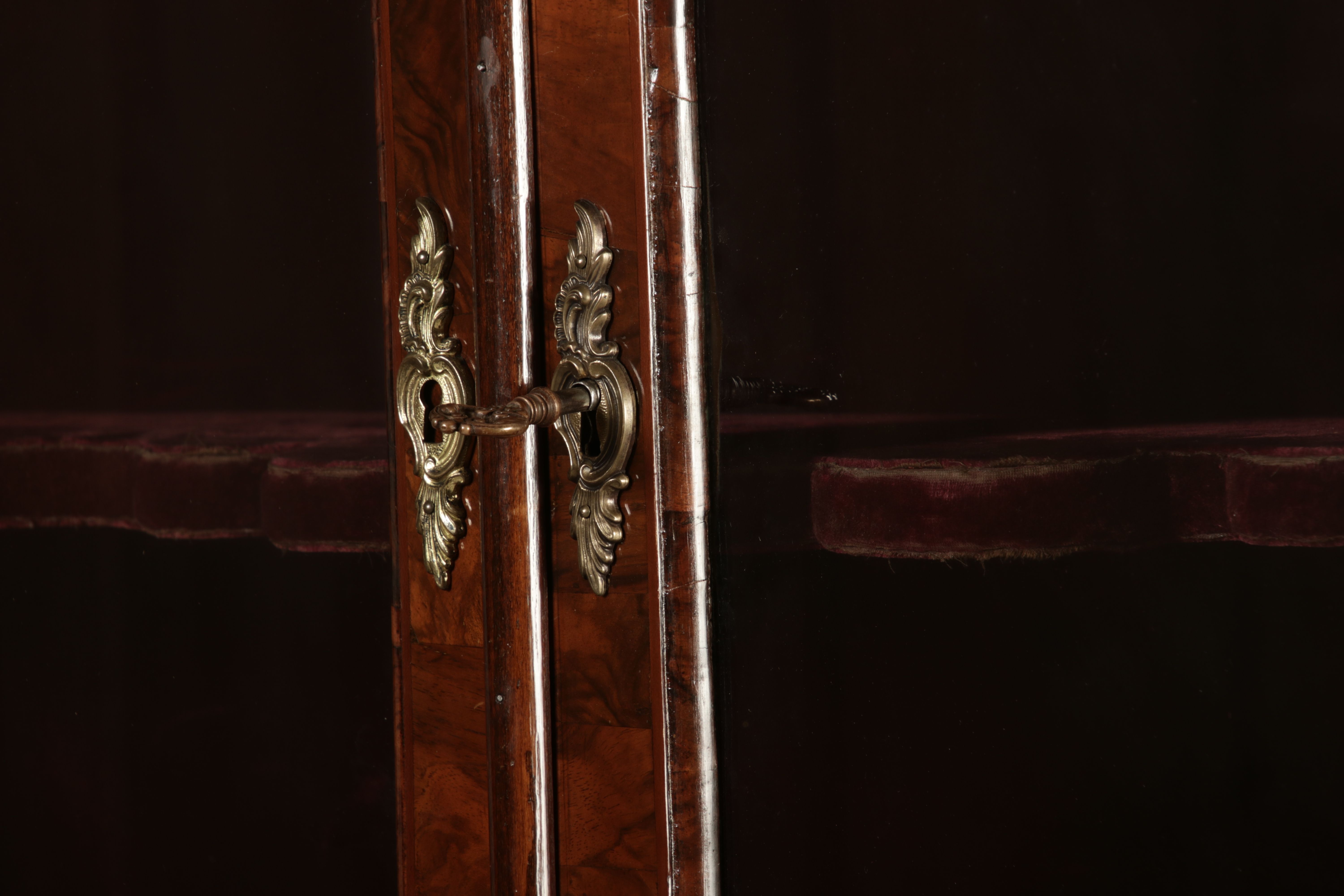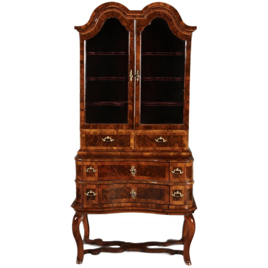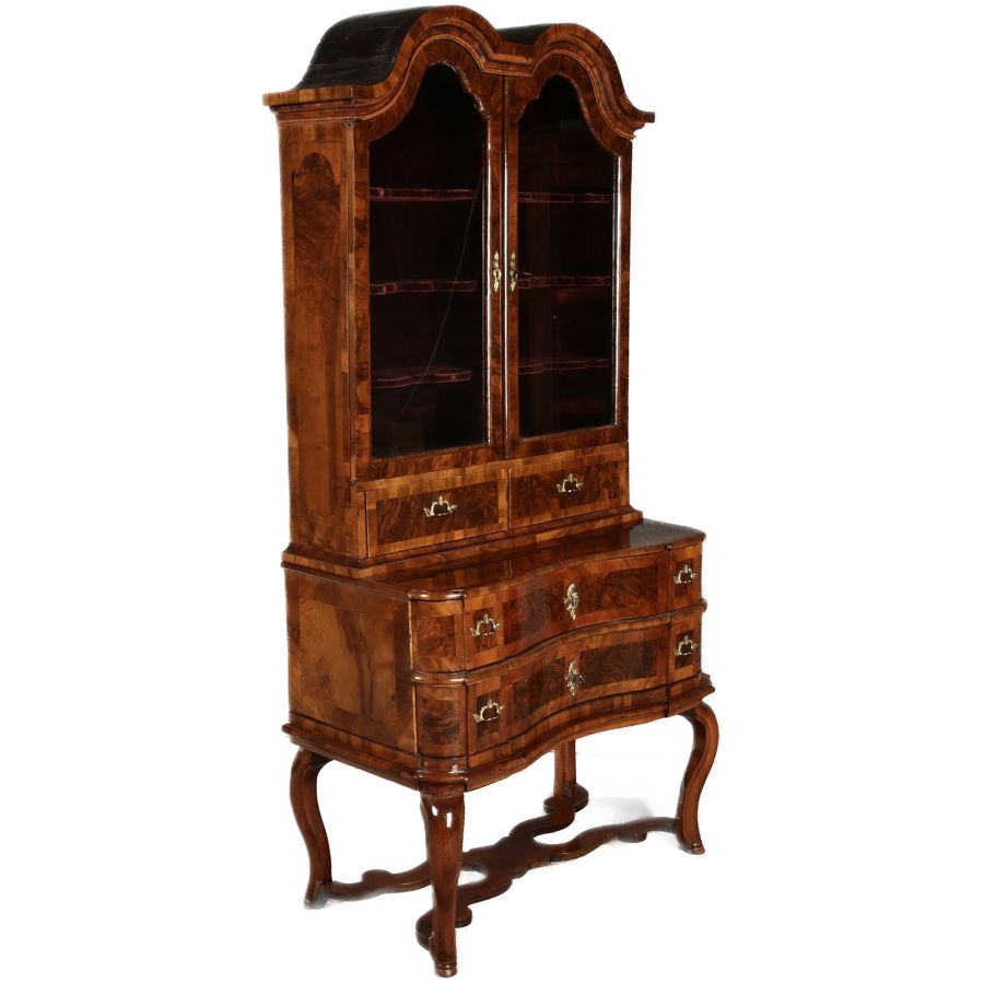 Barock), Nuss, 2-teilig, Untersatz als 2-schübige Kommode a. hohem offen gearbeiteten Sockel, 4 geschweift Beine m. einer flachen Verstrebung, d. Front doppelt geschweift und verkröpft, der Aufsatz mit 2 Schubfächern, darüber Glasteil mit 2 Türen, diese oben doppelt geschweift. Giebel. Rückwand Tannenholz, Oberfläche m. älterer Schellackpolitur. Für XXL Bild hier klicken50 |