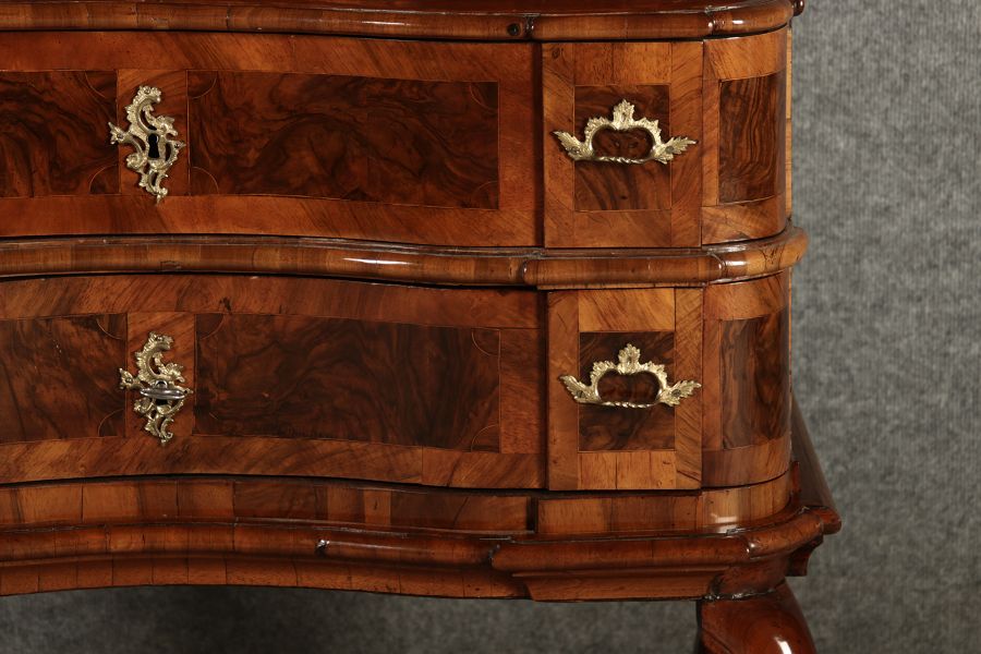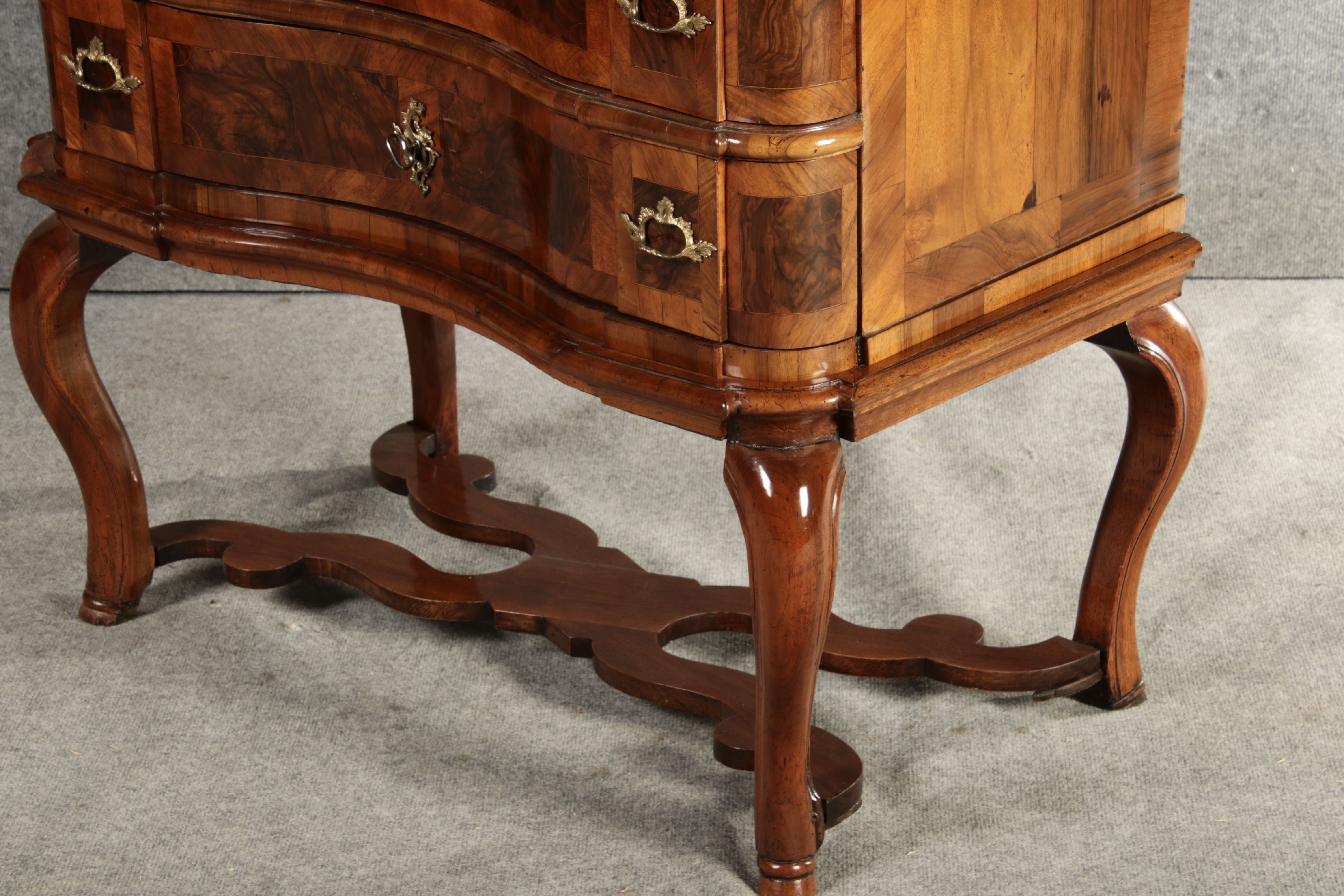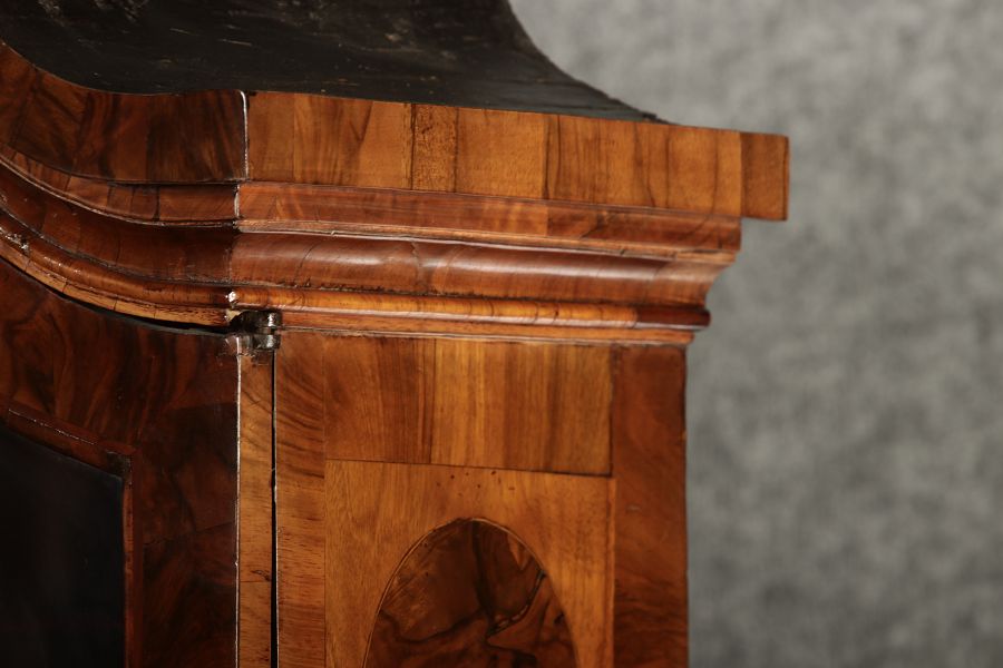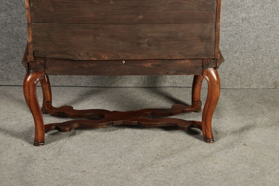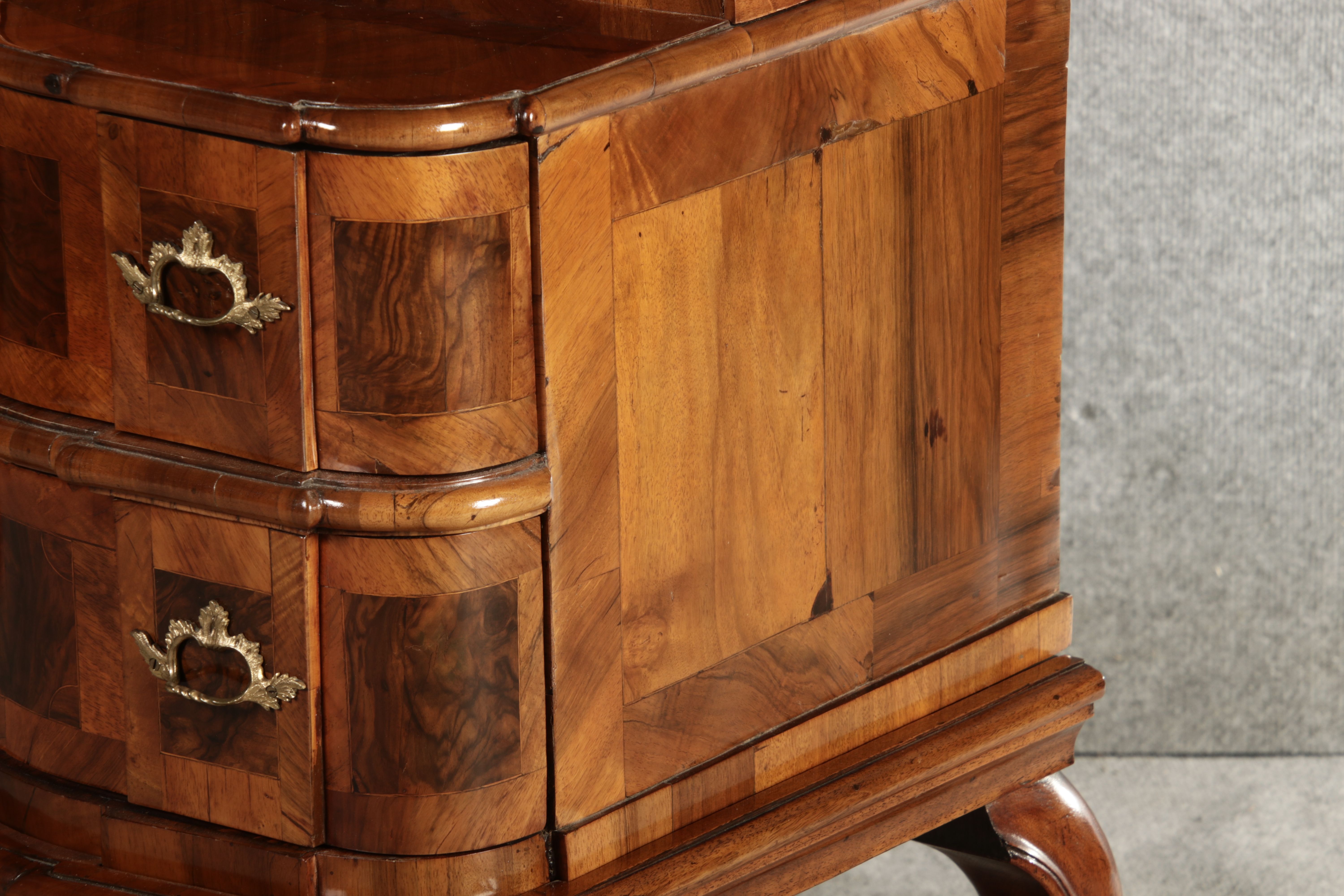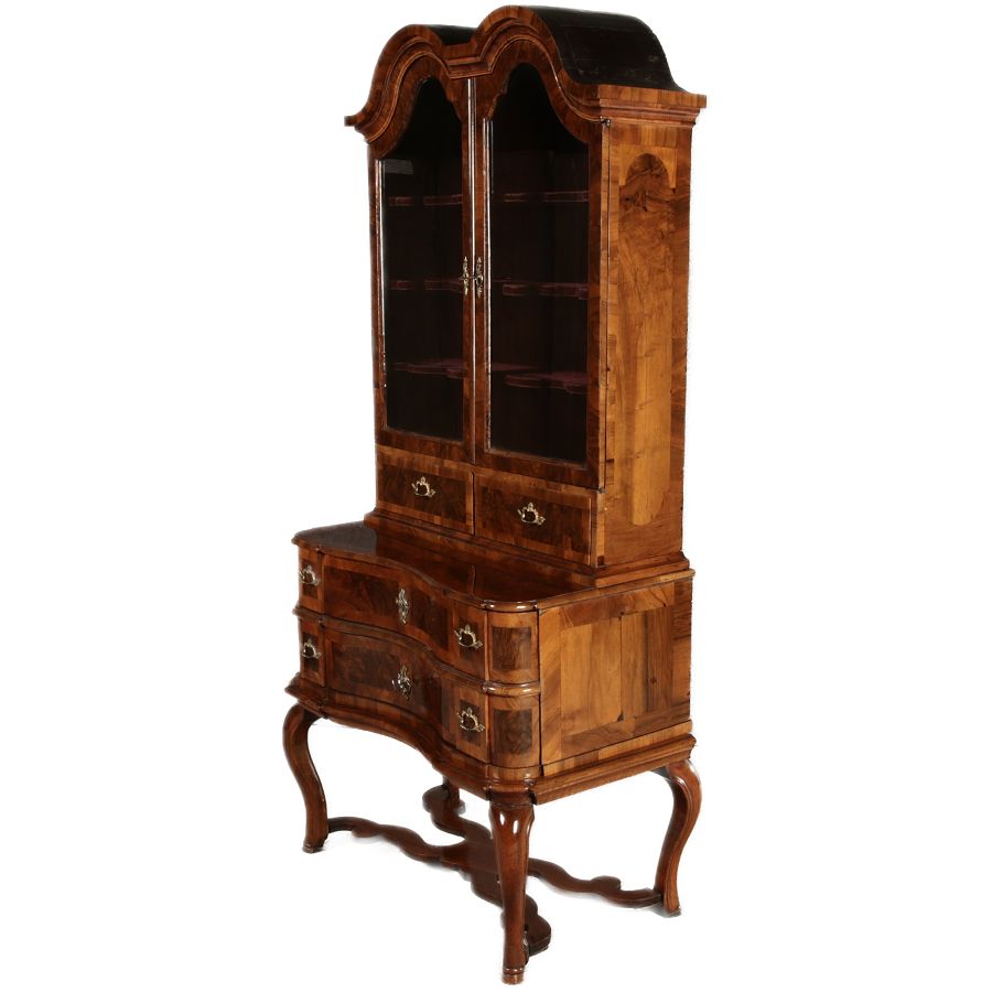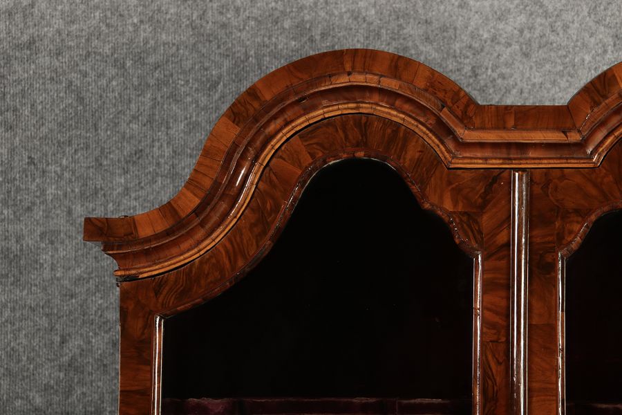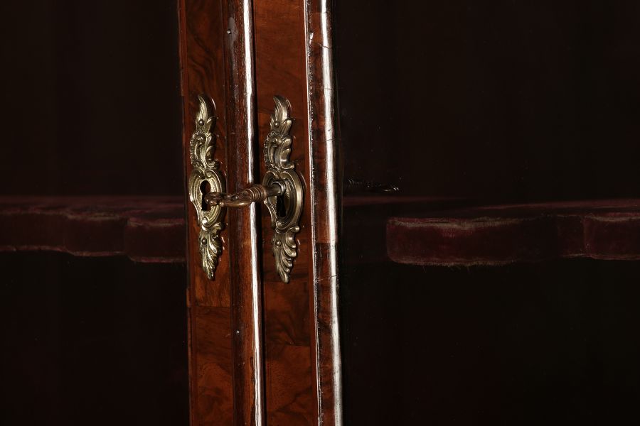 Barock), Nuss, 2-teilig, Untersatz als 2-schübige Kommode a. hohem offen gearbeiteten Sockel, 4 geschweift Beine m. einer flachen Verstrebung, d. Front doppelt geschweift und verkröpft, der Aufsatz mit 2 Schubfächern, darüber Glasteil mit 2 Türen, diese oben doppelt geschweift. Giebel. Rückwand Tannenholz, Oberfläche m. älterer Schellackpolitur. Für XXL Bild hier klicken50 |