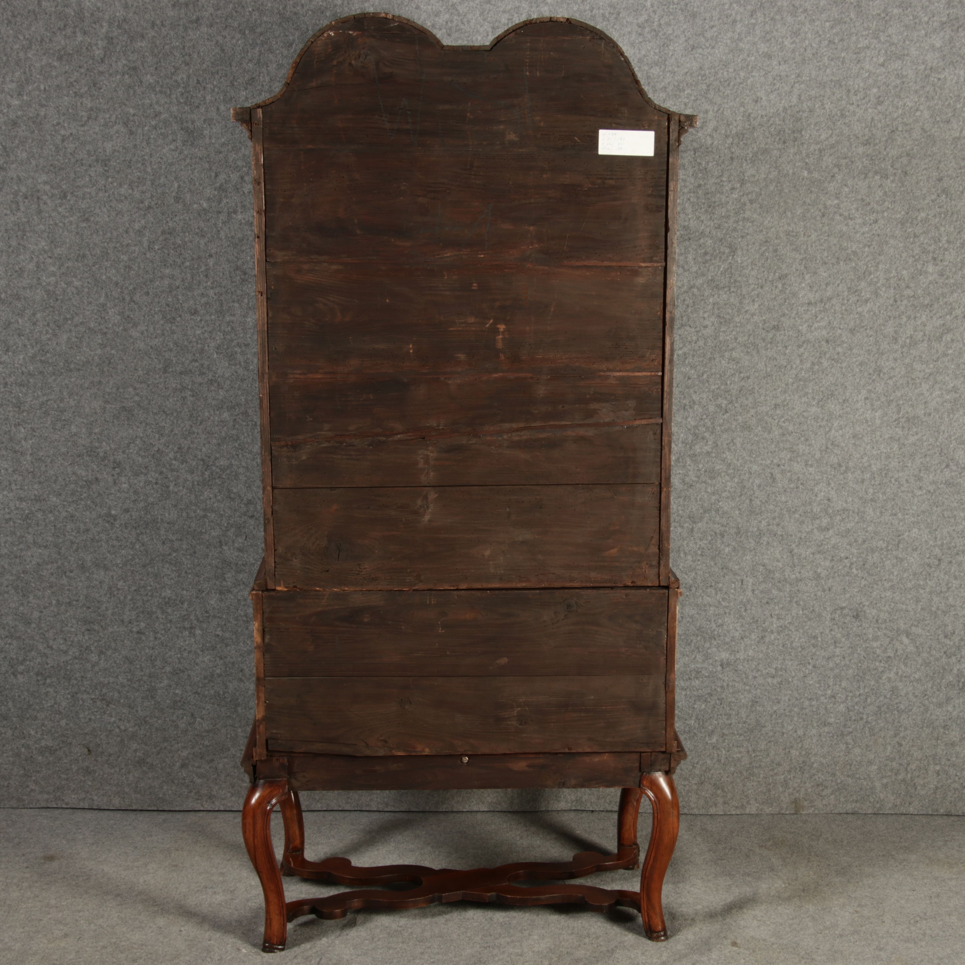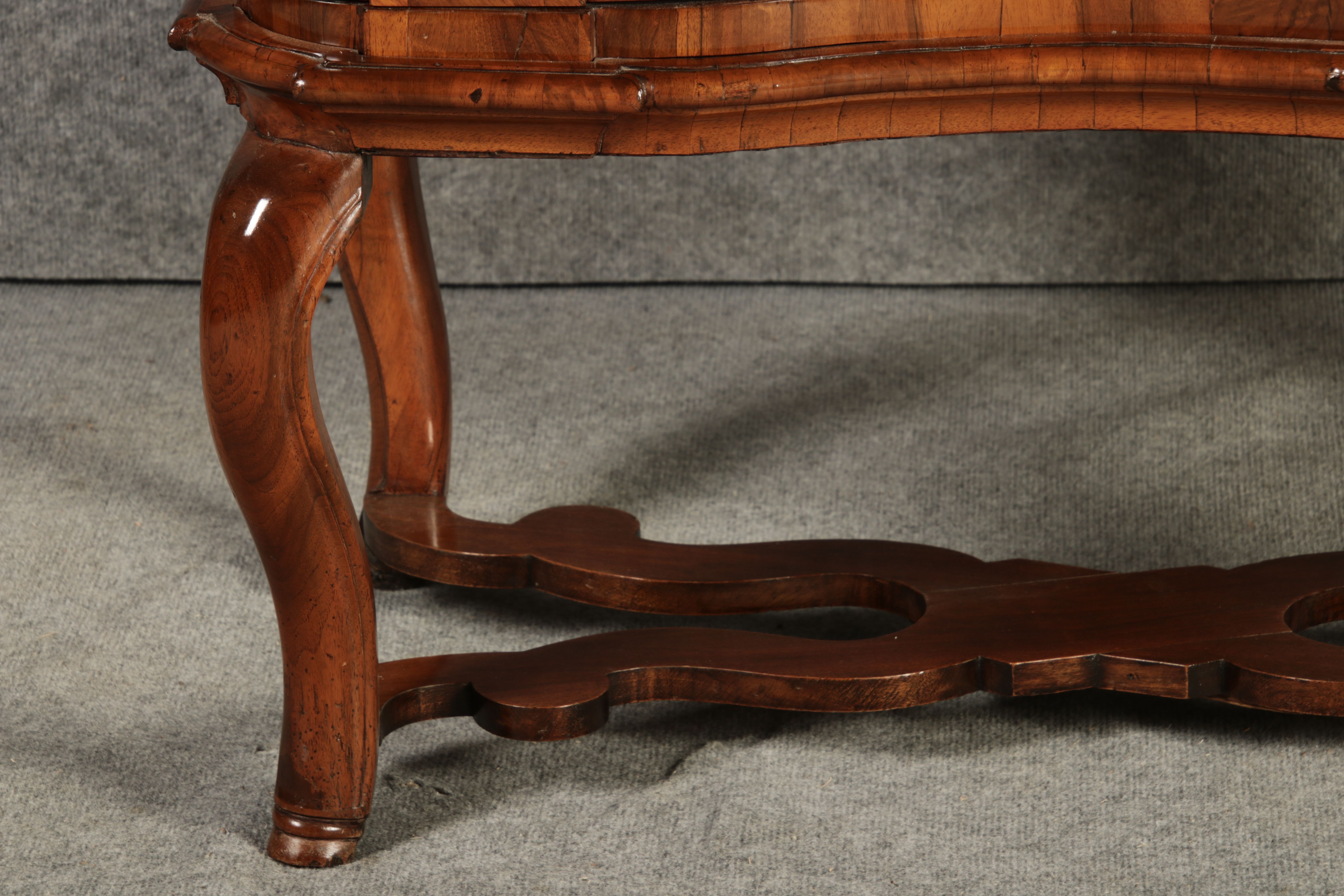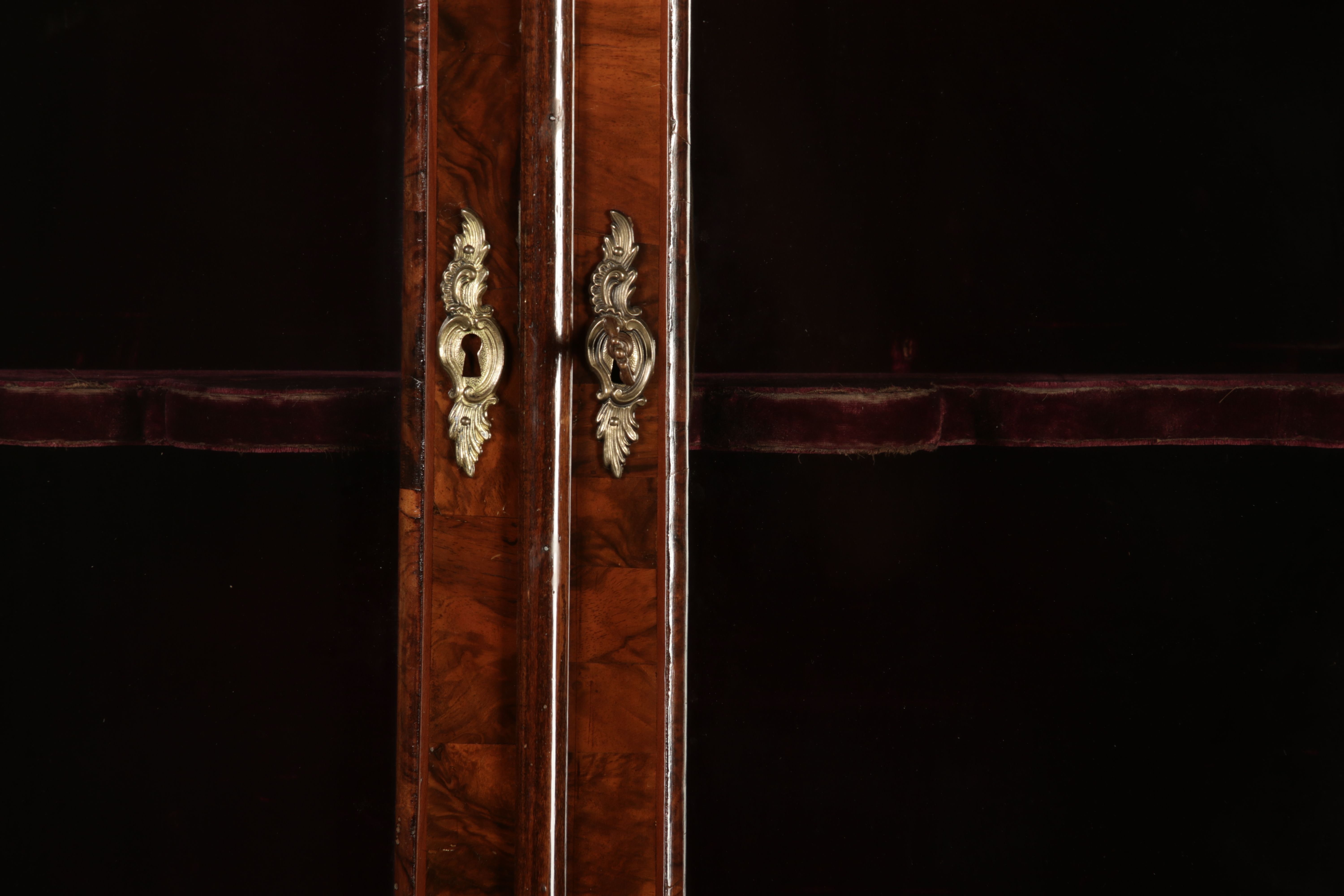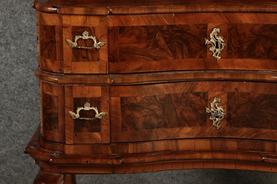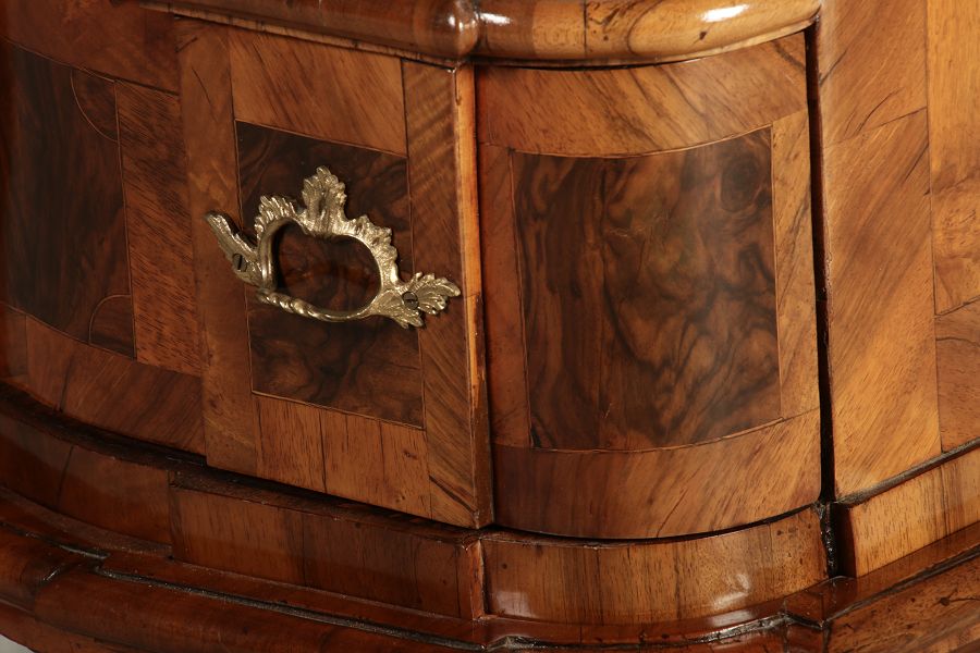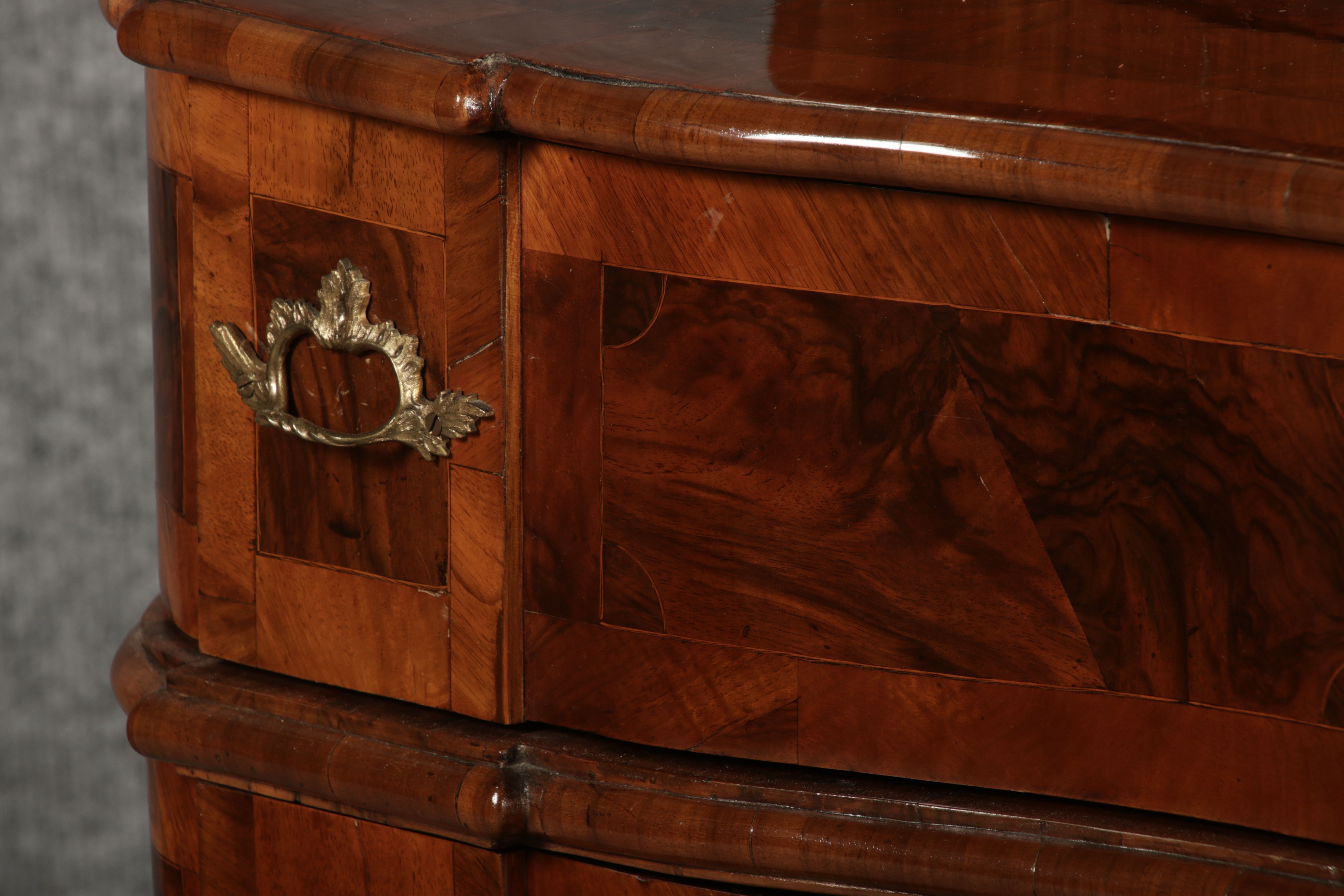 Barock), Nuss, 2-teilig, Untersatz als 2-schübige Kommode a. hohem offen gearbeiteten Sockel, 4 geschweift Beine m. einer flachen Verstrebung, d. Front doppelt geschweift und verkröpft, der Aufsatz mit 2 Schubfächern, darüber Glasteil mit 2 Türen, diese oben doppelt geschweift. Giebel. Rückwand Tannenholz, Oberfläche m. älterer Schellackpolitur. Für XXL Bild hier klicken50 |