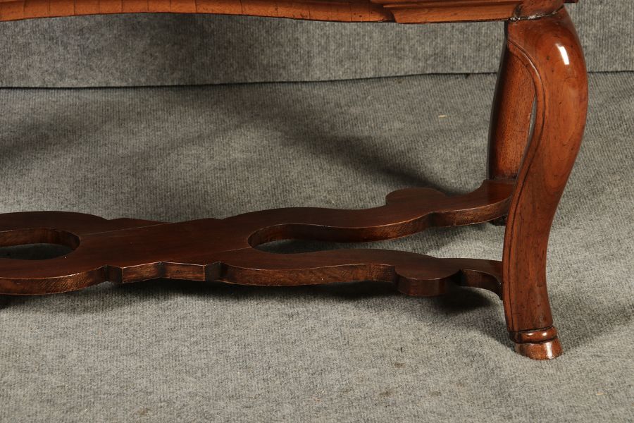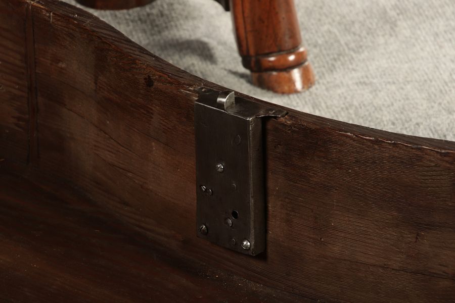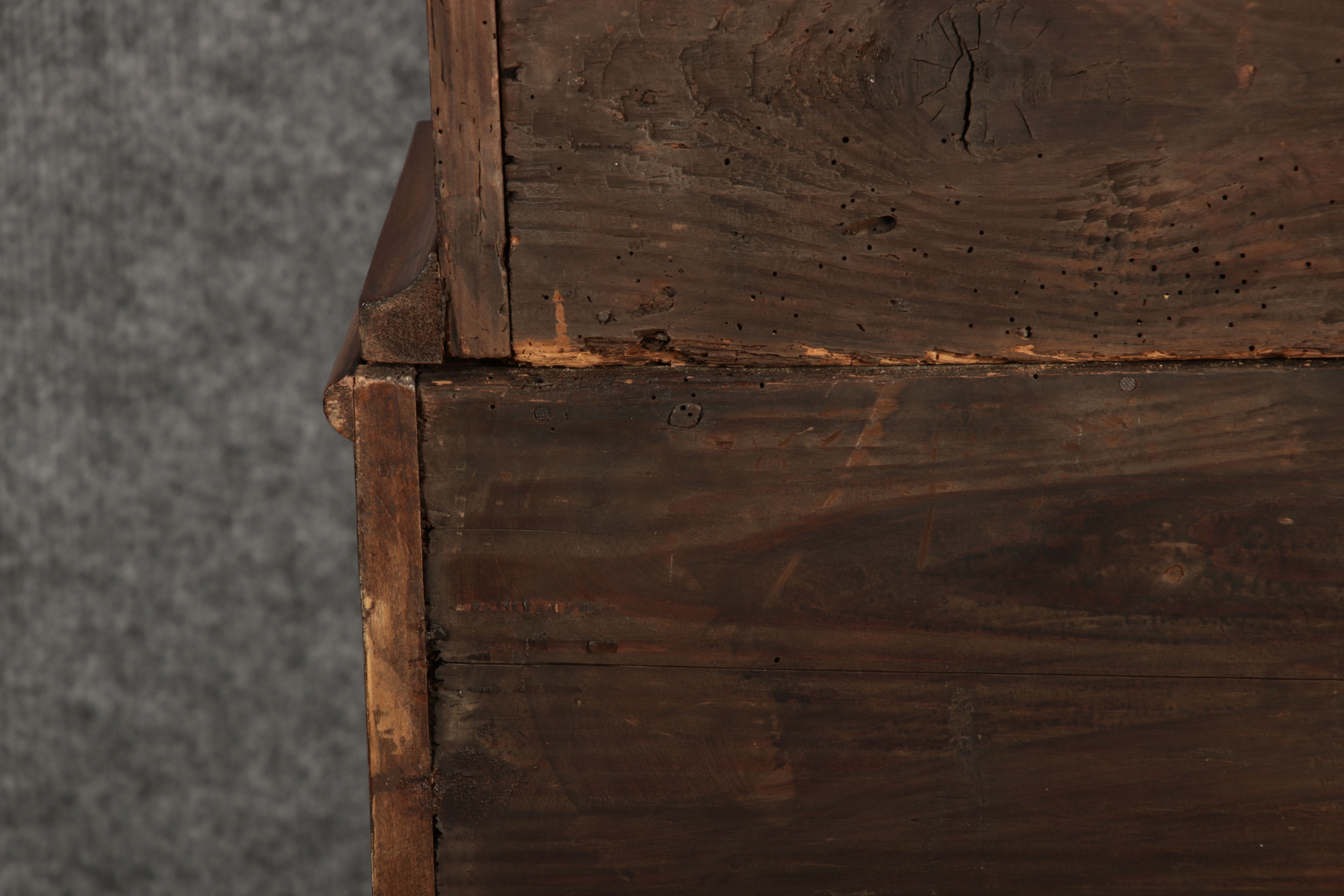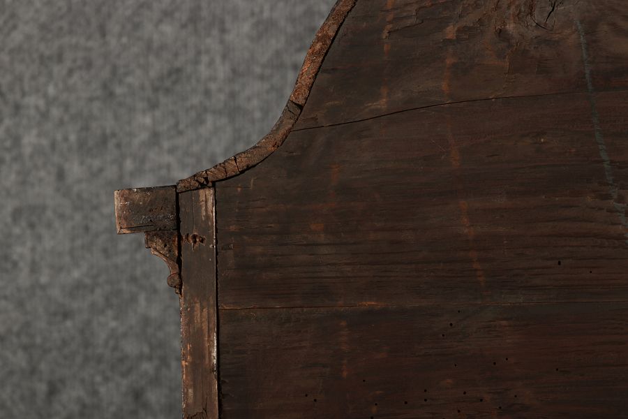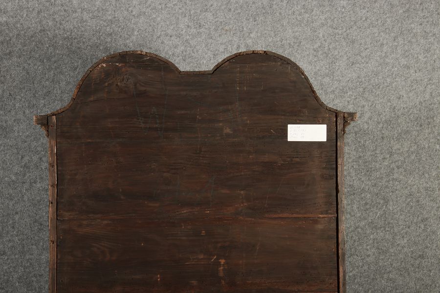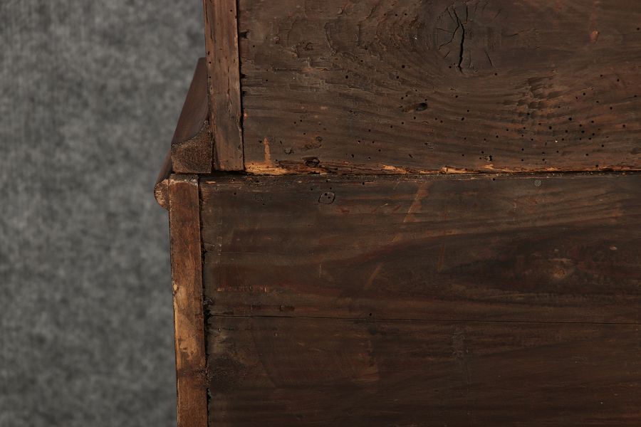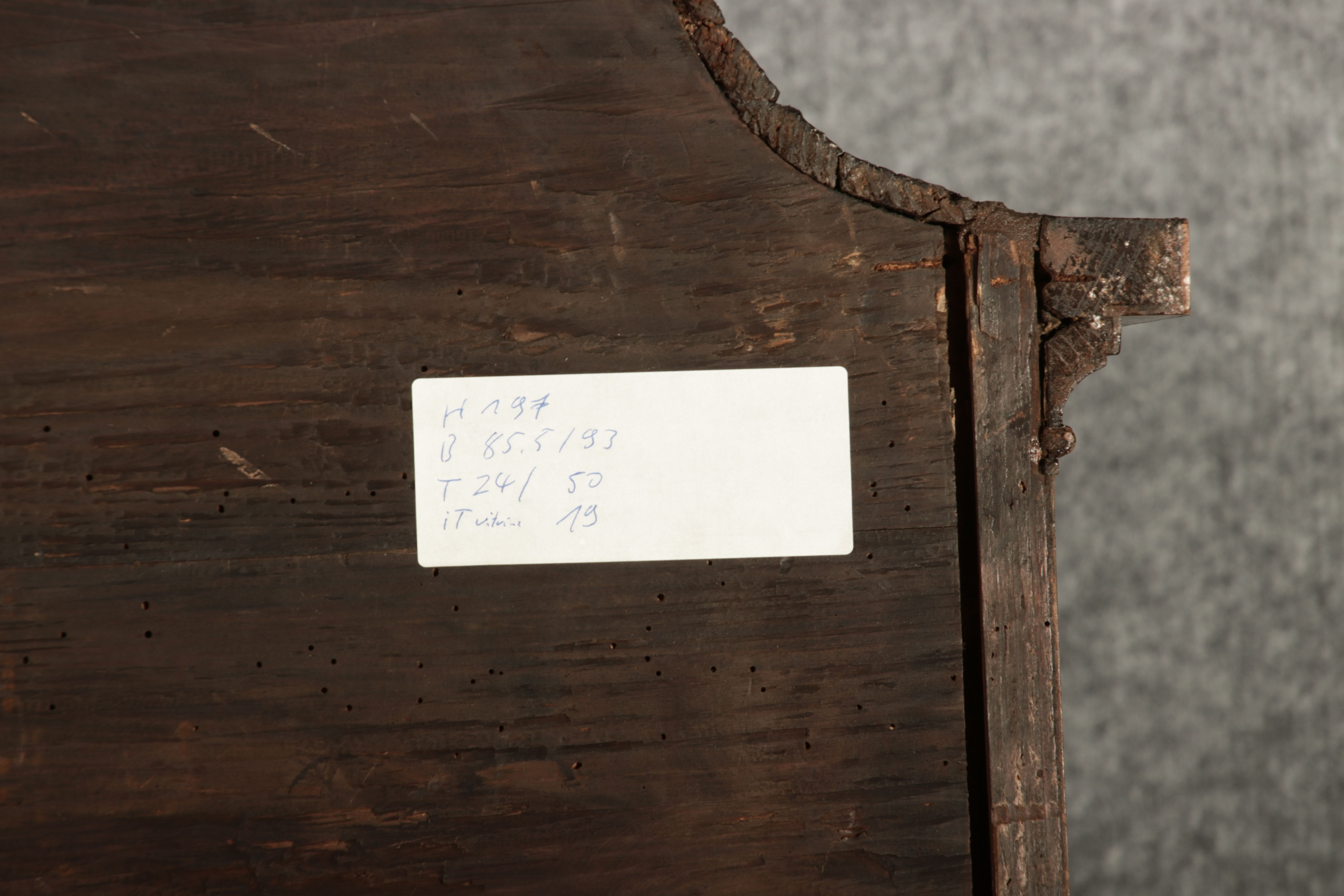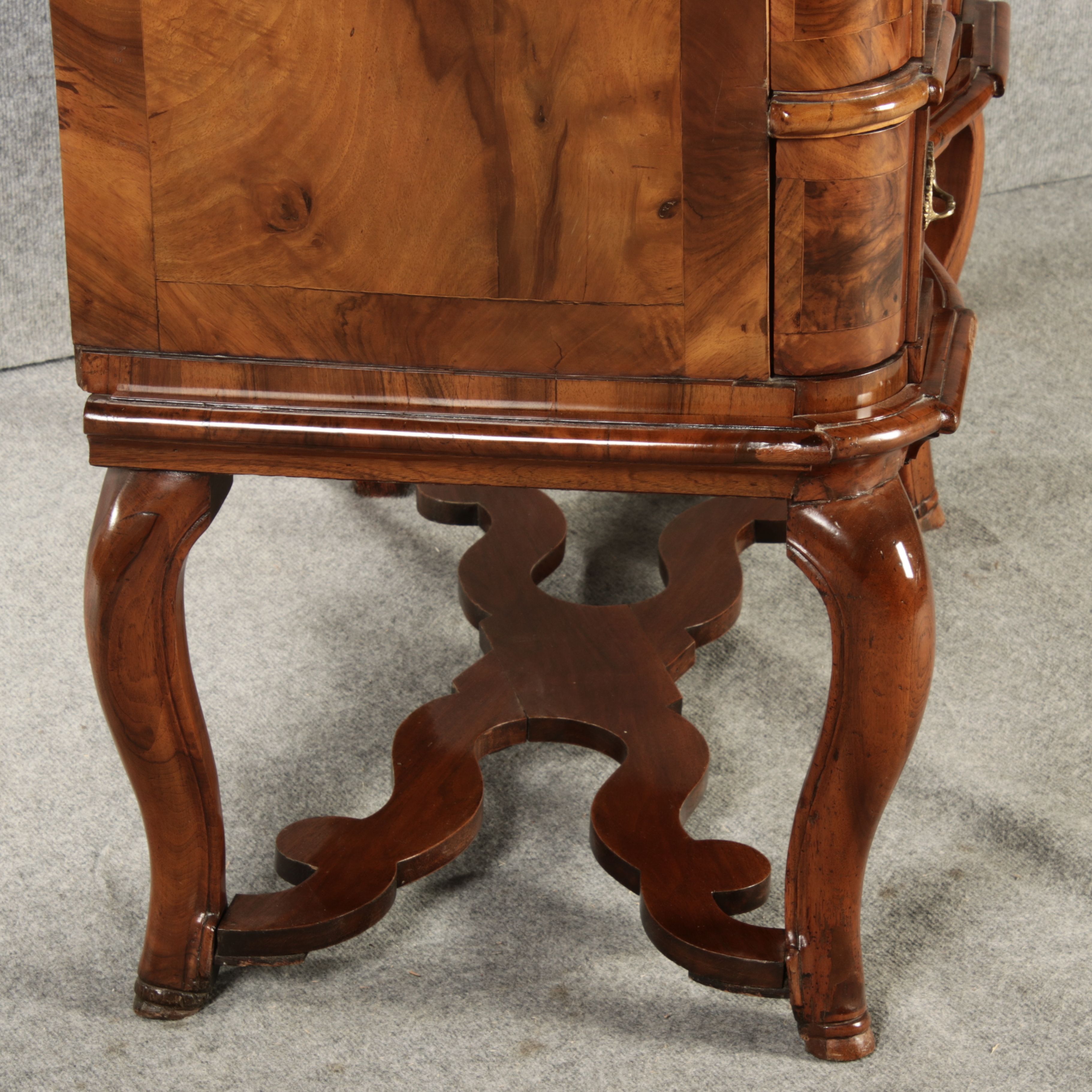 Barock), Nuss, 2-teilig, Untersatz als 2-schübige Kommode a. hohem offen gearbeiteten Sockel, 4 geschweift Beine m. einer flachen Verstrebung, d. Front doppelt geschweift und verkröpft, der Aufsatz mit 2 Schubfächern, darüber Glasteil mit 2 Türen, diese oben doppelt geschweift. Giebel. Rückwand Tannenholz, Oberfläche m. älterer Schellackpolitur. Für XXL Bild hier klicken50 |