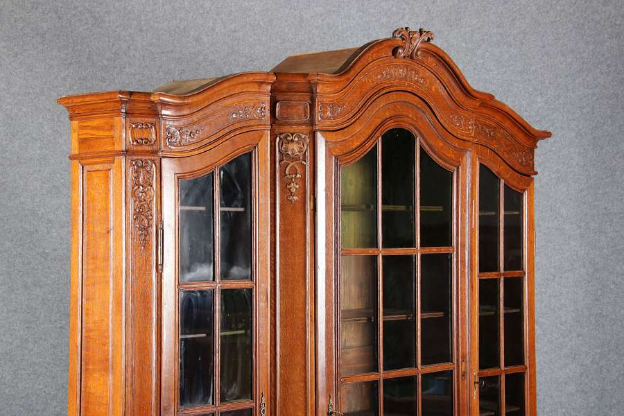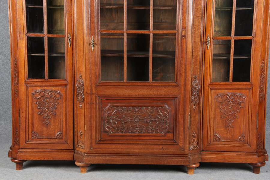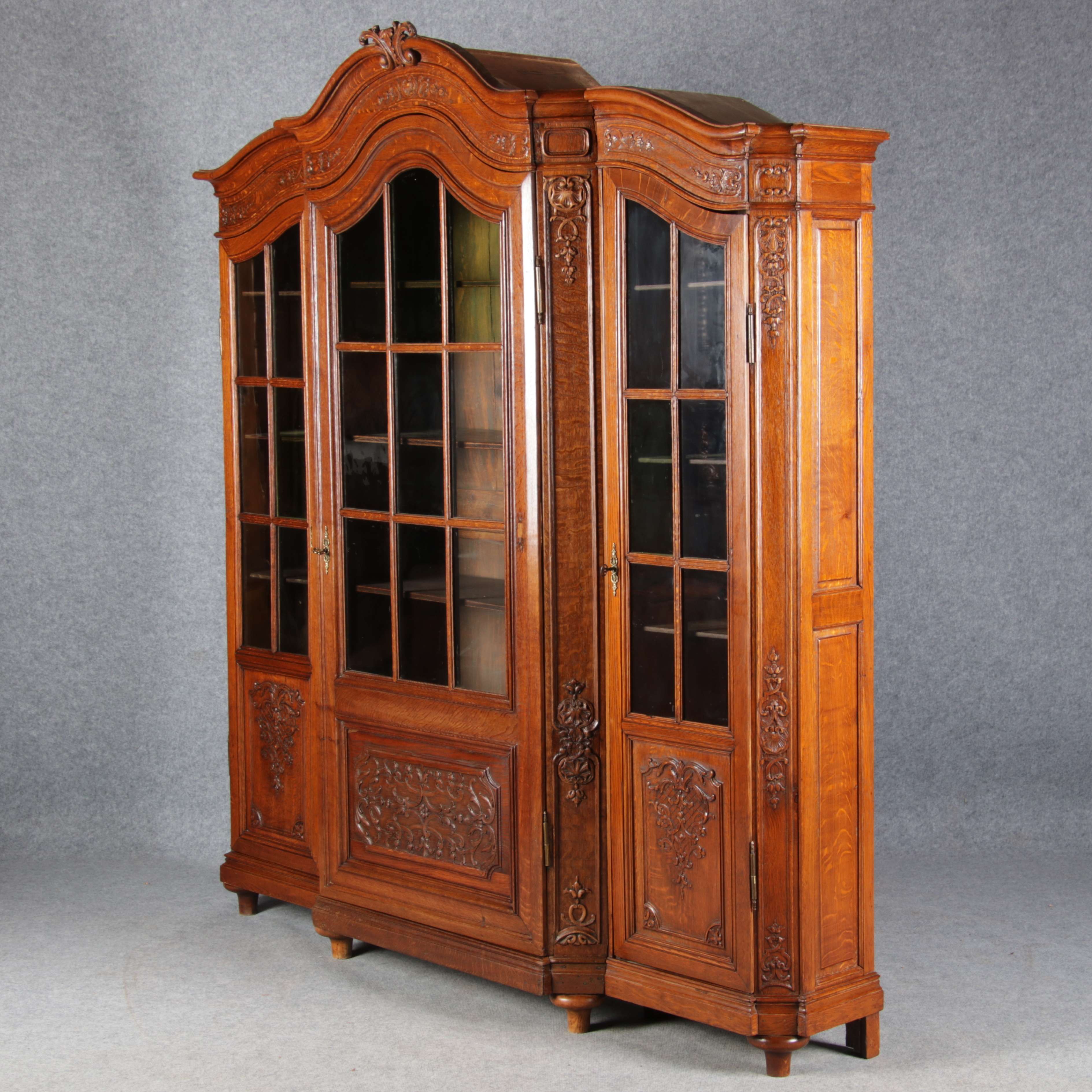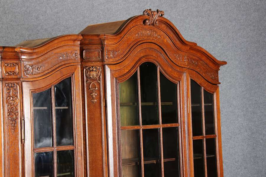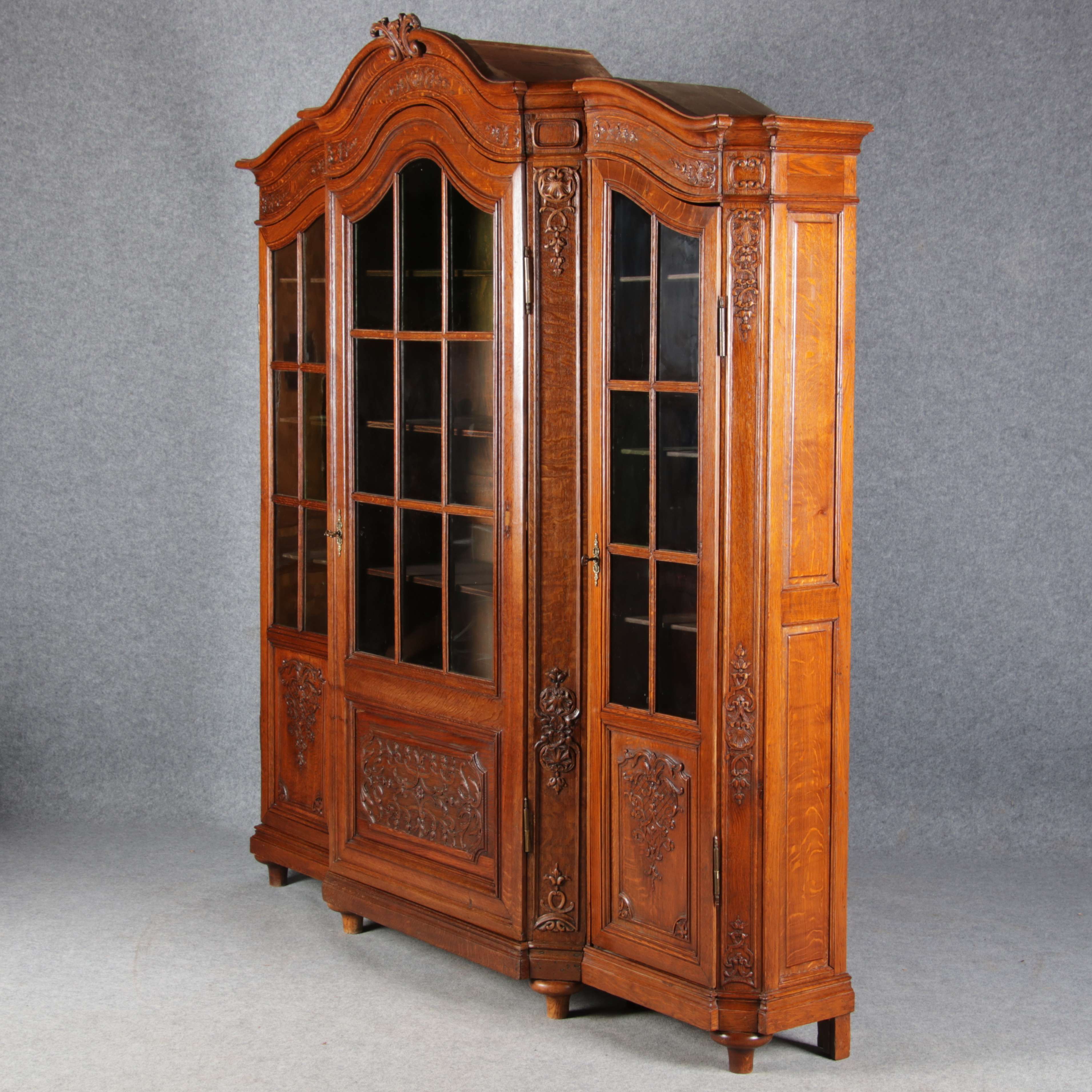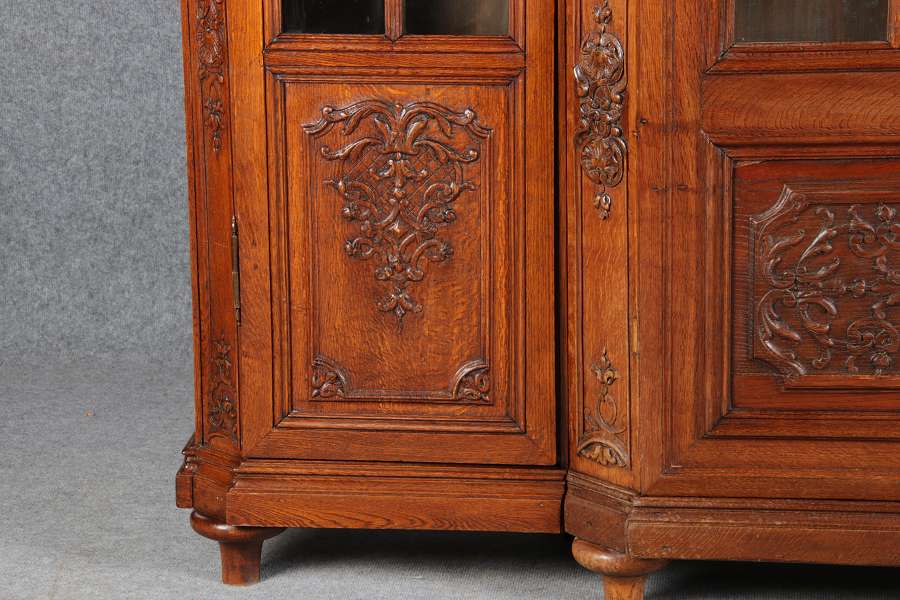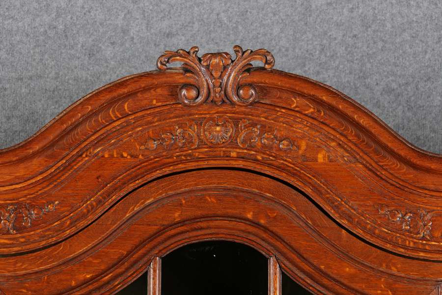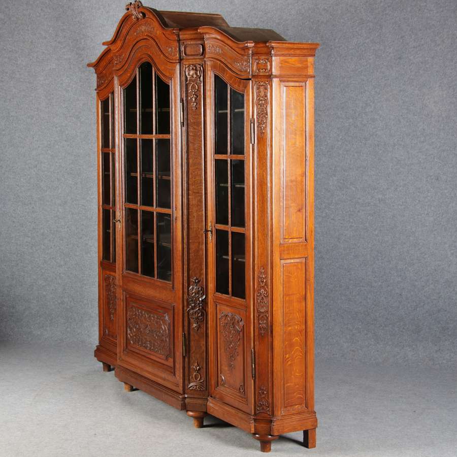 Antike Aachen Lüttich Barockvitrine drei türige Eiche 19 Jh. Schnitzereien |