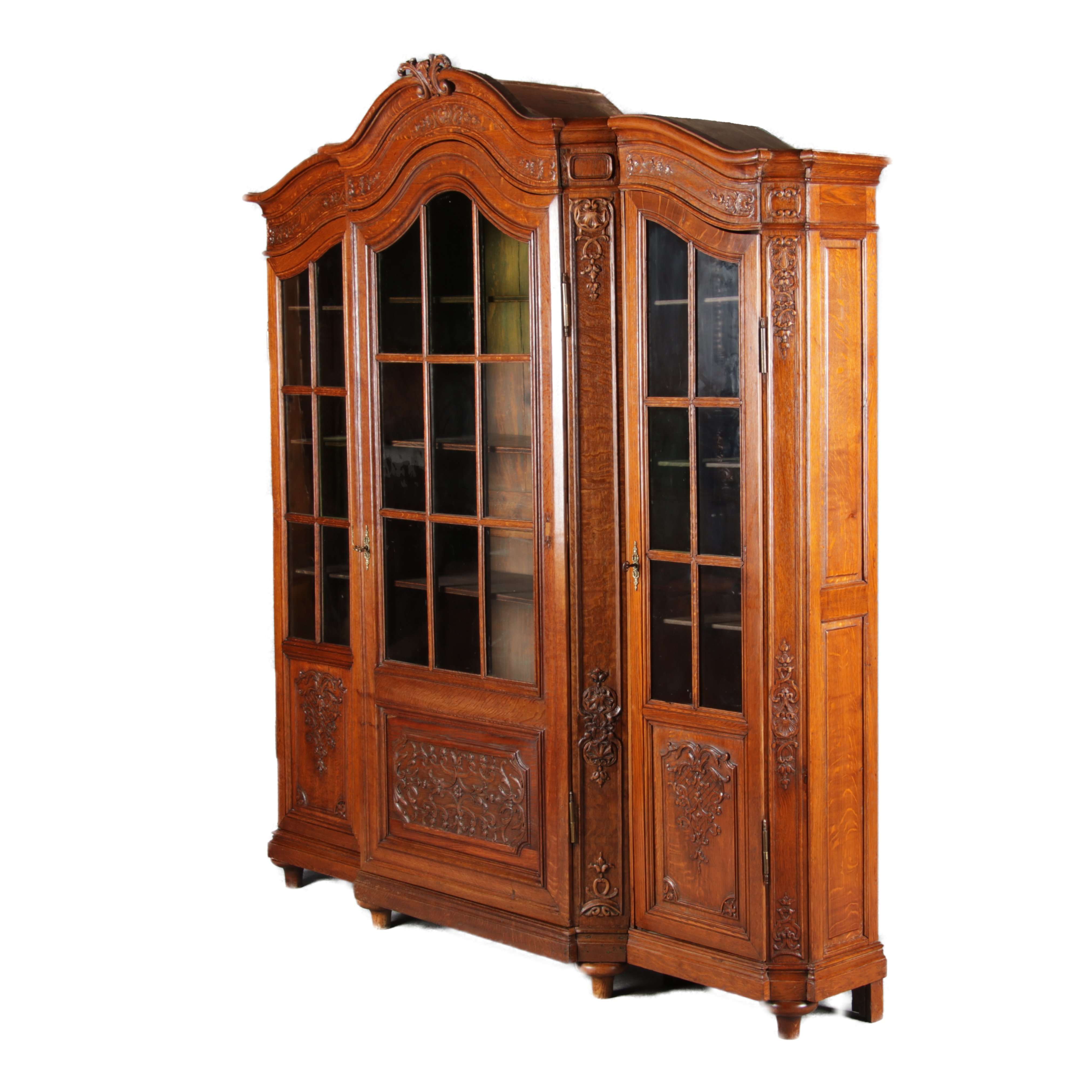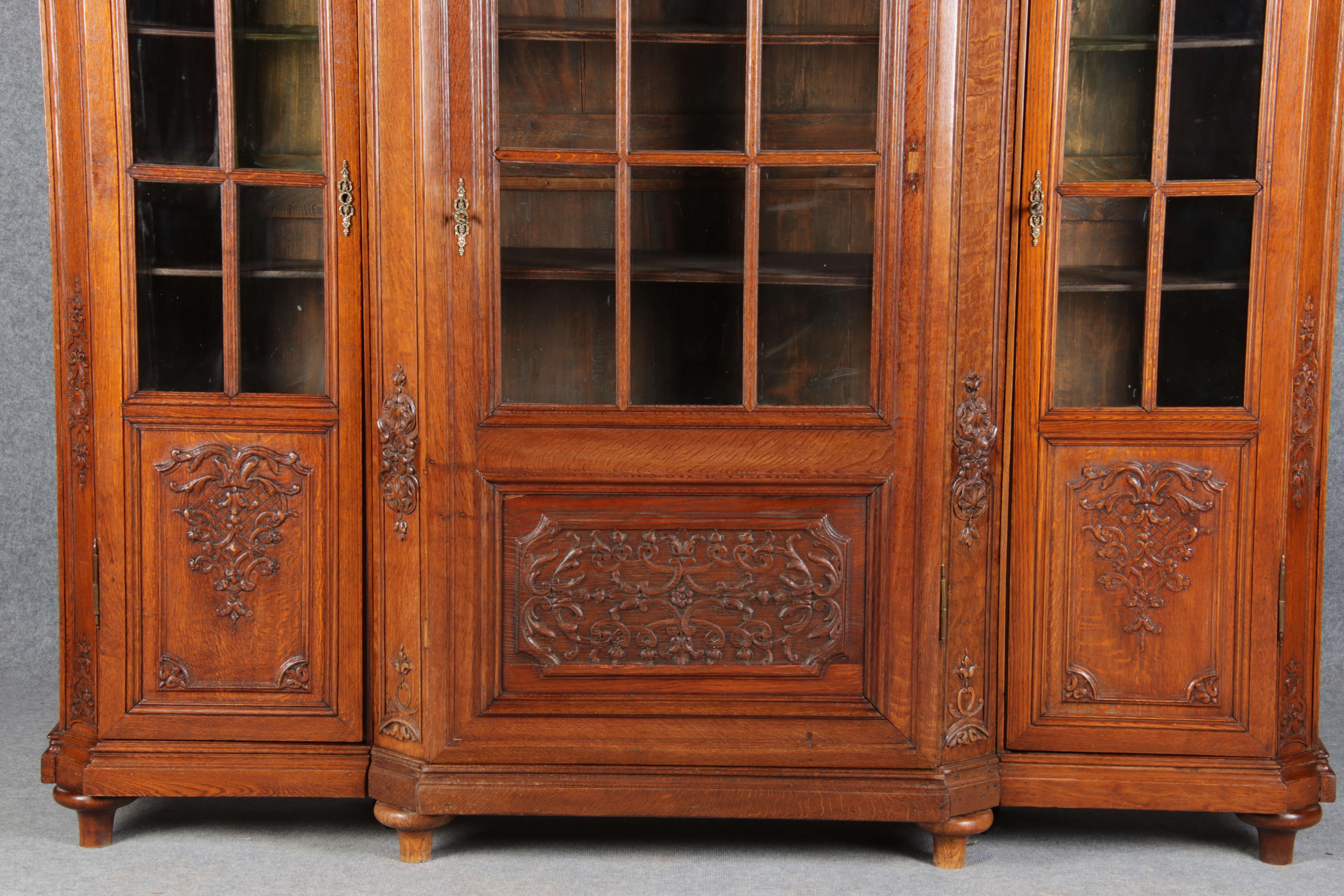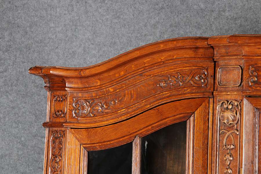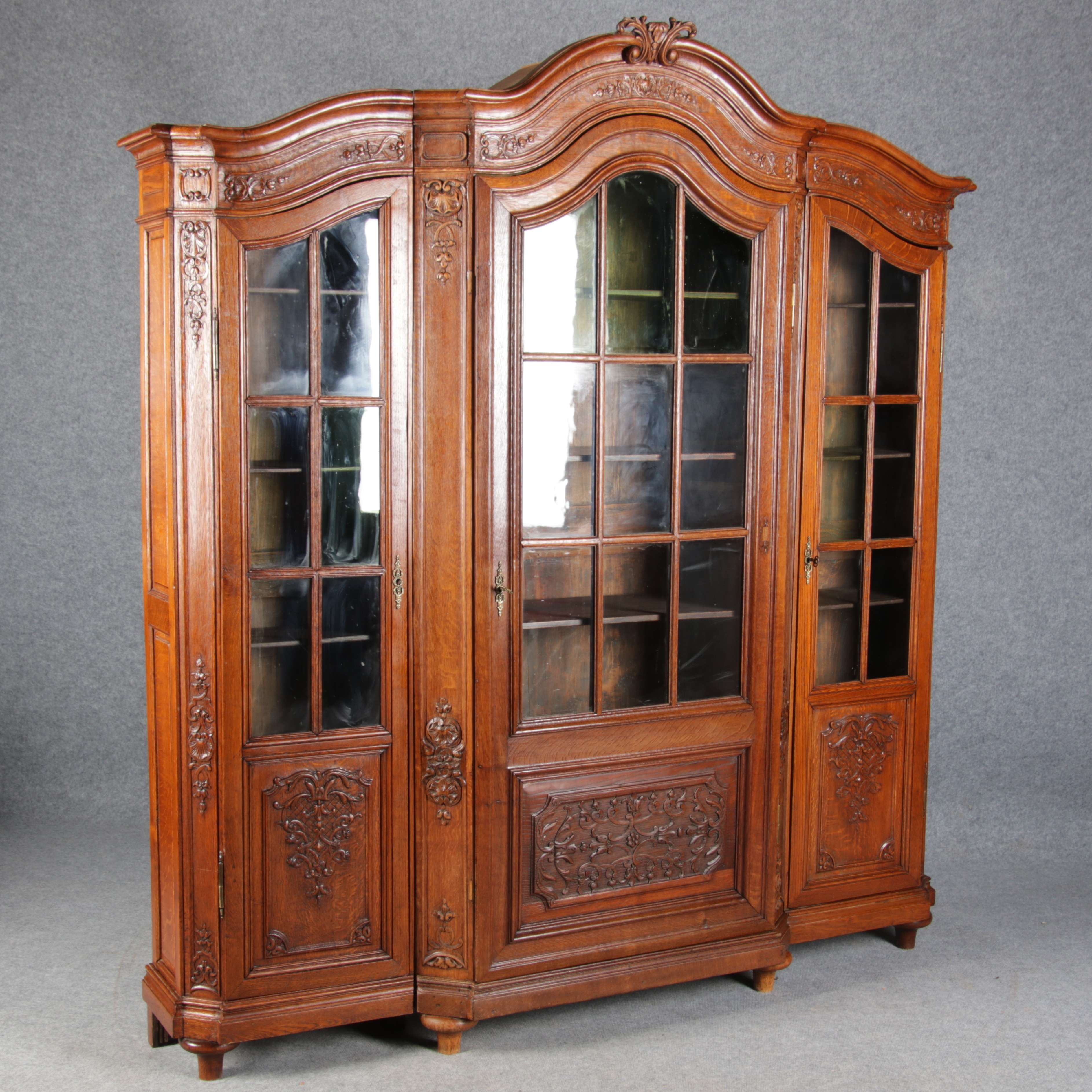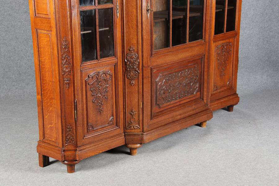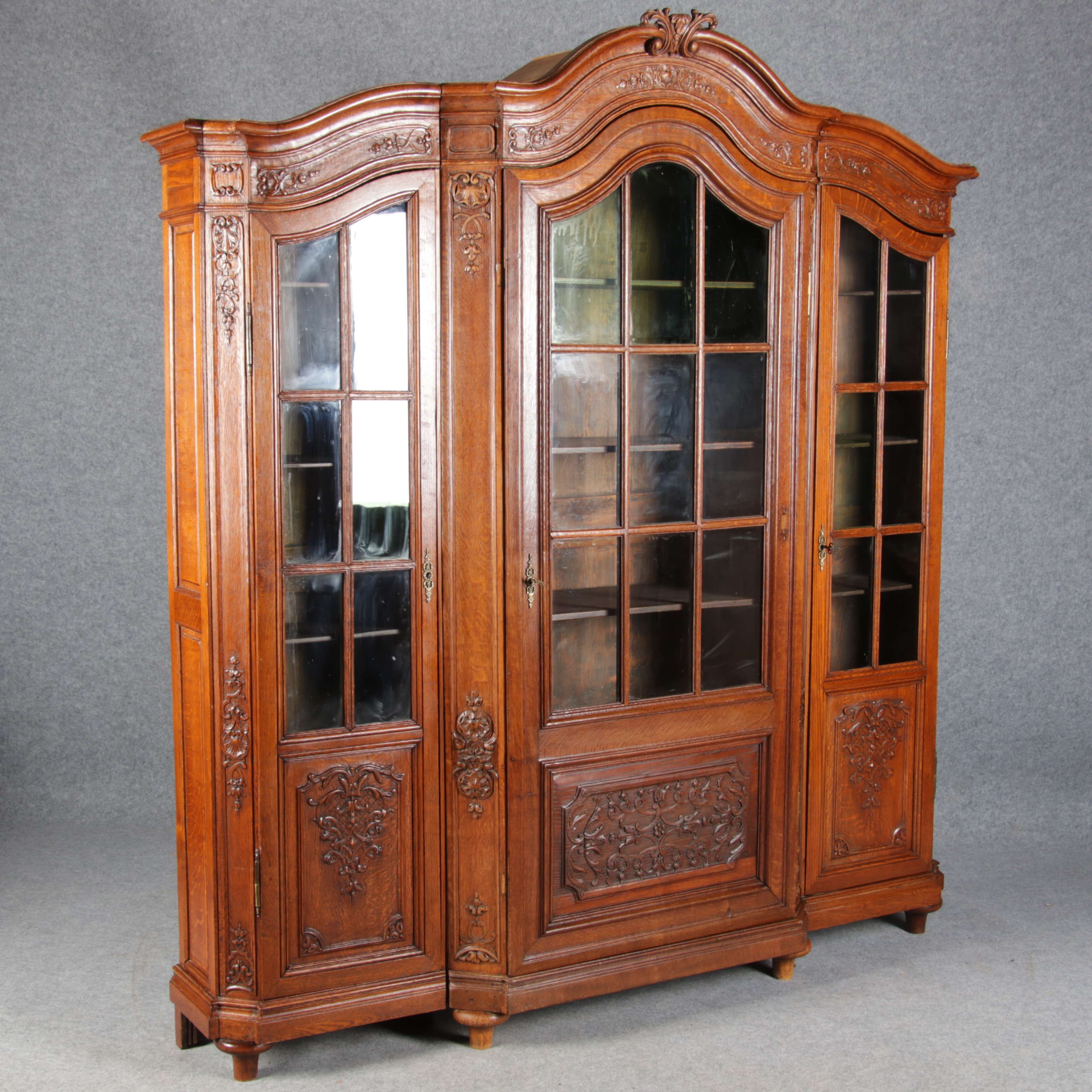 Antike Aachen Lüttich Barockvitrine drei türige Eiche 19 Jh. Schnitzereien |