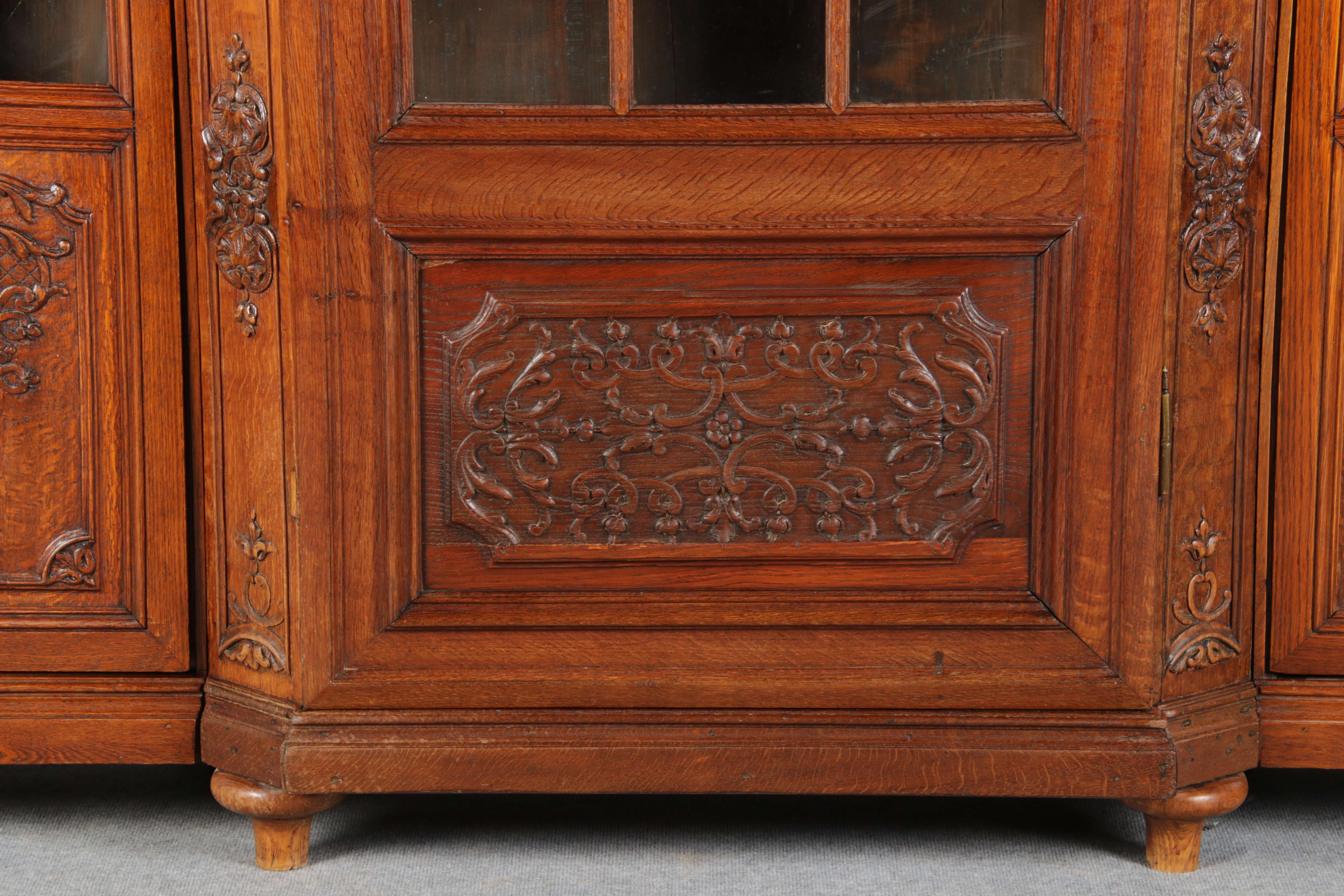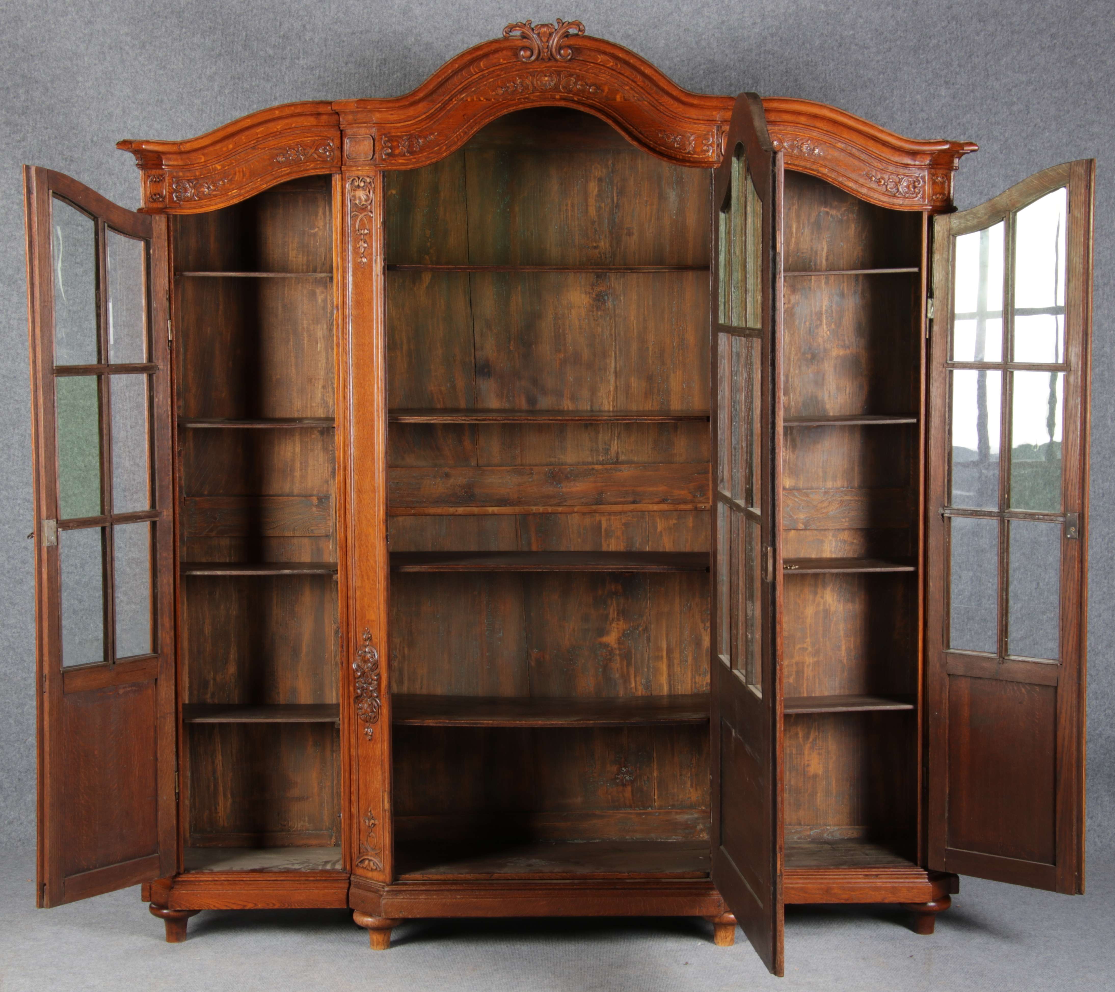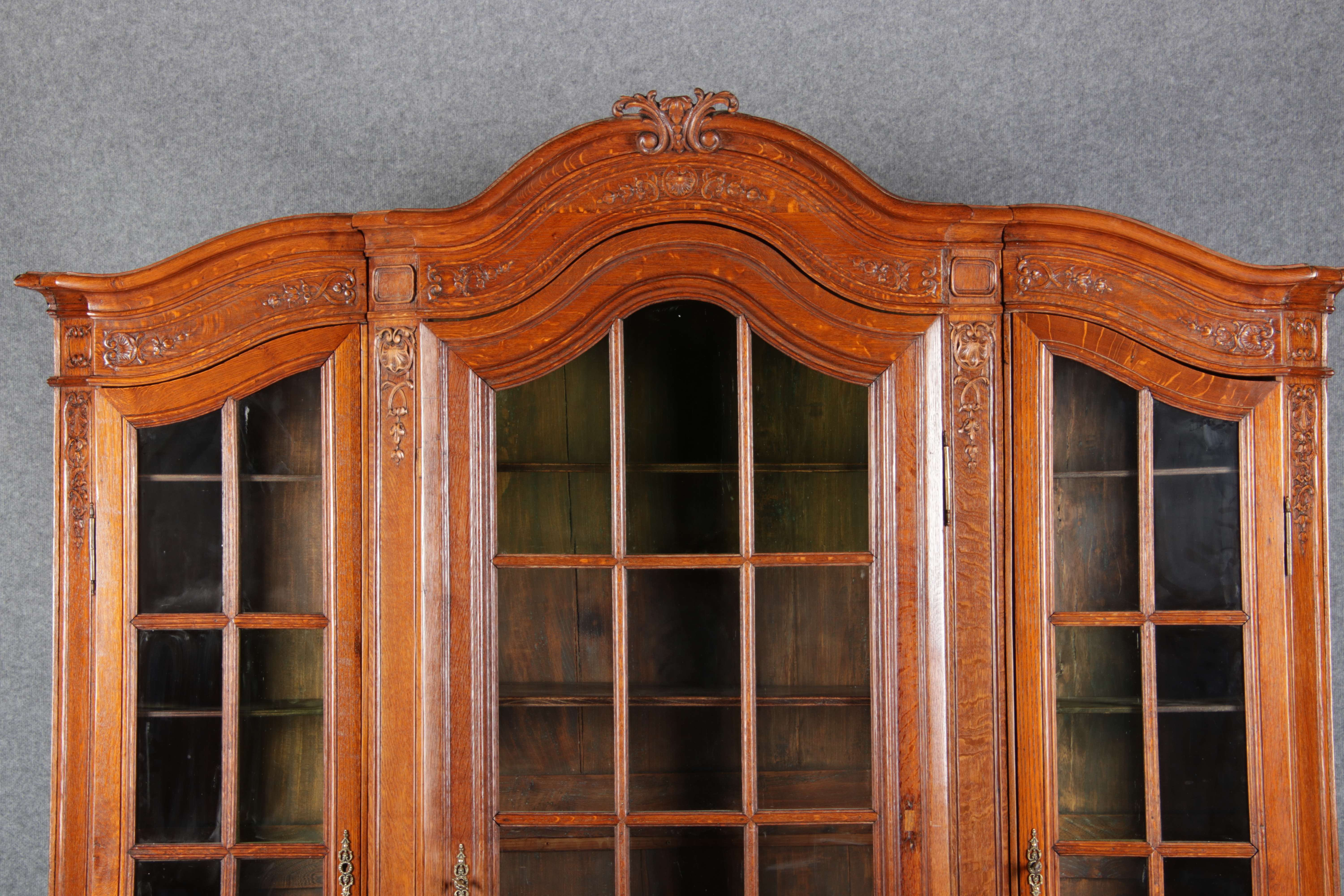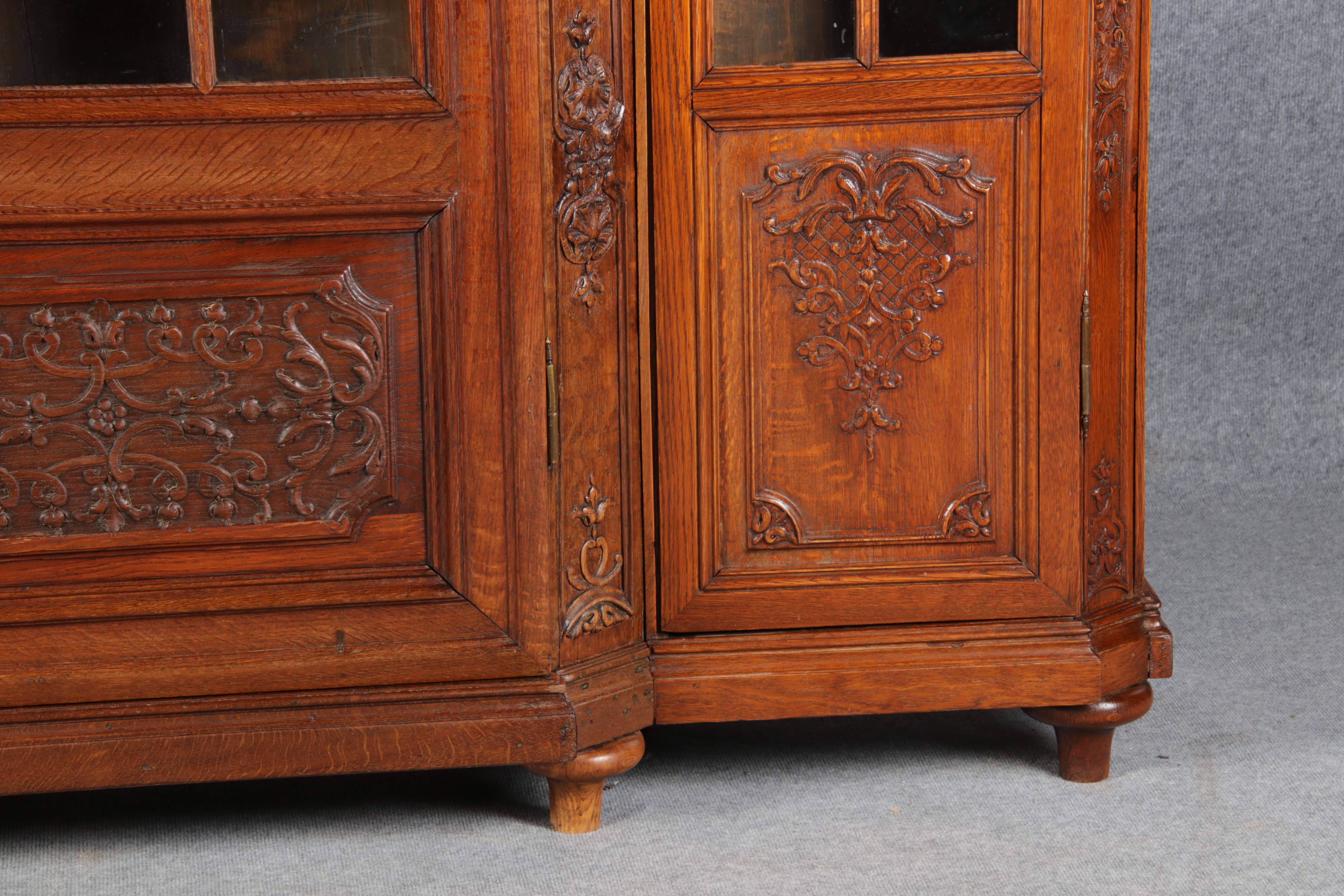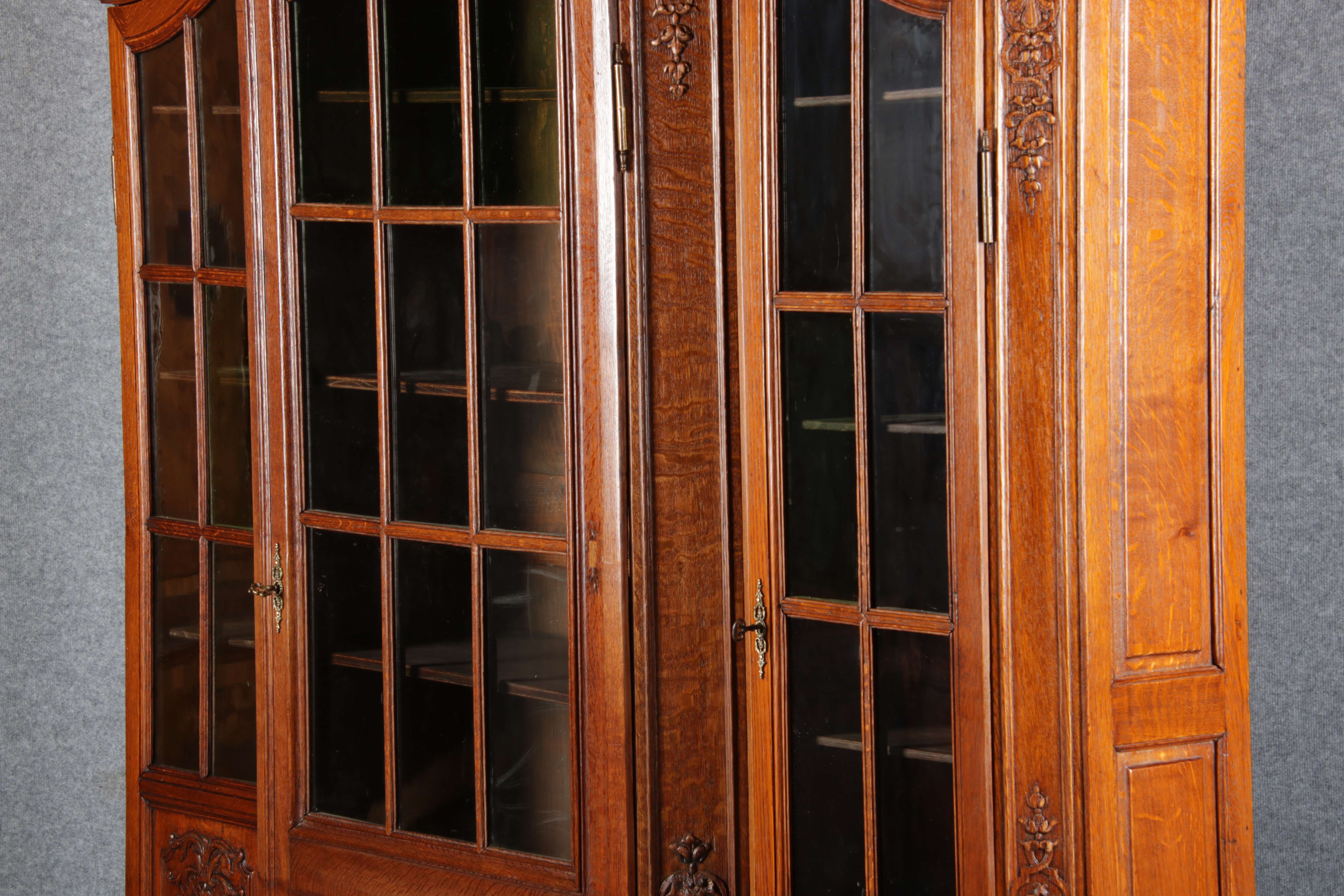 Antike Aachen Lüttich Barockvitrine drei türige Eiche 19 Jh. Schnitzereien |