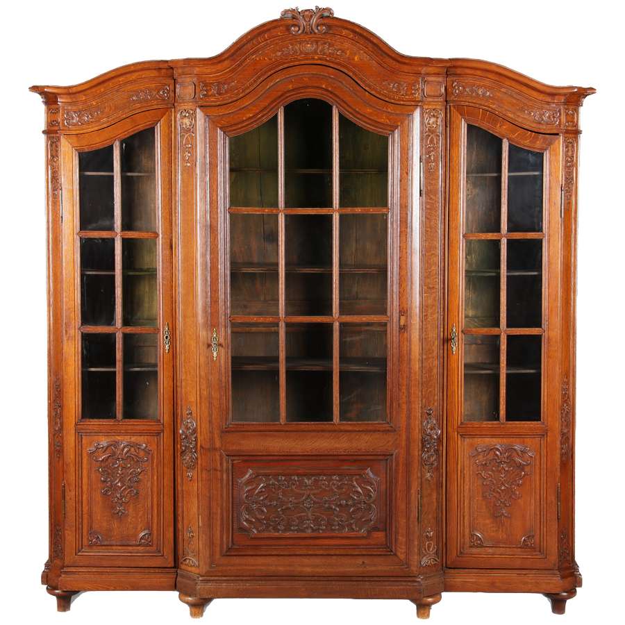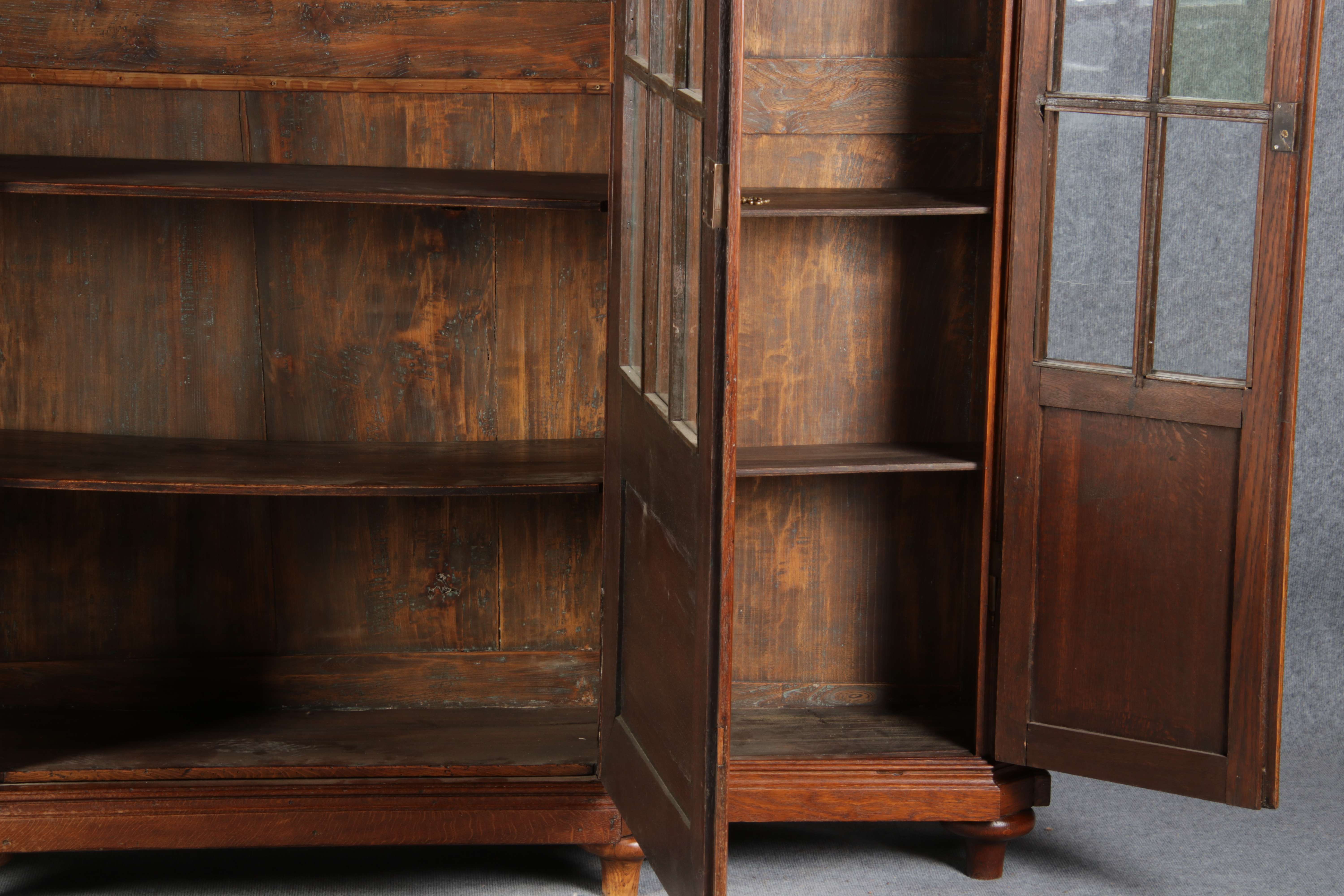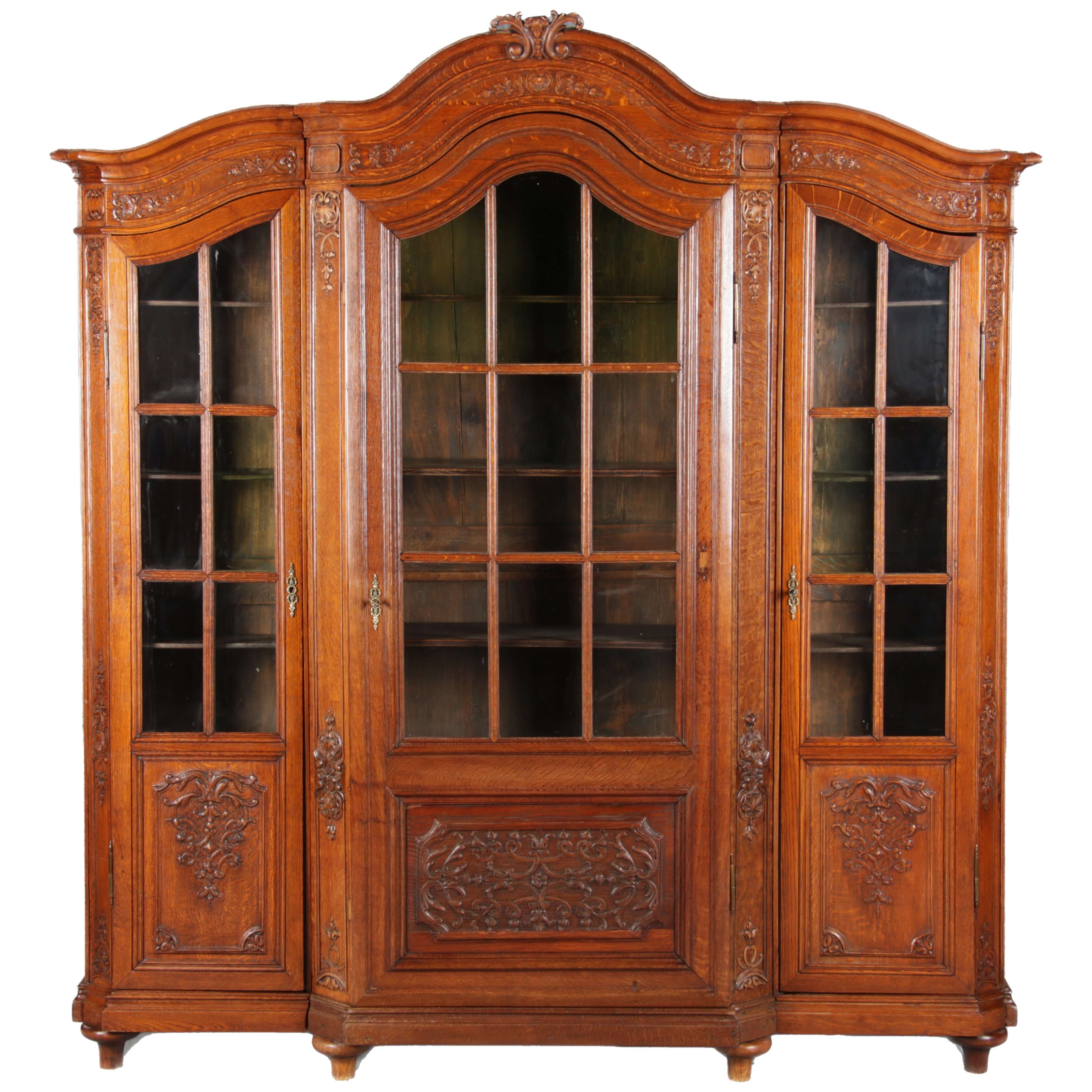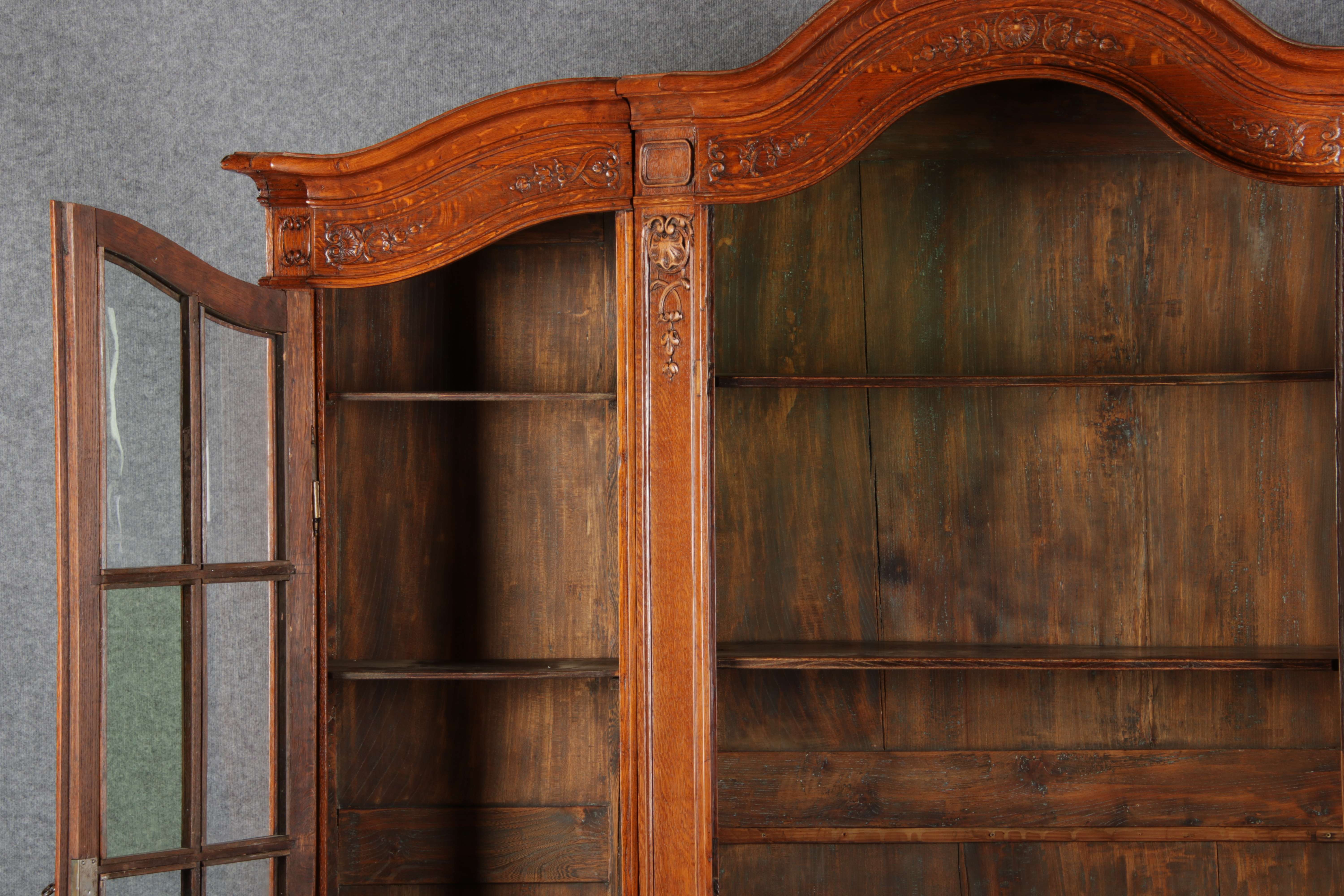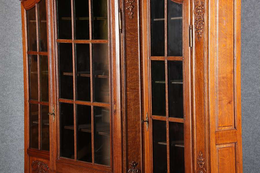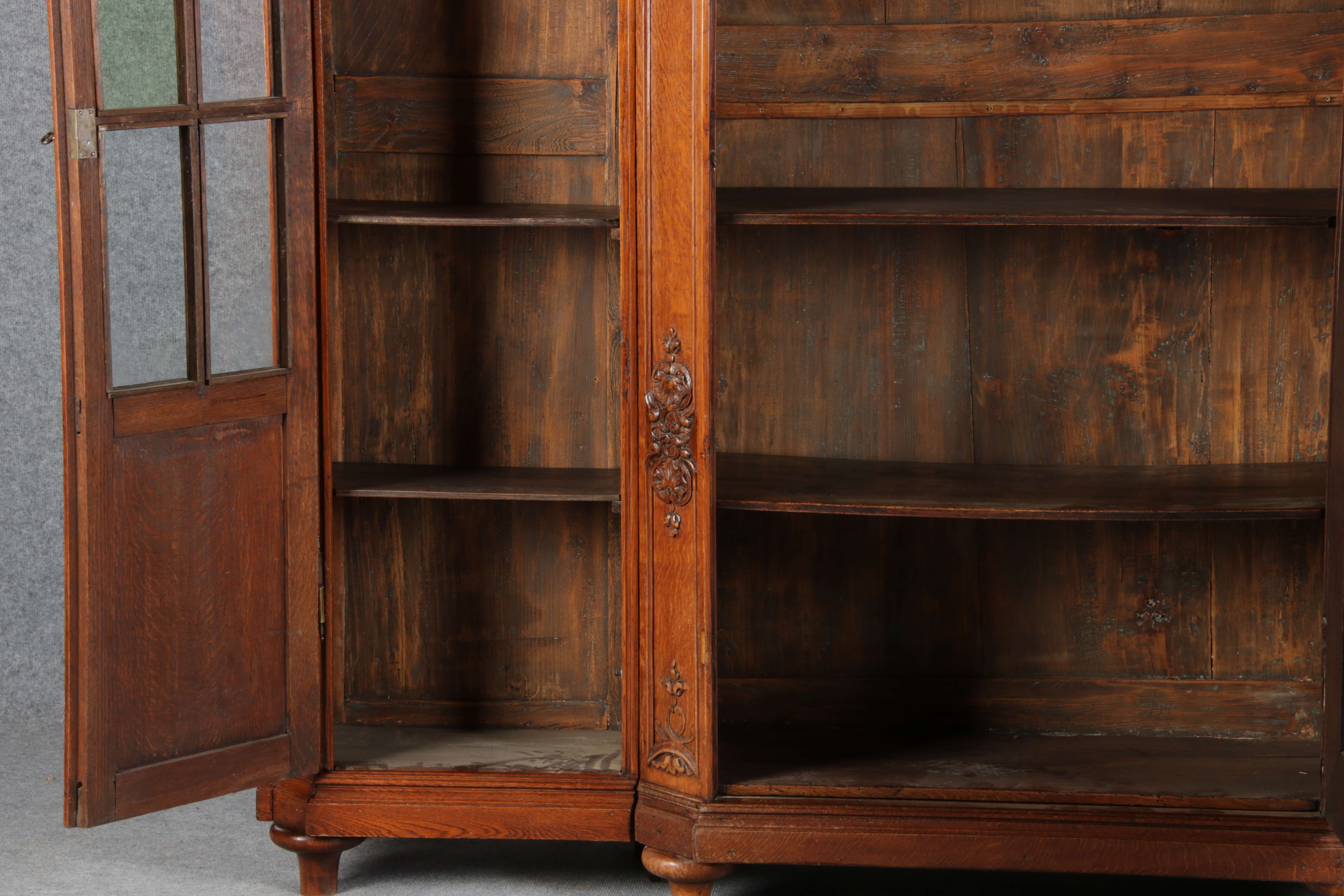 Antike Aachen Lüttich Barockvitrine drei türige Eiche 19 Jh. Schnitzereien |