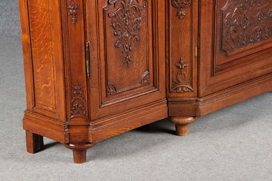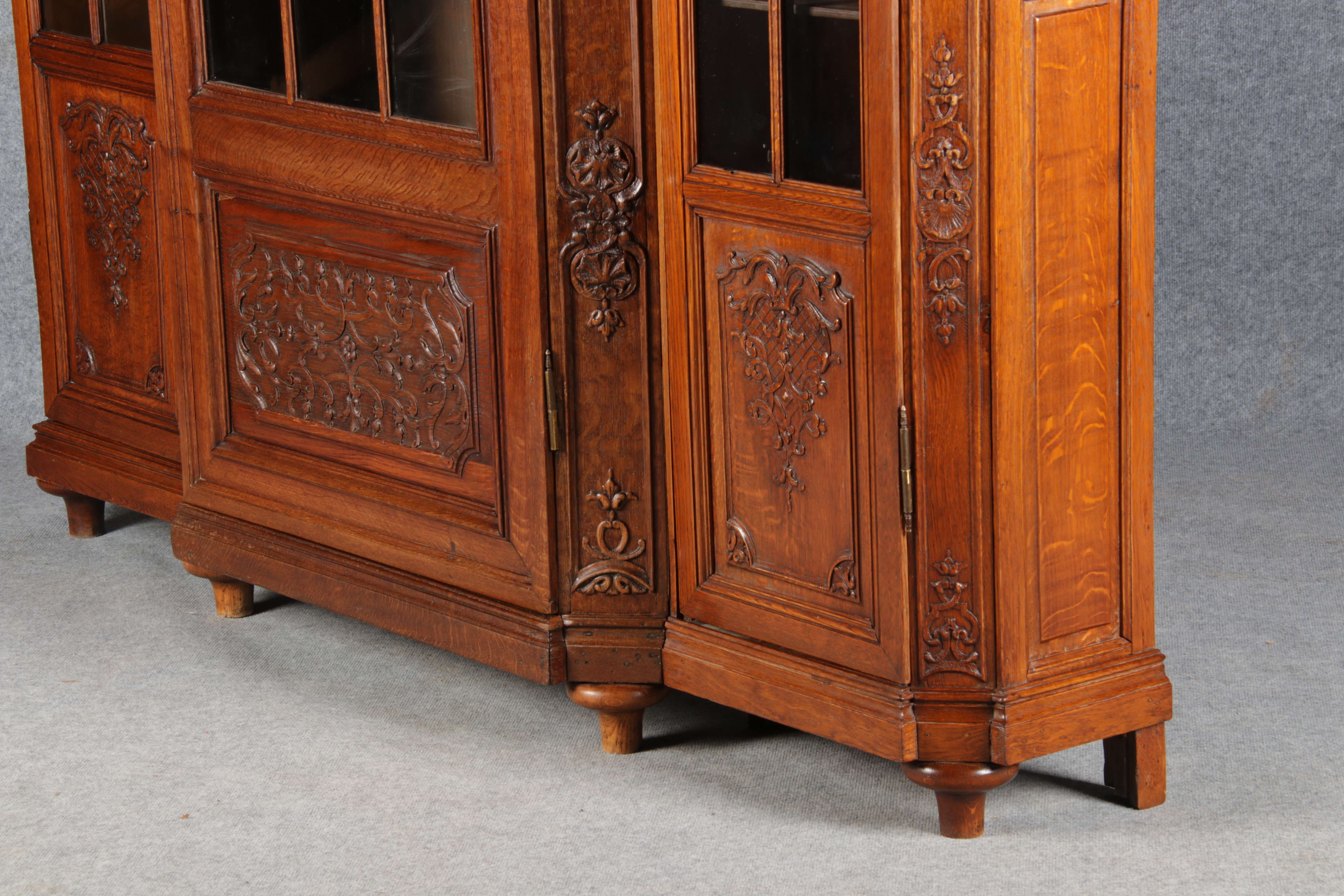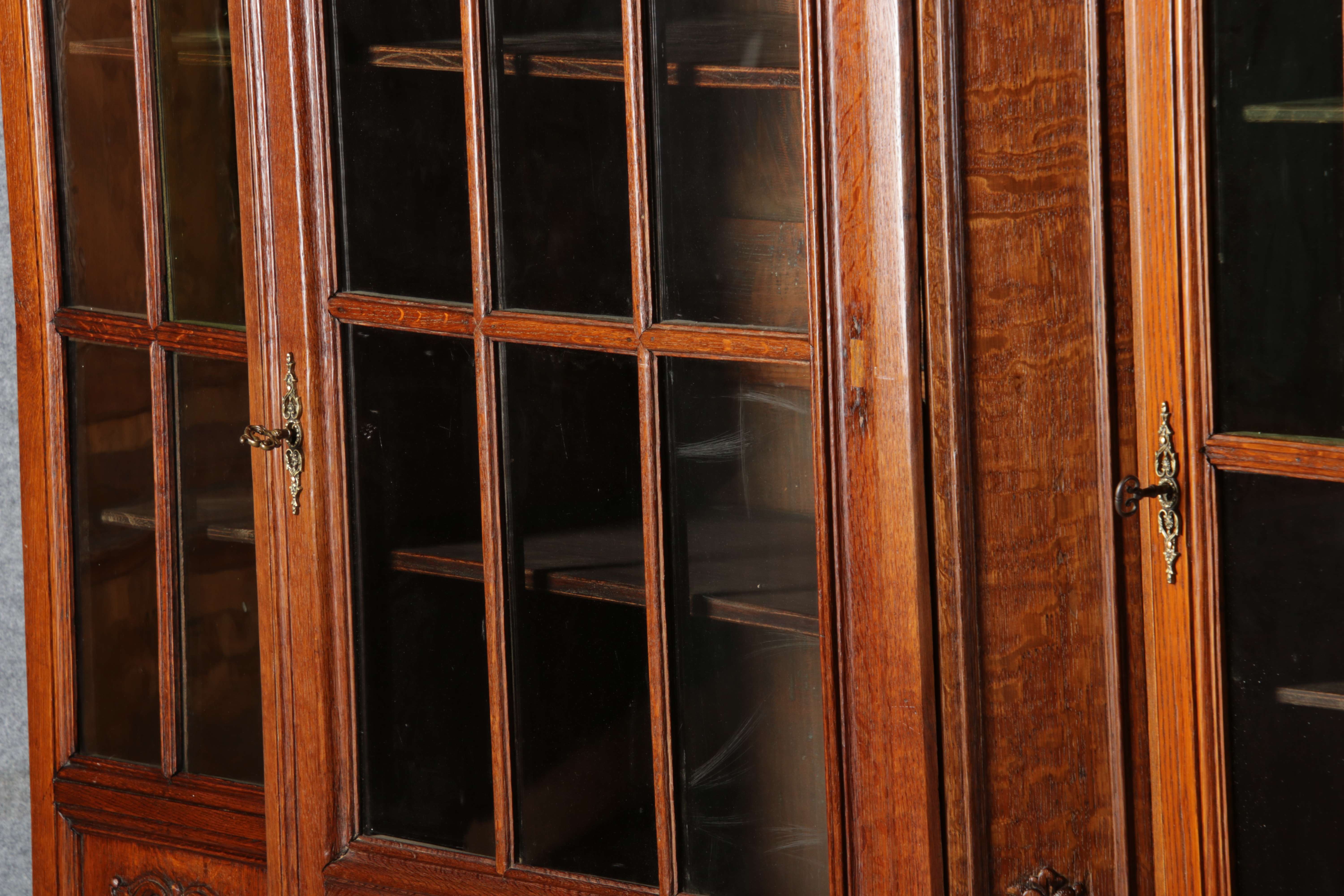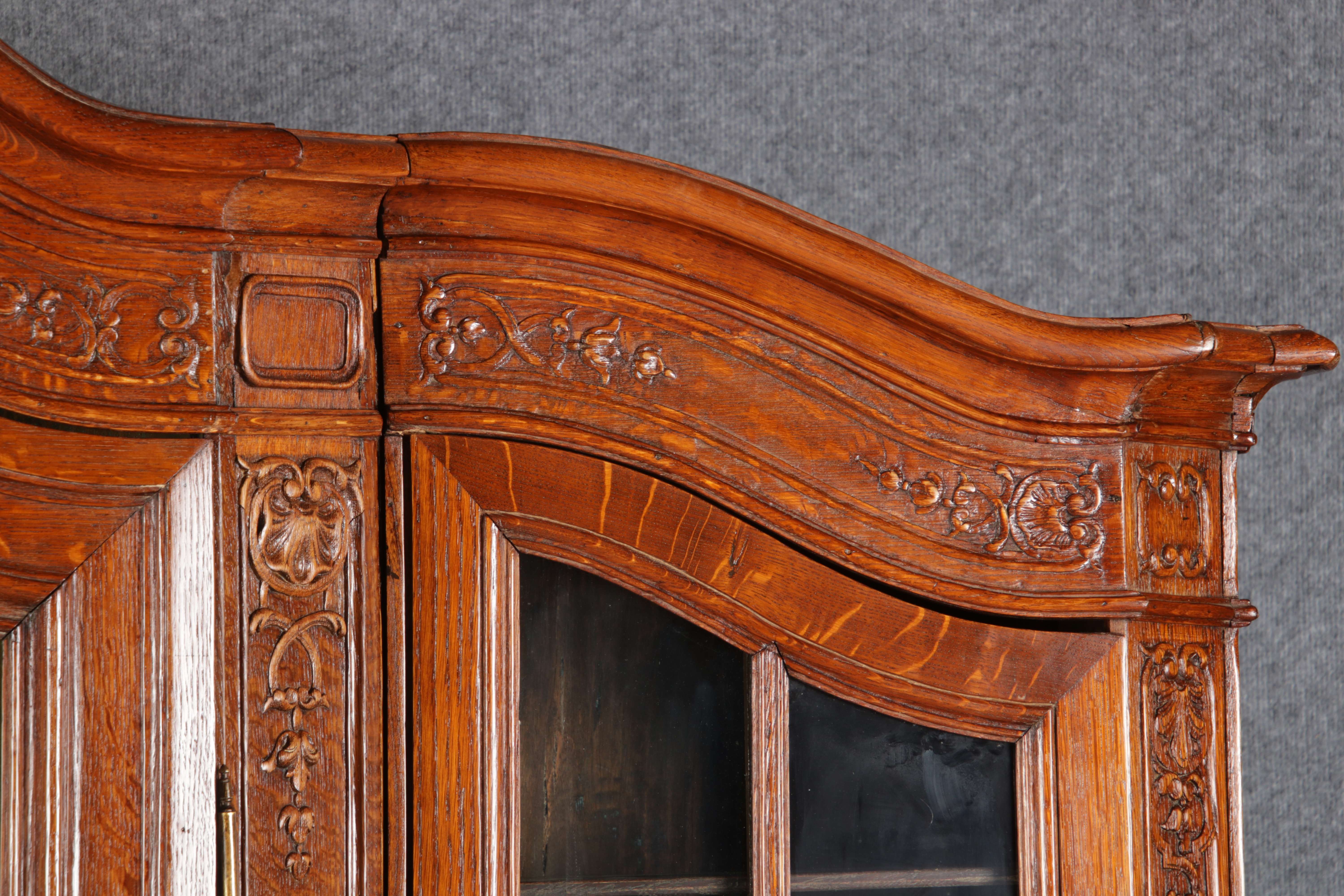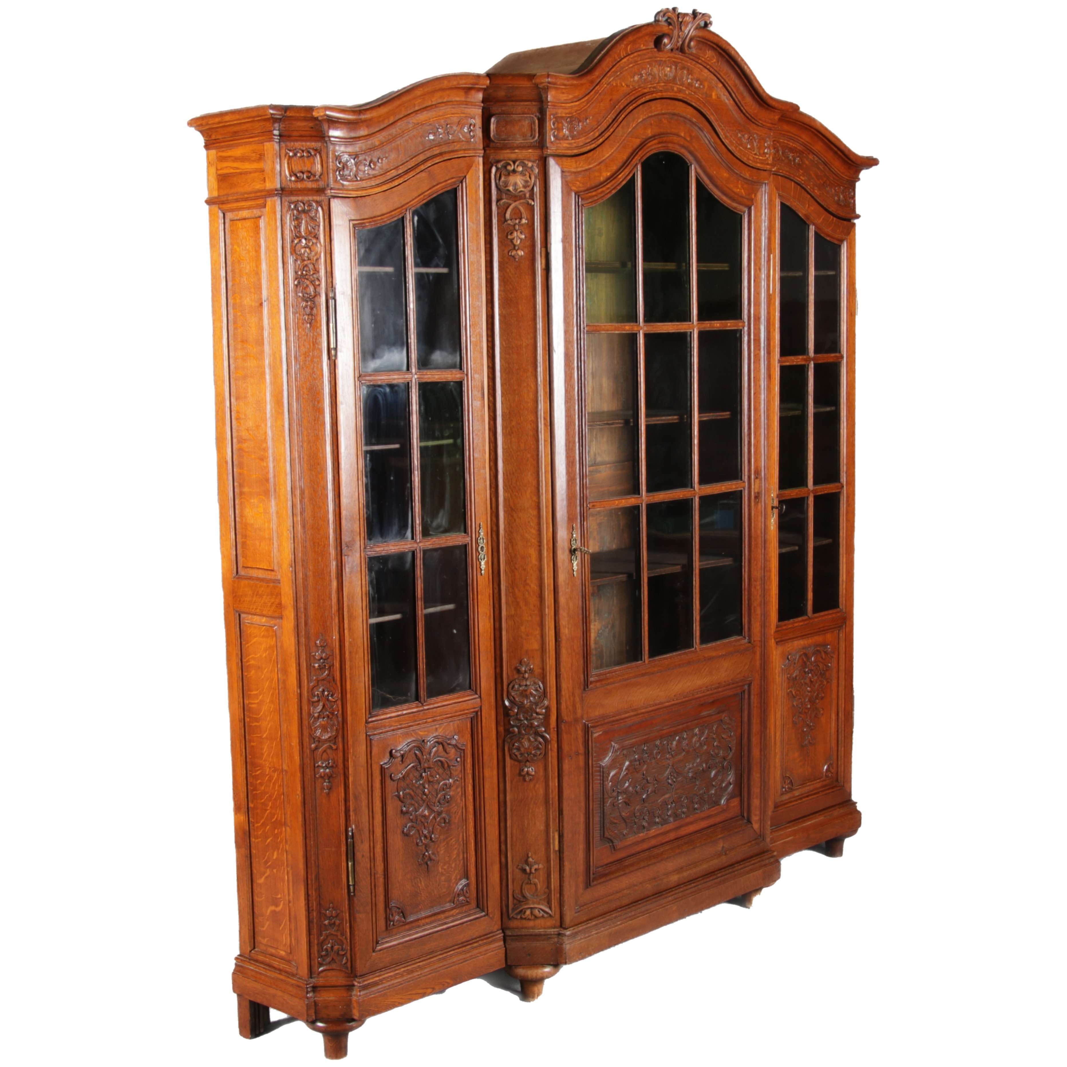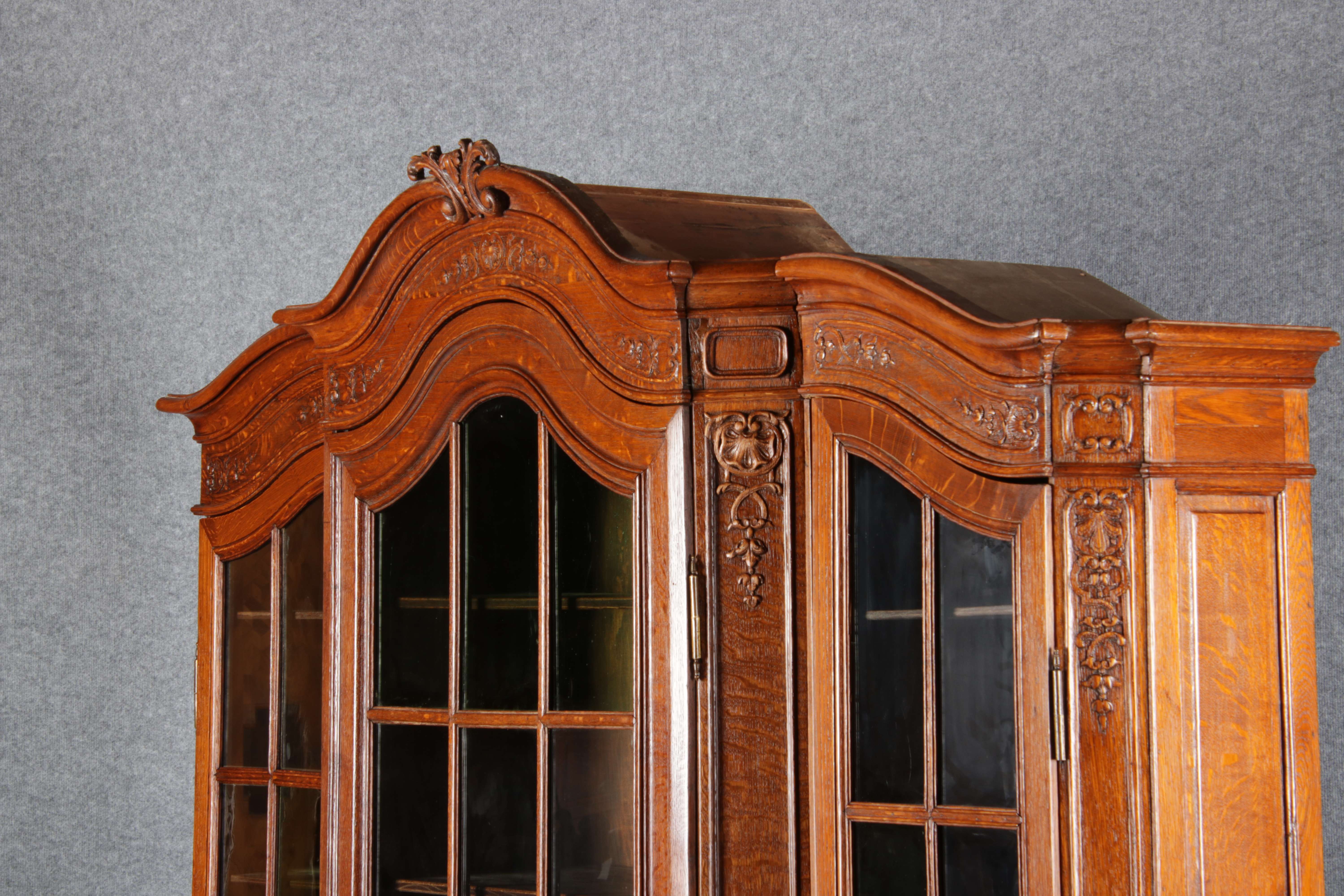 Antike Aachen Lüttich Barockvitrine drei türige Eiche 19 Jh. Schnitzereien |